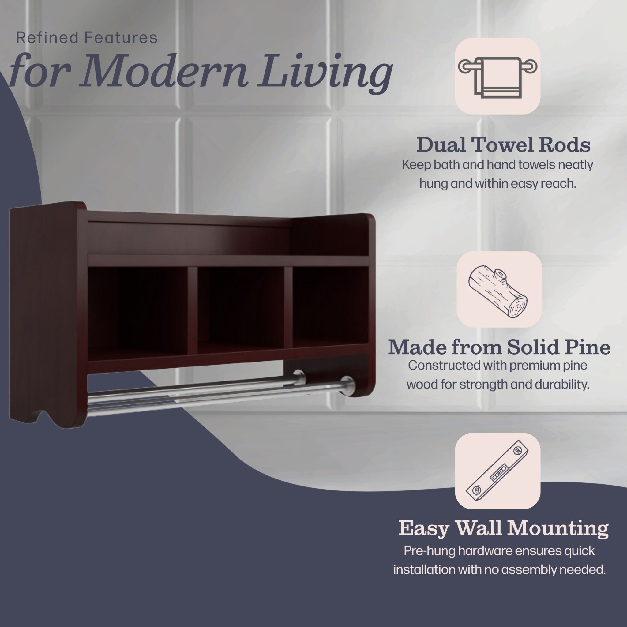 - [SPACE-SAVING ELEGANCE] The Logan Espresso Bath Storage Shelf includes a top shelf and three cubbies, plus two towel rods, perfect for organizing toiletries in compact spaces