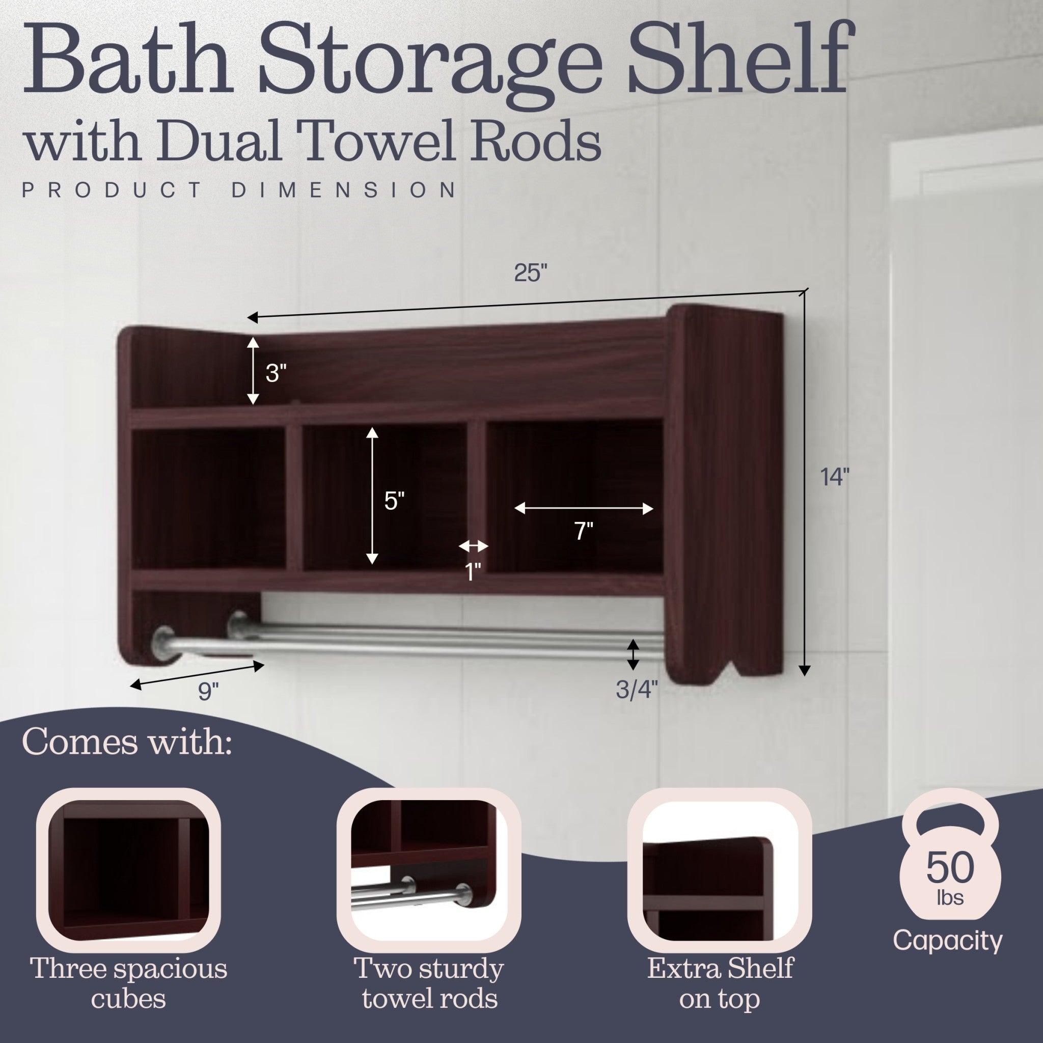 Update your bath with functionality and versatile design. Perfect for your bathroom this 25" wide shelf features a top shelf, three cubbies, and two towel rods. Store toiletries, stacked washcloths, rolled towels or anything you need to keep organized. The top shelf has a raised edge so items will stay in place. Multiple finish choices will blend seamlessly into any décor. No assembly required, just hang in place for an instant update.