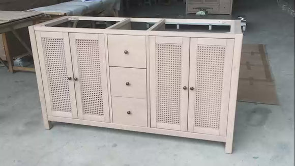 Update your bathroom with the detailed elegance of the Lucca 60” Bathroom Sink Cabinet by Alaterre Furniture. Constructed from high-quality rubber wood and composite wood, this bathroom under sink cabinet features soft-close doors and drawers, 2 cabinets, 3 small drawers, attractive hardware, and adjustable height levelers for stable installation. The modern bathroom vanity accommodates a 60-inch-wide by 21.5-inch-deep top with 2 set sink basin; the top and sink are not included, allowing you to choose the style that best matches your bathroom decor.