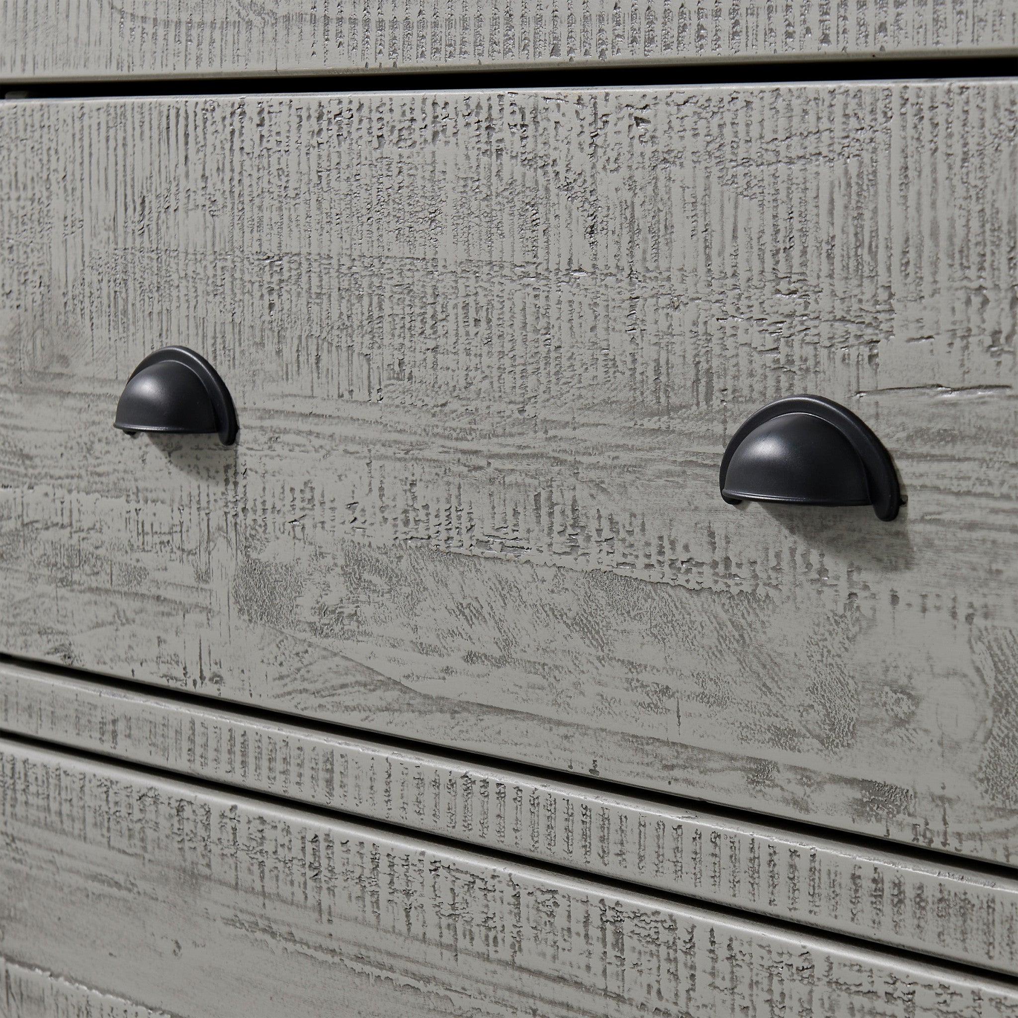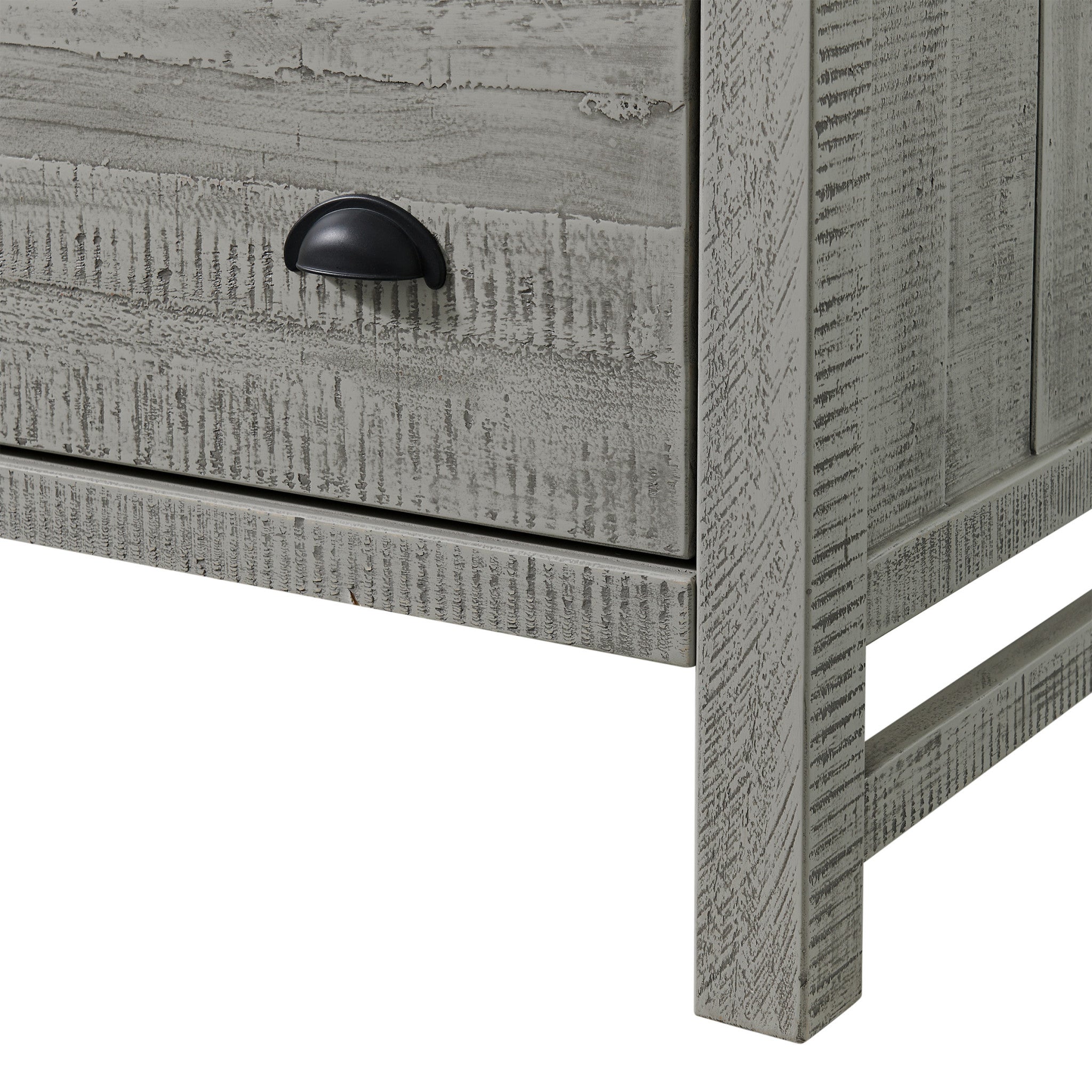 - Color: Driftwood Gray Finish with Black Pulls