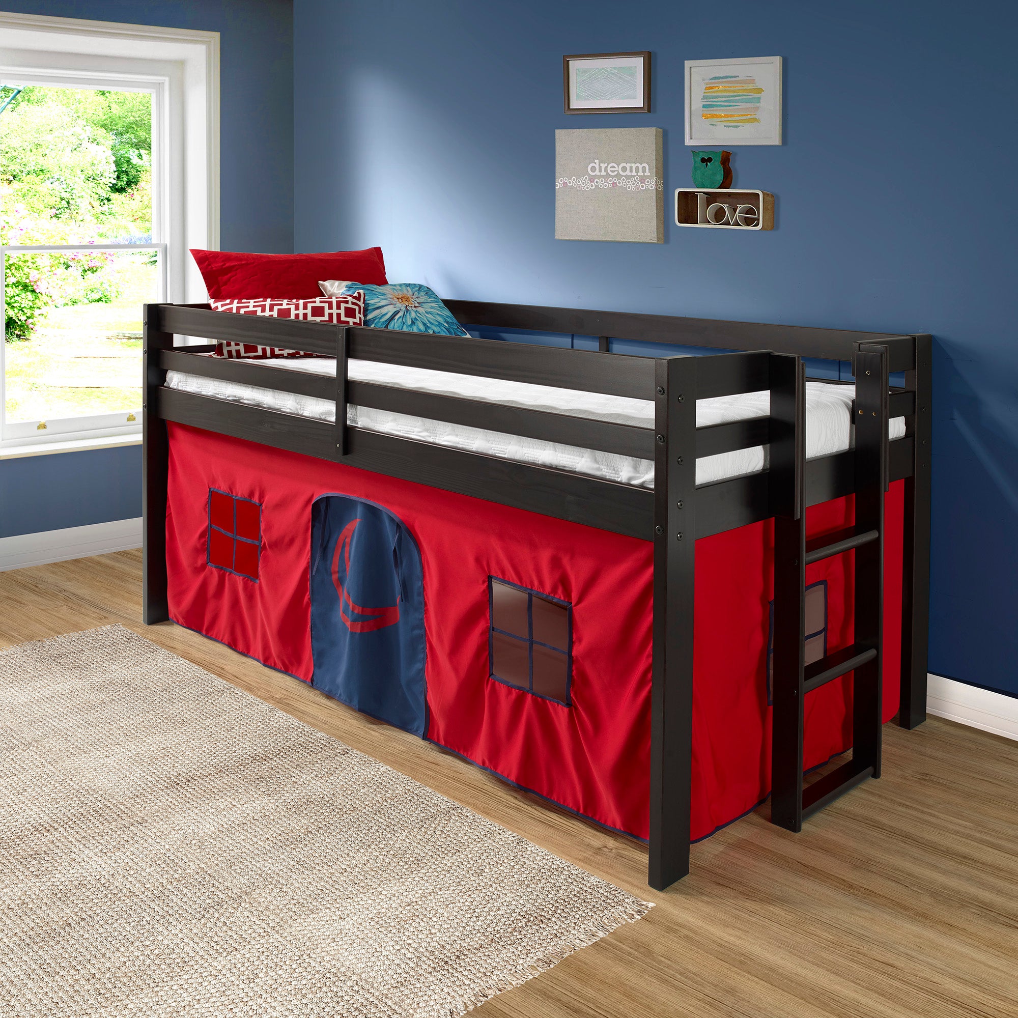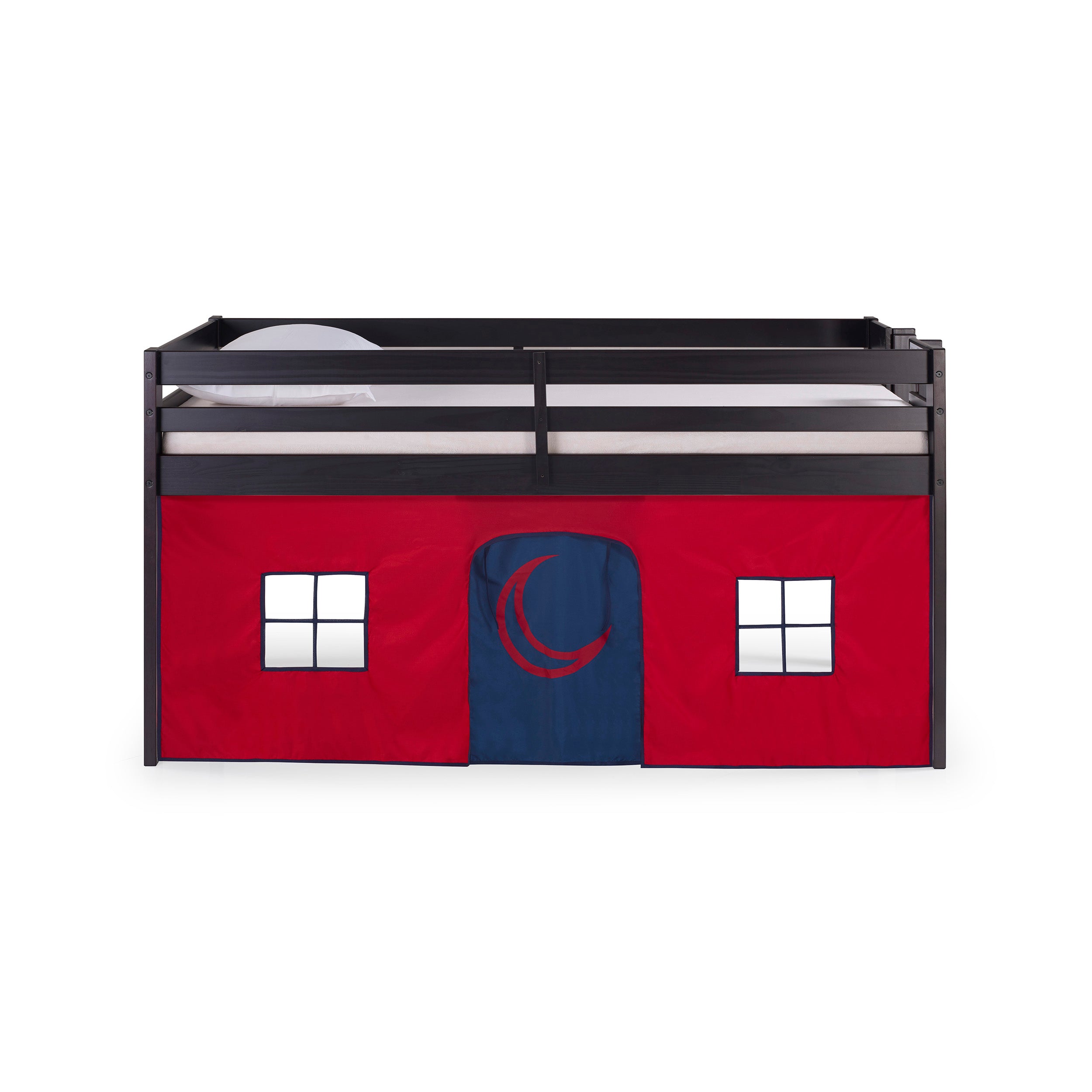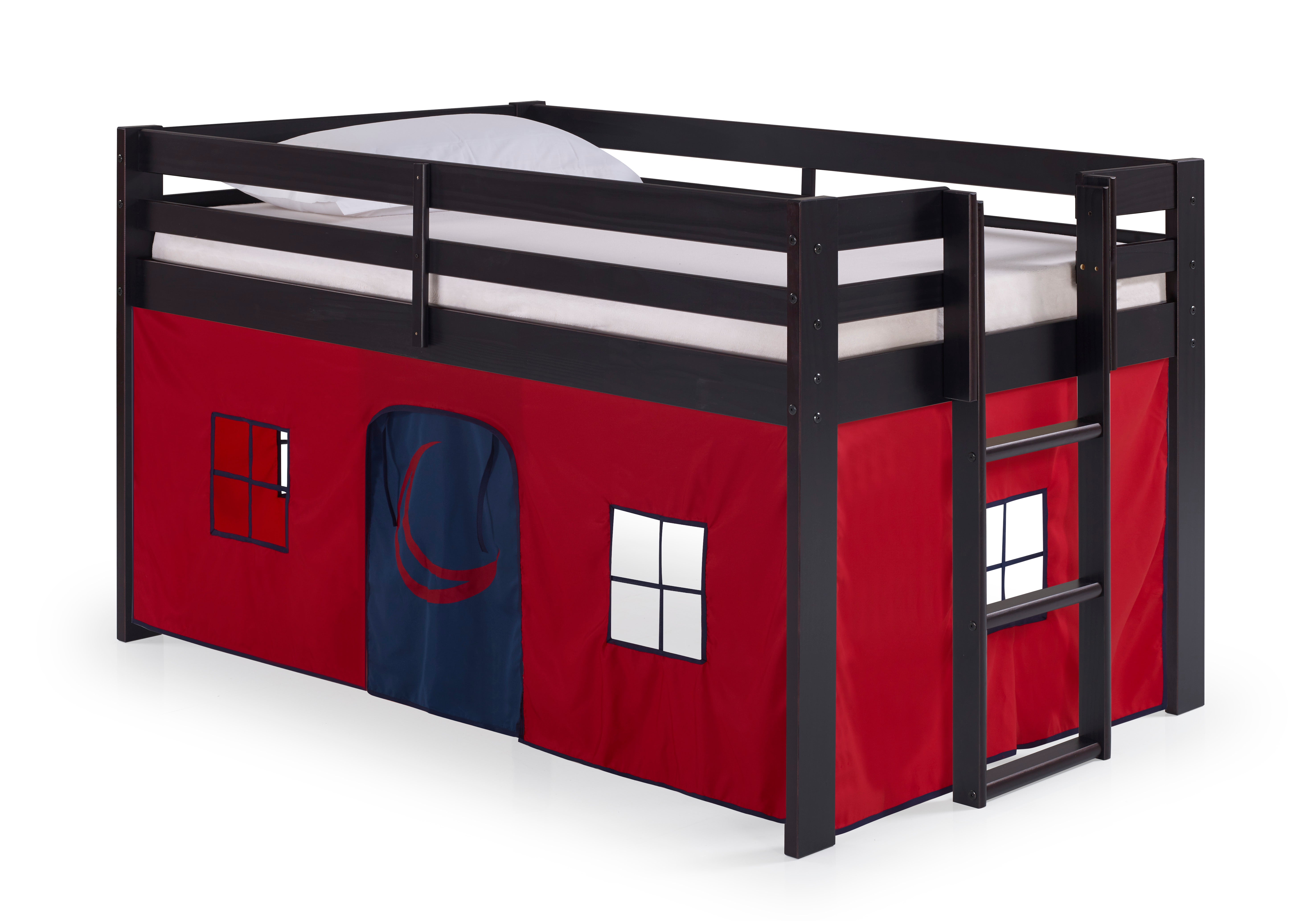 Jasper Twin Junior Loft Bed, Espresso Frame and Red/Blue Bottom Playhouse Tent