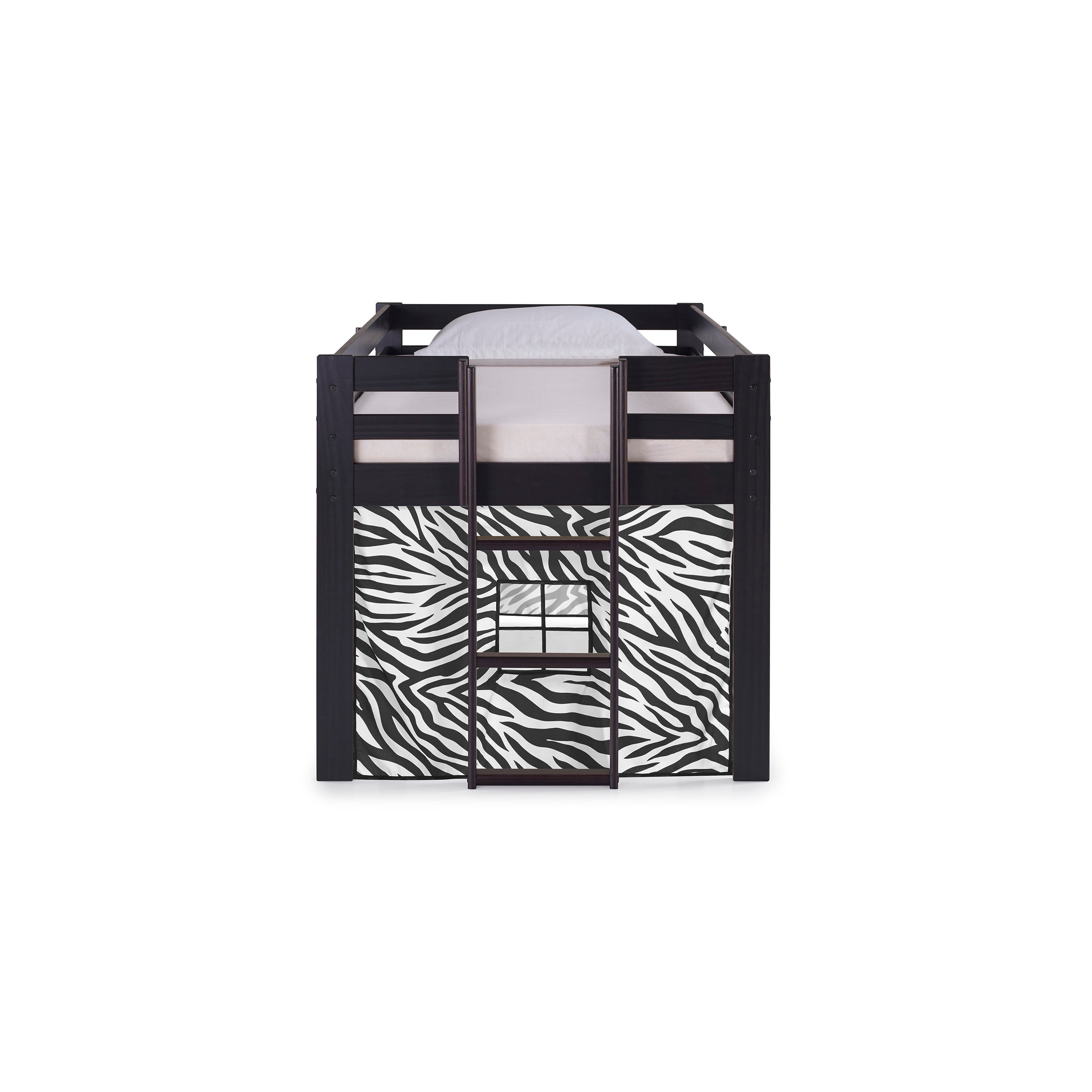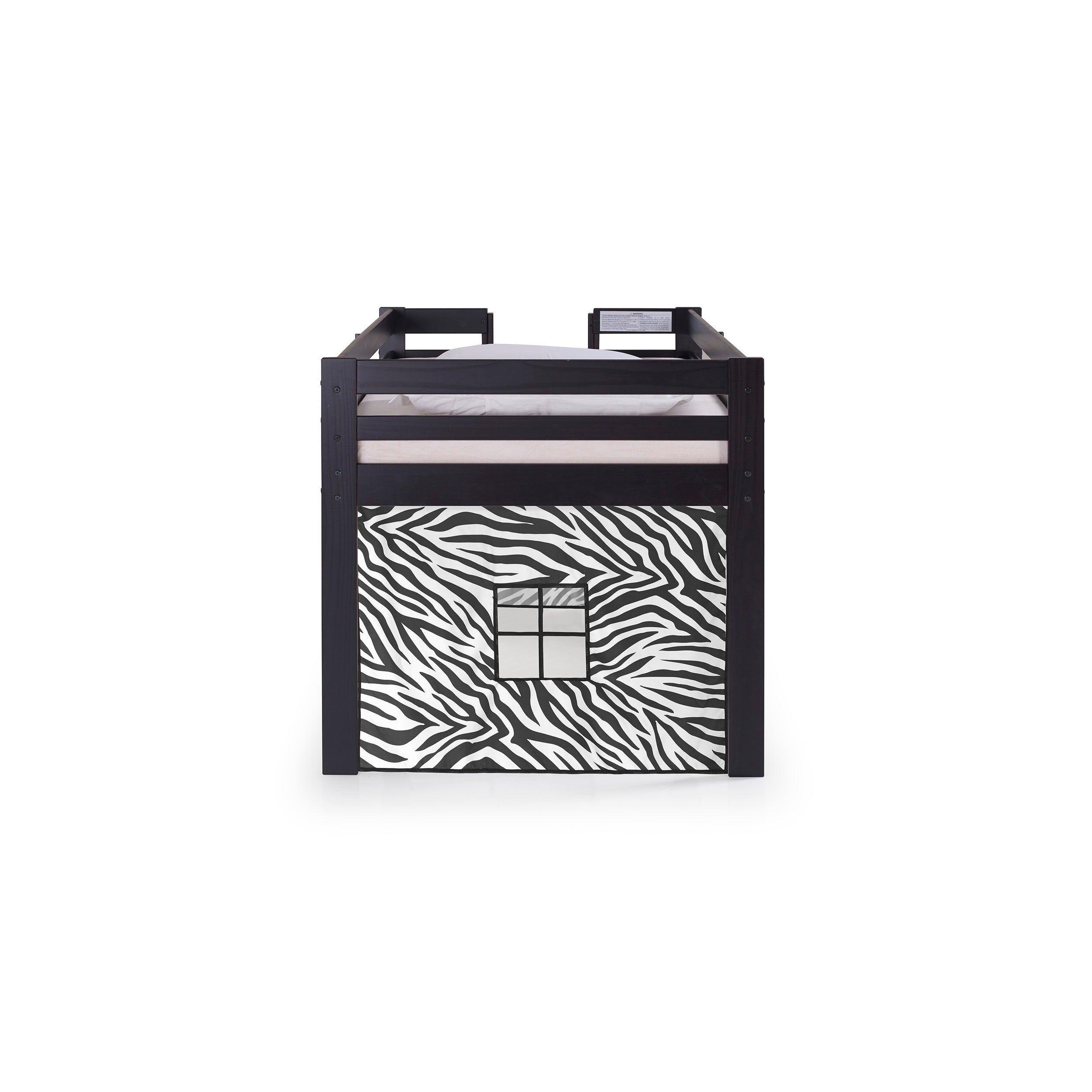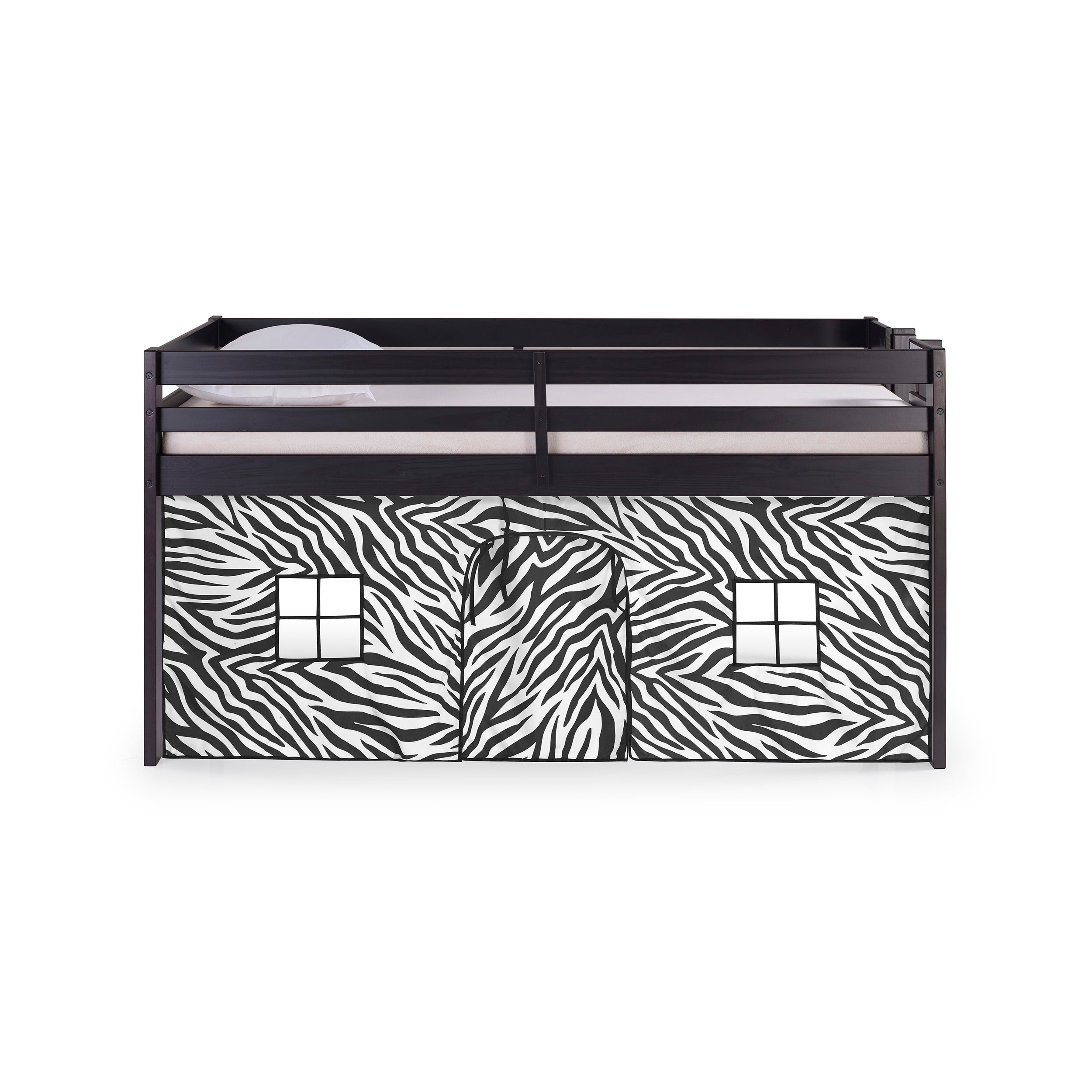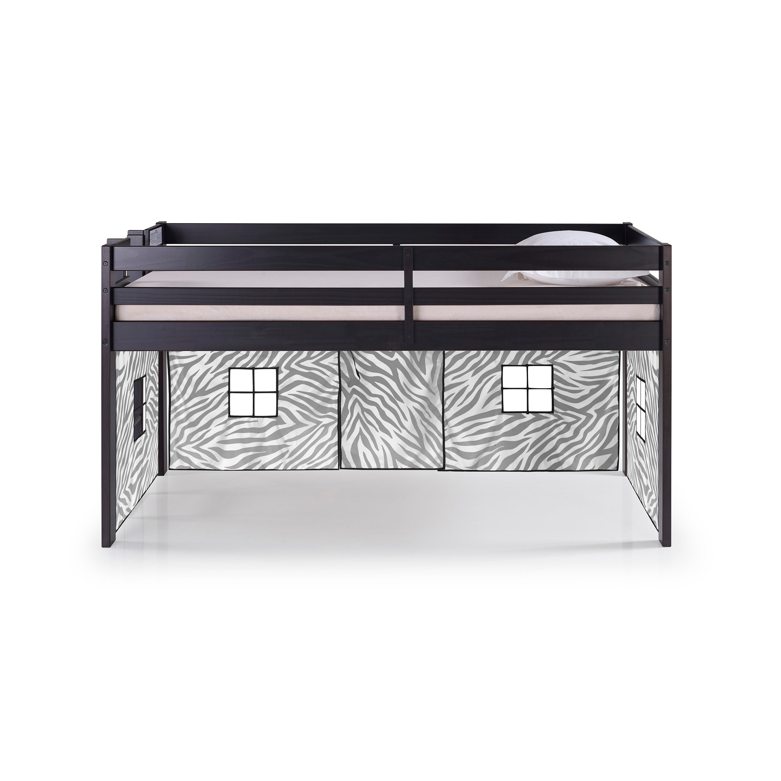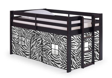 Jasper Twin Junior Loft Bed, Espresso Frame and Black/White Bottom Playhouse Tent