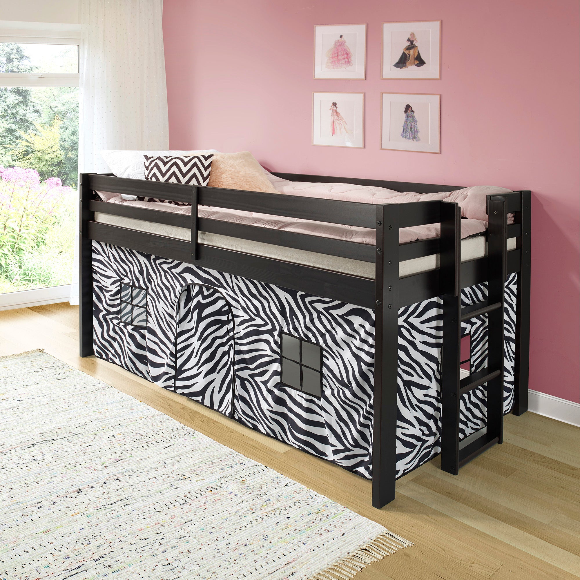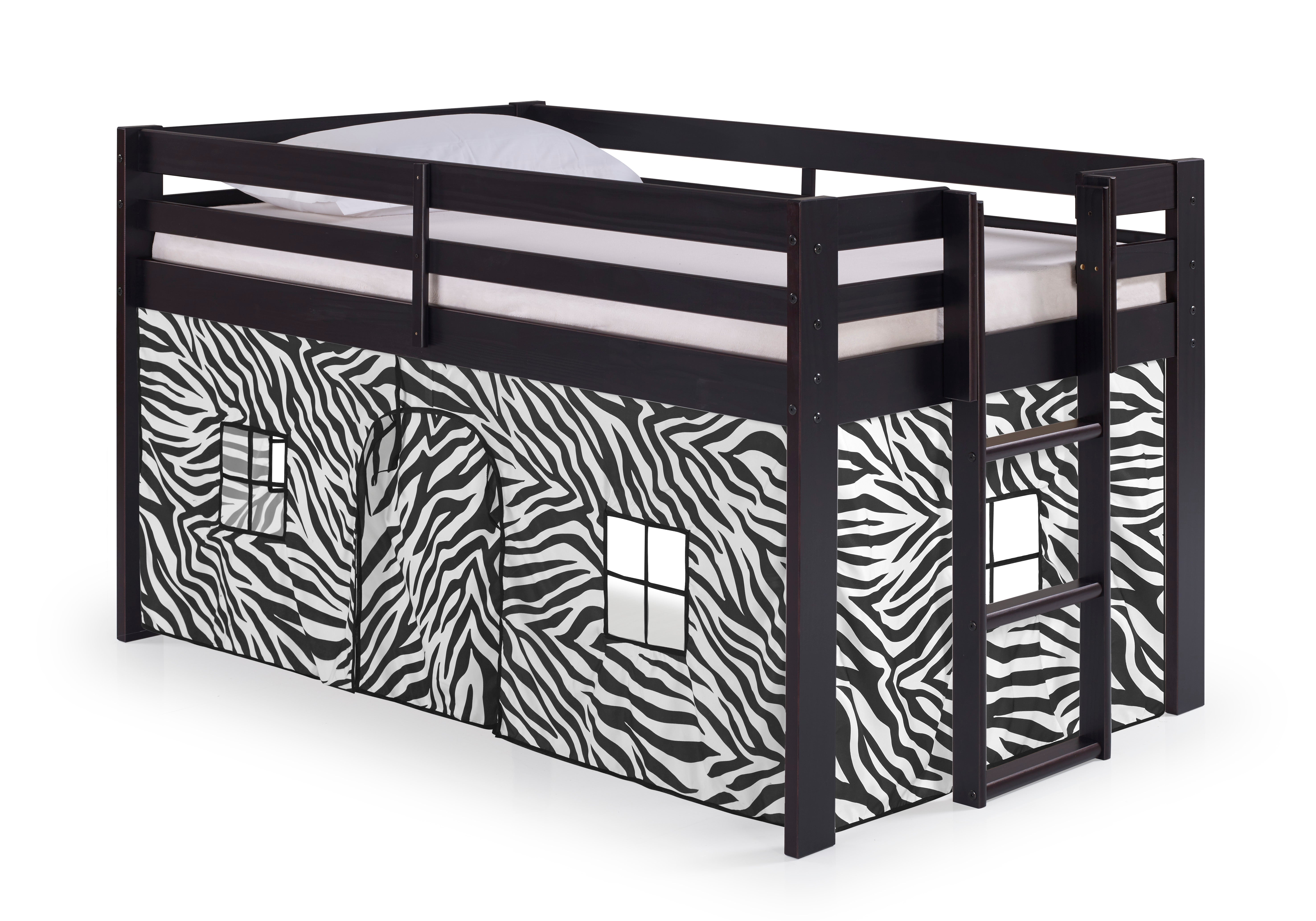 - [SPACE-SAVING DESIGN] The Jasper Twin Junior Loft Bed features a compact frame and guard rails, with a zebra tent for fun and storage