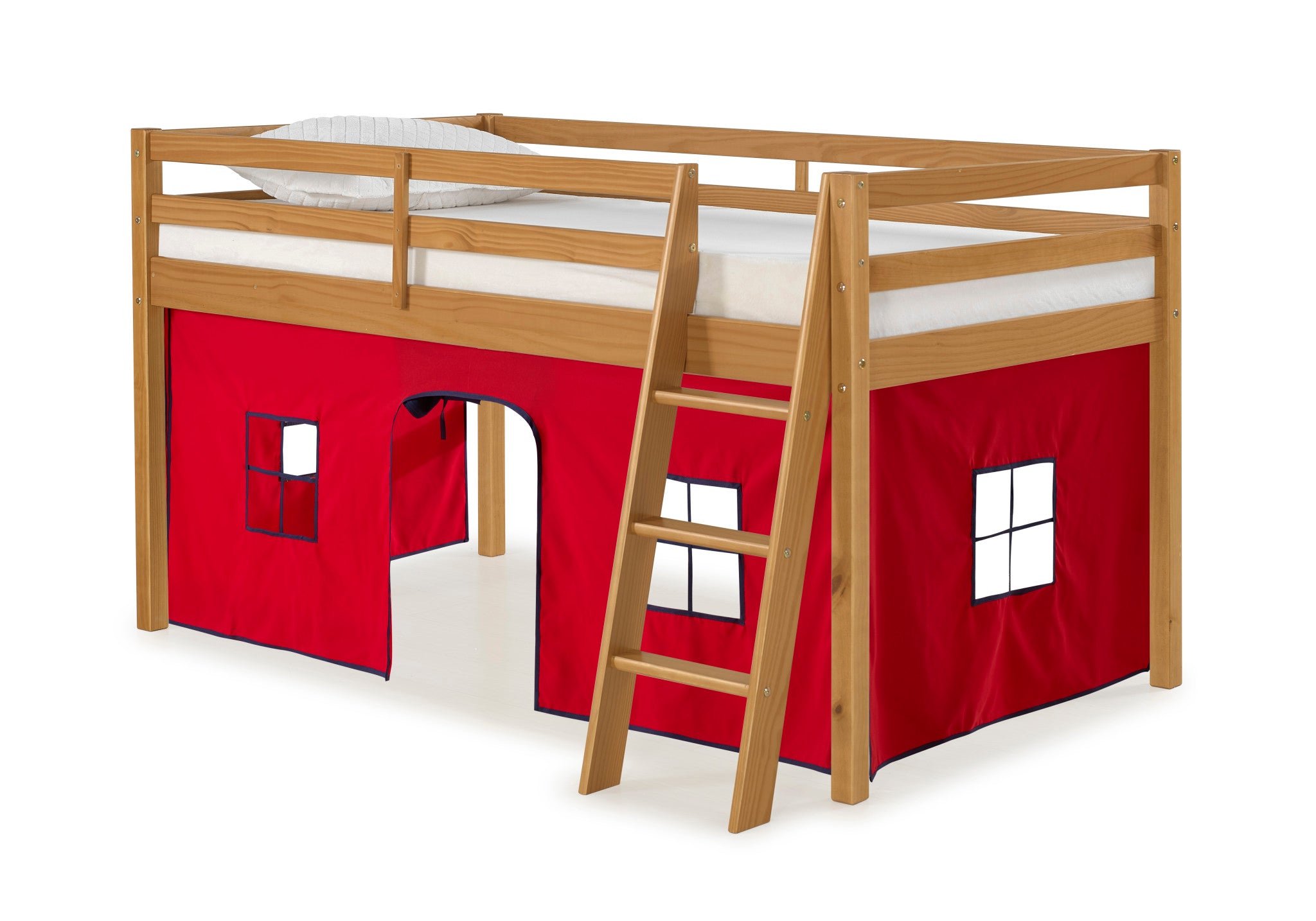 Roxy Junior Loft with Playhouse Tent gives your child a fun place to play, sleep and dream. The under bed playhouse area is a great spot to curl up and read a book, set up house, be the queen of their castle or the superhero that saves the day. The tent is machine washable and removable for easy maintenance. Each bed has guardrails on all sides for safety. For added versatility the included ladder can be assembled on either side of the bed. This is the perfect addition to any child's room.