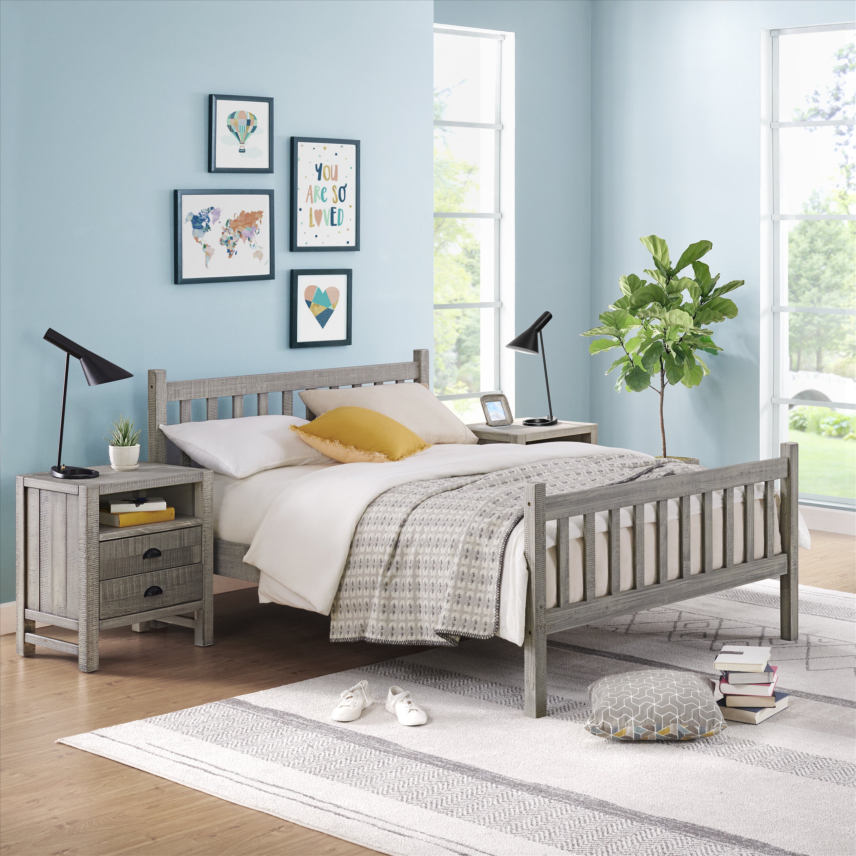 - [STYLISH & DURABLE CONSTRUCTION] Windsor 3-Piece Bedroom Set includes a full bed and nightstands with a rustic gray finish that enhances the natural wood grain, creating a durable and stylish addition to any bedroom decor