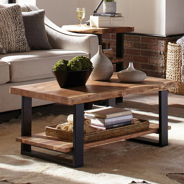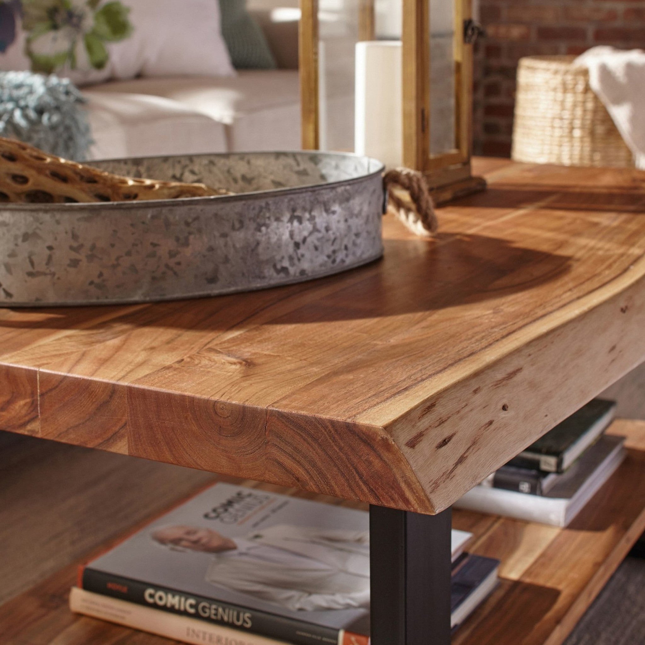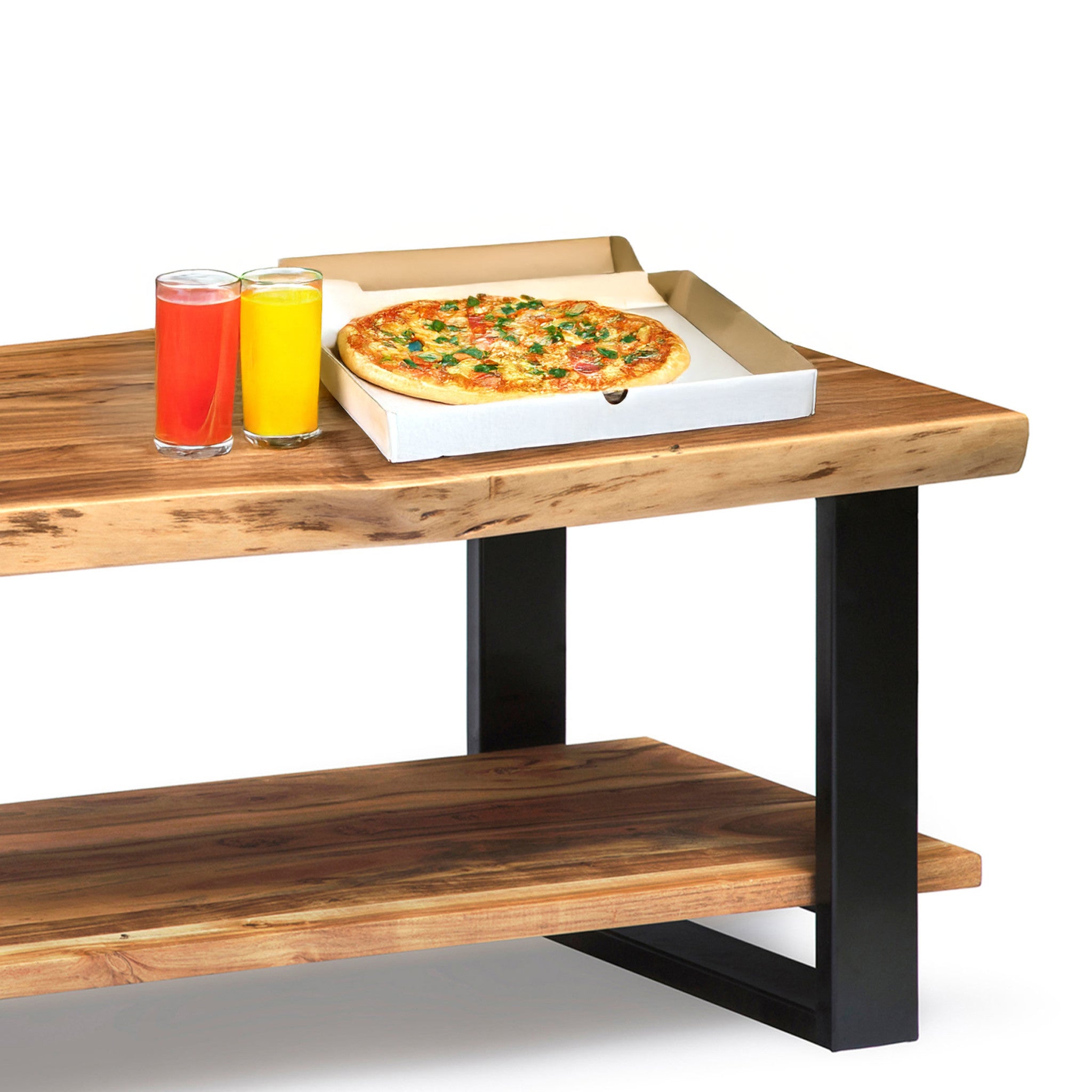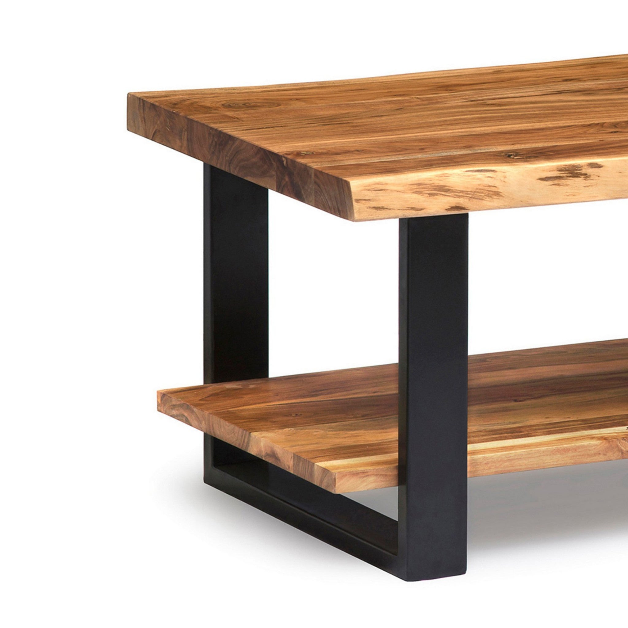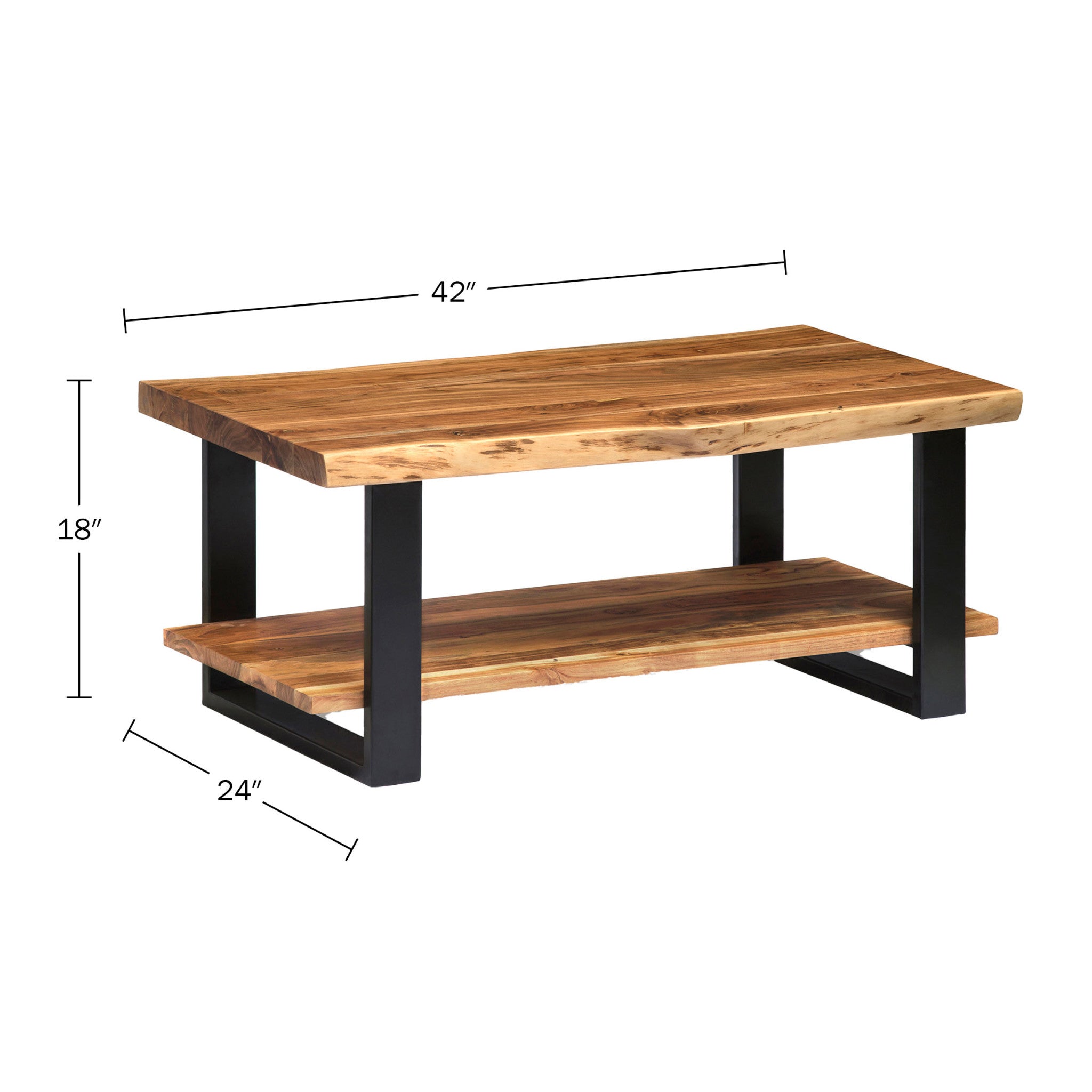 Alpine is gorgeous natural Acacia wood with live edge and metal strap legs; an industrial modern update for your living room. Each tabletop is unique; no two tops will be exactly alike. Constructed of natural acacia wood. Each of our live edge products includes nylon floor protectors. The knots and cracks add to the wood's character. A clear natural finish enhances the beautiful features in each piece of wood.