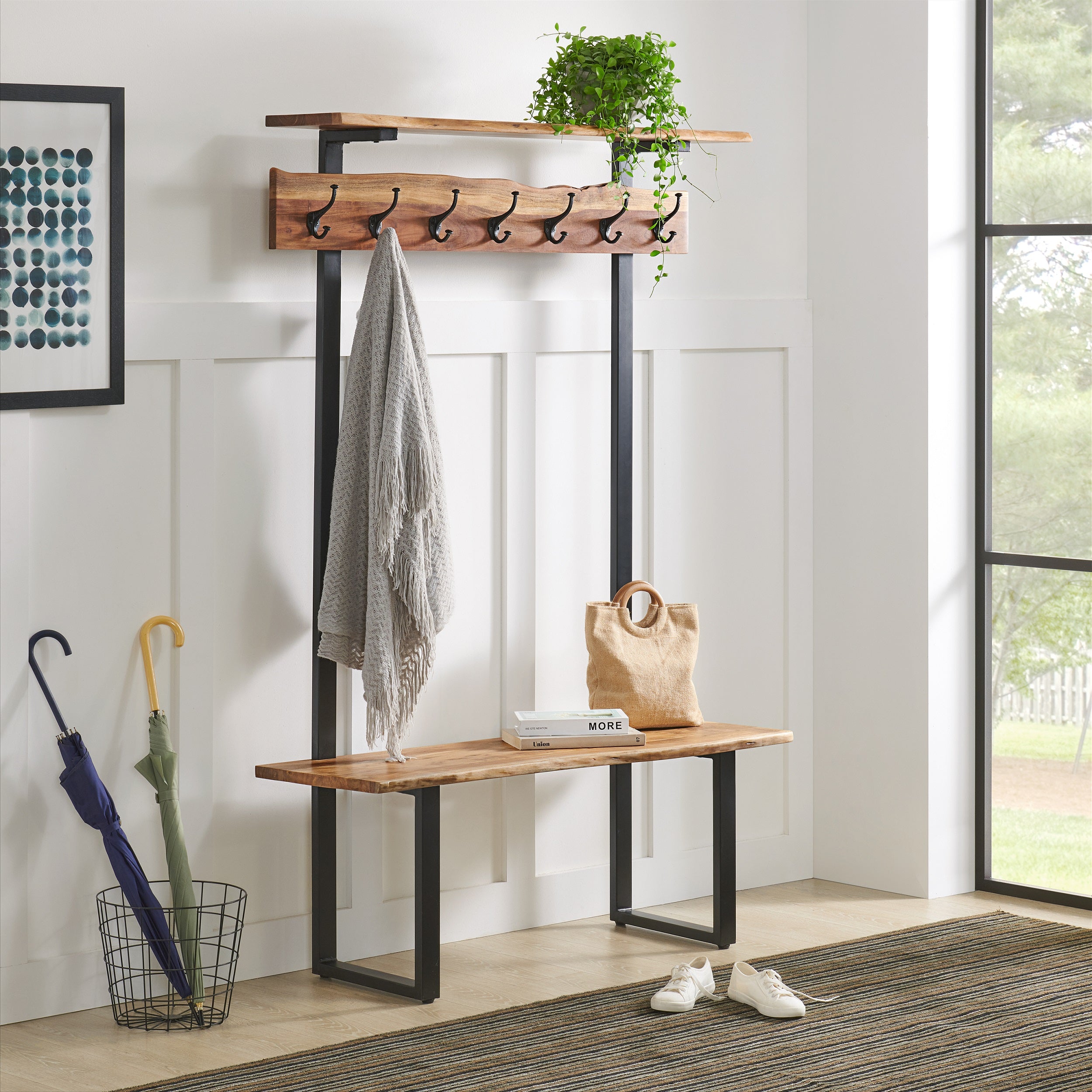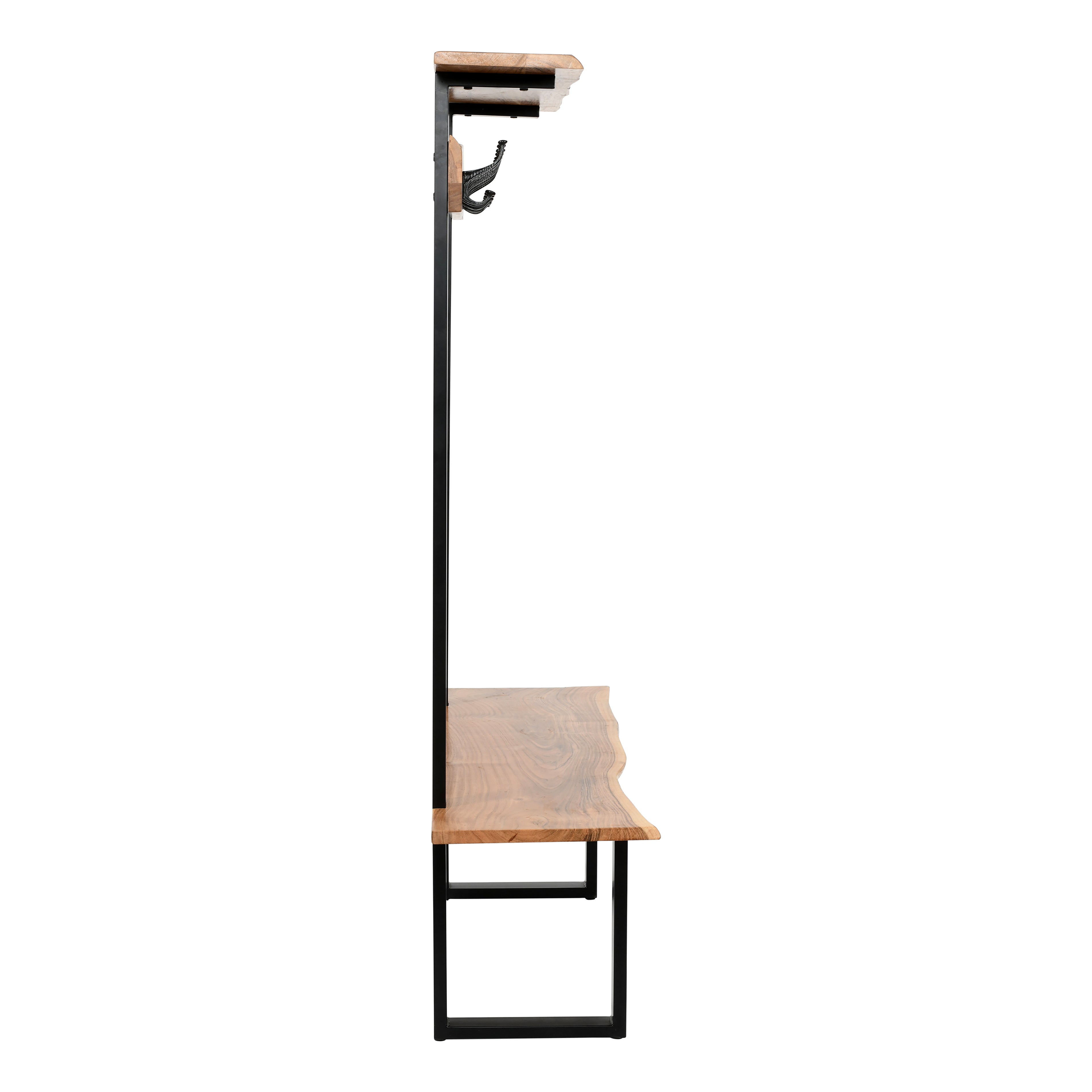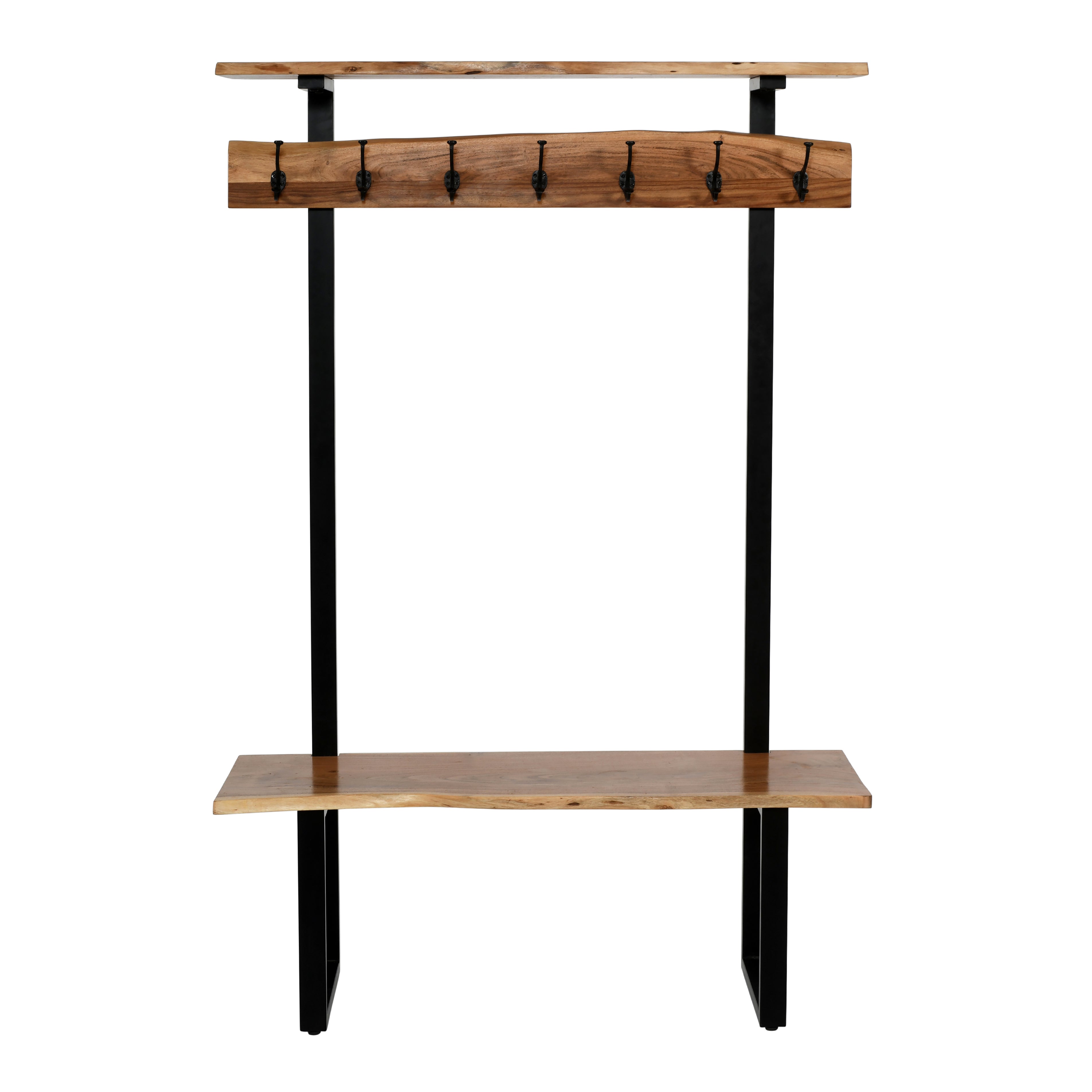 Style your entryway, living room or mudroom with this gorgeous natural acacia wood hall tree. This versatile piece combines seating and storage into one, making it an ideal option for optimizing your space. Each piece is constructed from acacia wood with live edge and metal strap legs. The live edge shape will vary on every piece due to the unique features of the natural wood. No piece is exactly alike; the subtle imperfections such as knots and cracks are part of the wood's character. A clear natural finish enhances the beautiful features in each piece of the solid acacia wood. With a modern rustic design, this hall tree will add both style and function to your home.