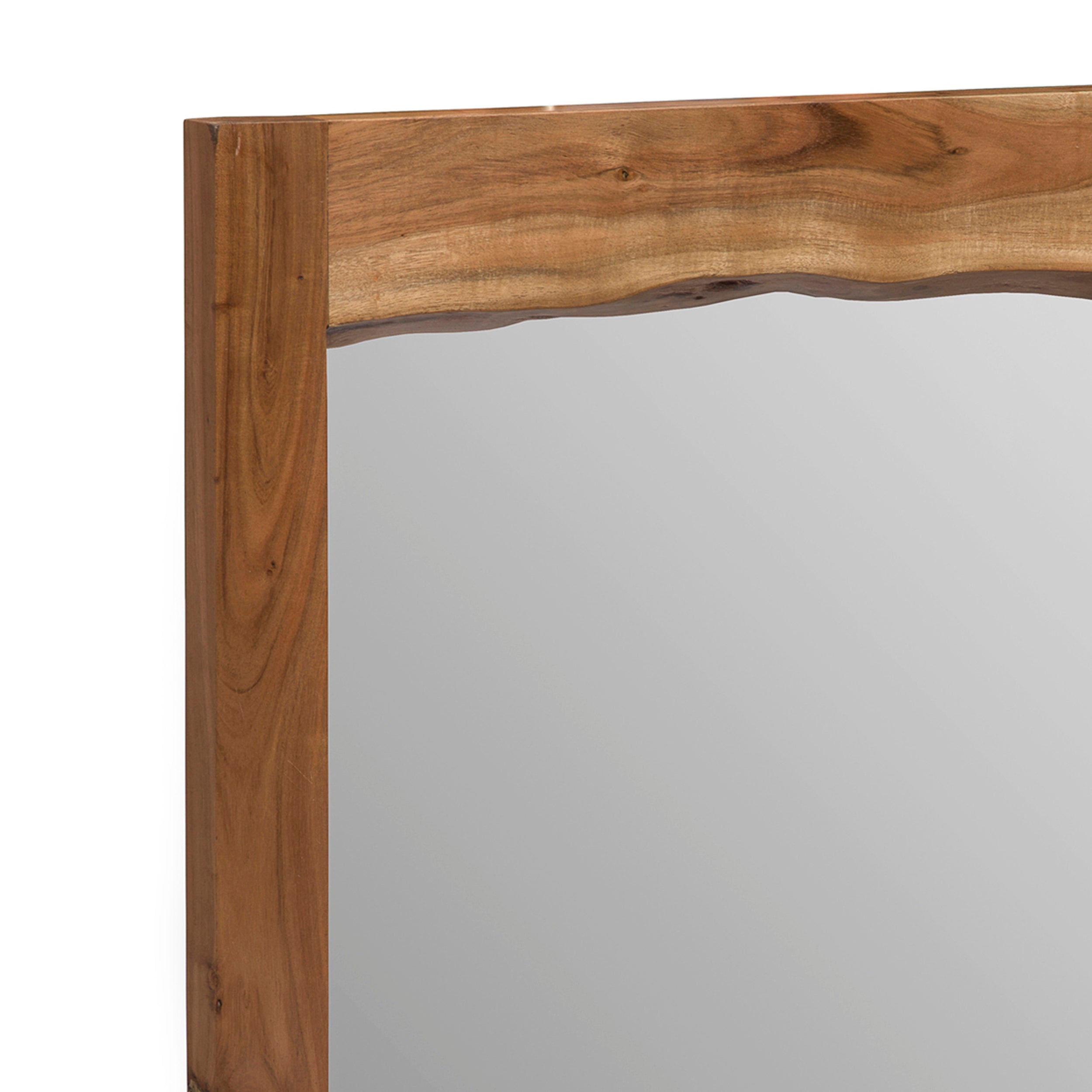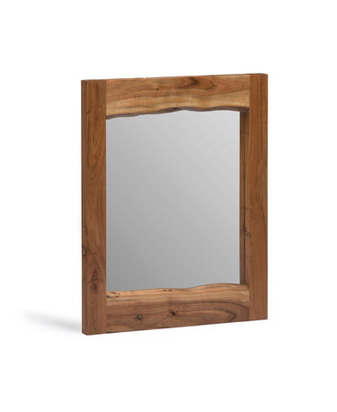 Alpine Live Edge Mirror is uniquely yours; style your entryway, living room or bedroom with this gorgeous natural Acacia wood mirror. Every mirror will be unique due to the natural qualities of the wood. The live edge is on the inside of the mirror frame while the outside of the mirror frame is square. Constructed of natural acacia wood. No piece is exactly alike, the subtle imperfections such as knots and cracks are part of the wood's character. A clear natural finish enhances the beautiful features in each piece of wood.