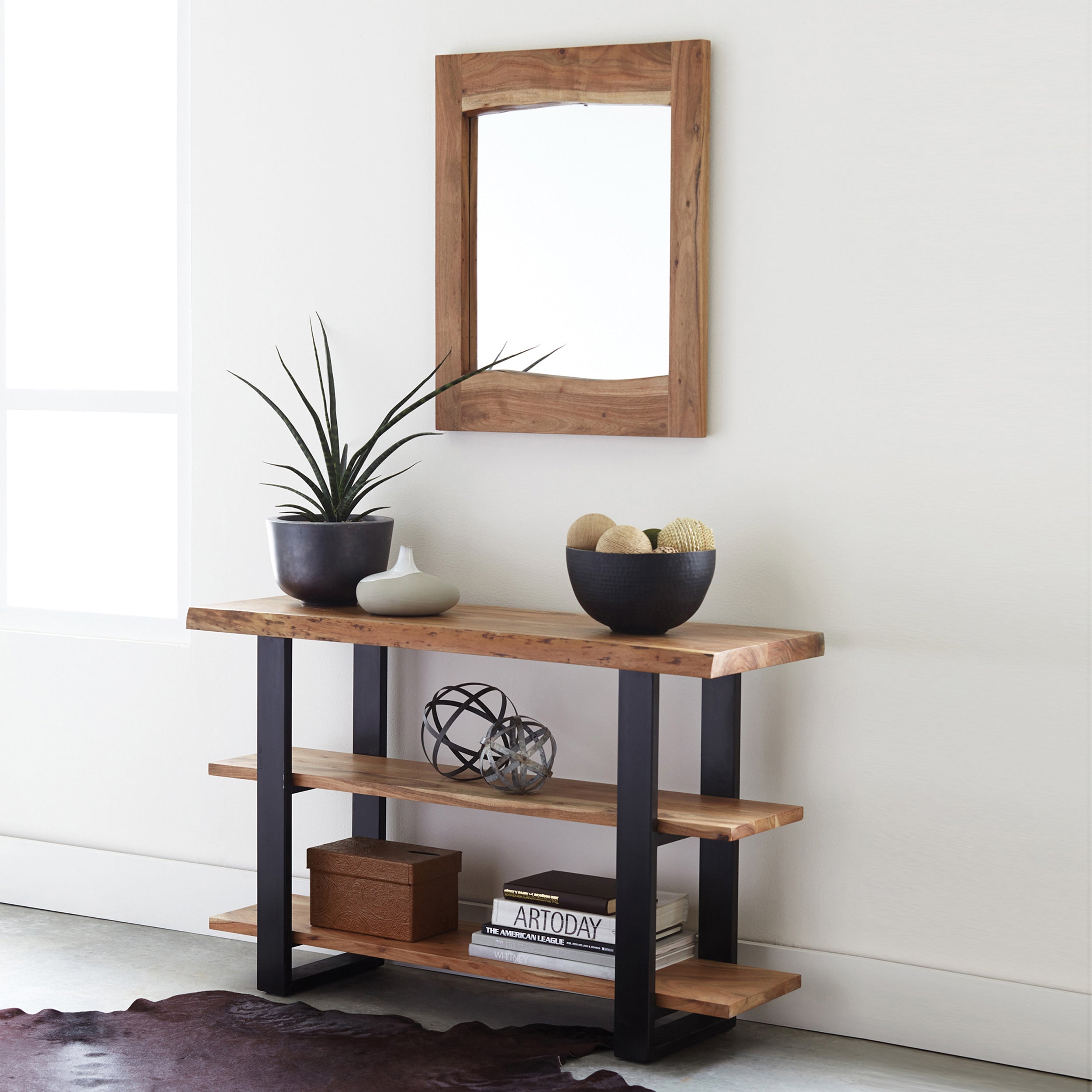 - [Unique Live Edge] Proudly display the natural beauty of handcrafted Acacia wood with this distinctive live edge mirror. Featuring a unique live edge design on the inside of the frame and a square outside edge, this piece brings a touch of nature to your home with subtle imperfections like knots and cracks.