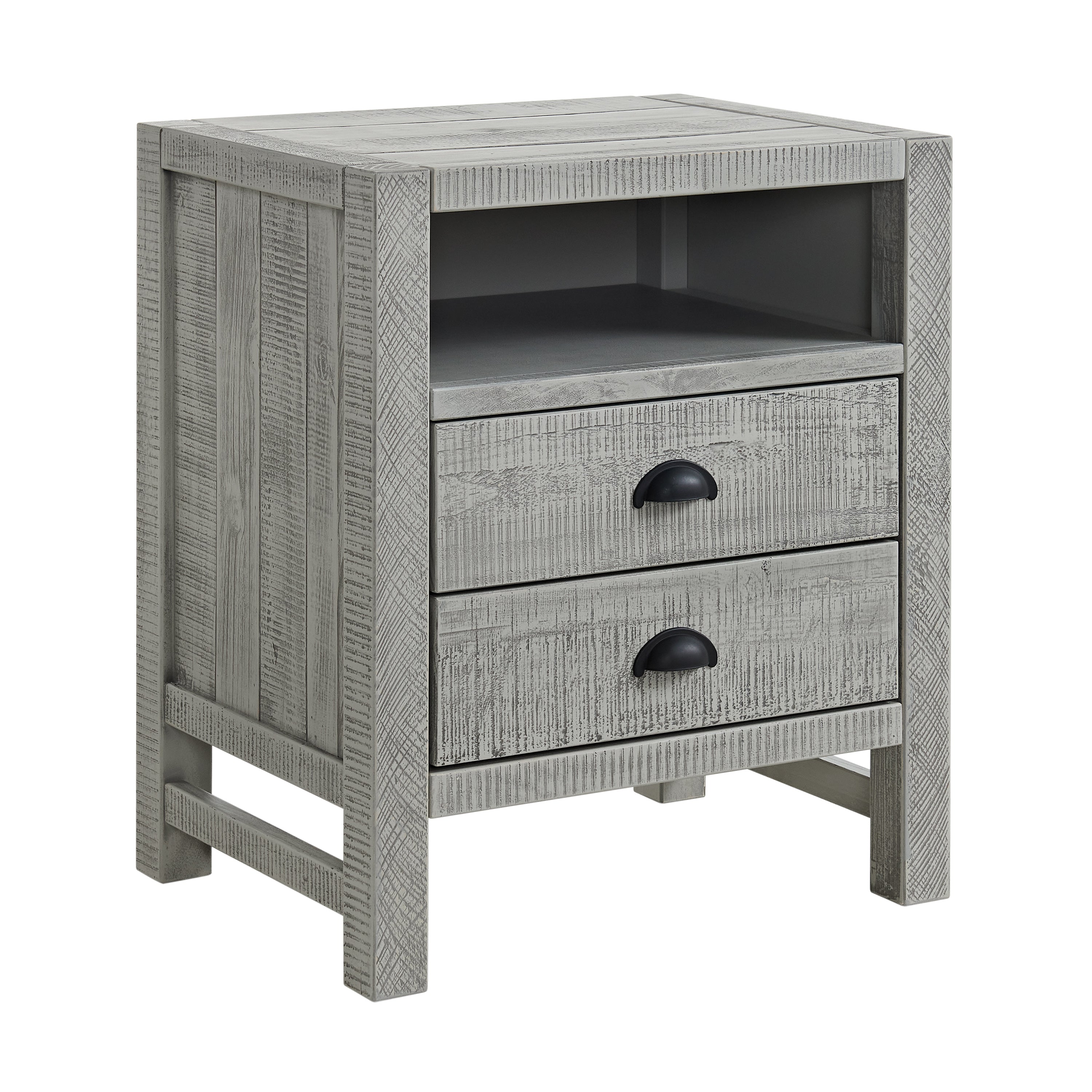 Simple yet striking, this bedroom collection transforms your space into an inviting haven. This nightstand includes two large drawers and one open top shelf, providing you plenty of room to keep your bedtime essentials nearby. The versatile style complements a wide array of styles ranging from modern rustic to a boho retreat. Made of solid pine wood. These pieces are well constructed, durable, and will last for years to come. The light driftwood finish highlights tonal variations, grain and marks that are unique to each piece. Assembly required.