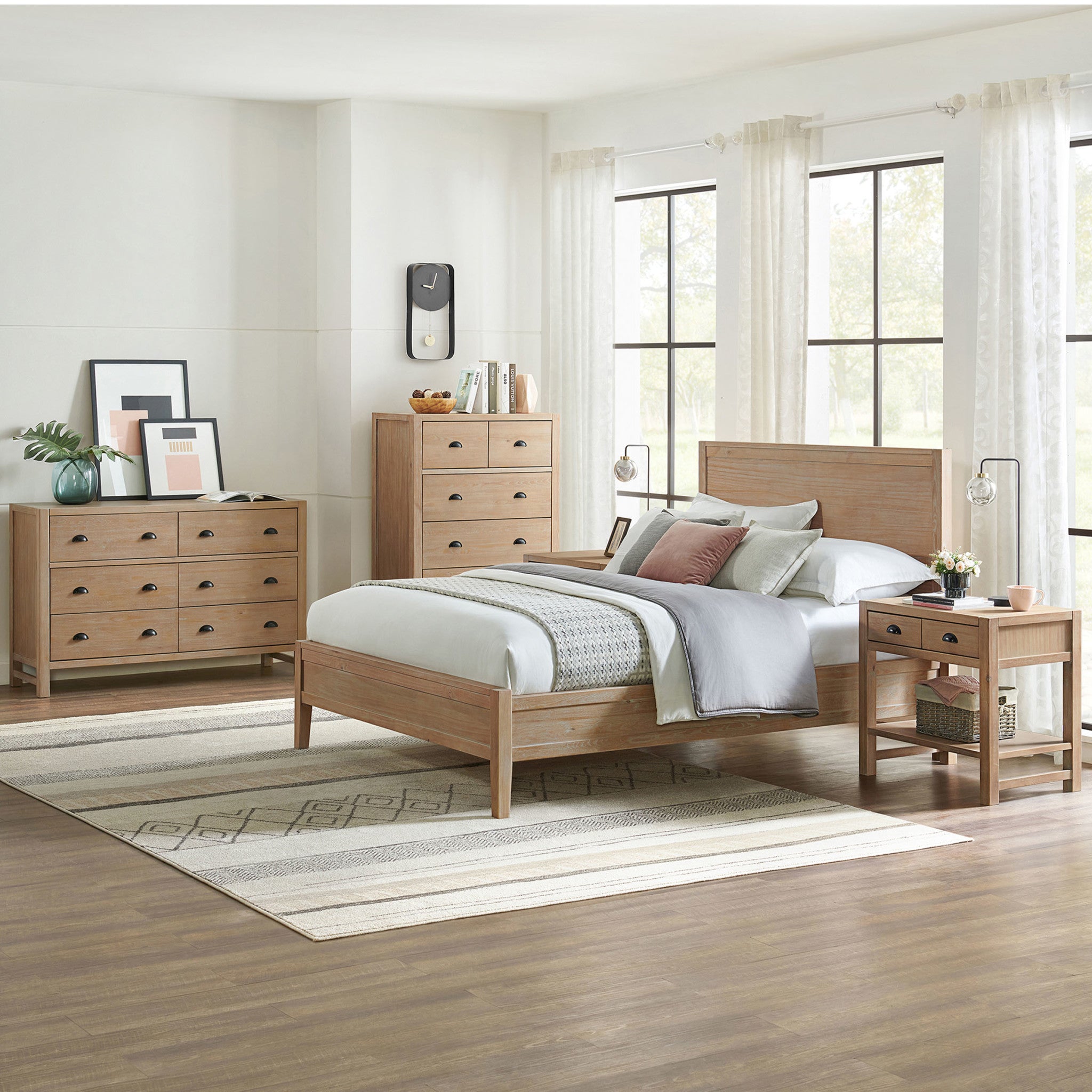 Simple yet striking, this 5-piece bedroom set transforms your space into an inviting haven. The centerpiece of your restful retreat, this bed is the perfect spot to curl up at the end of the day. The versatile style complements a wide array of styles ranging from modern rustic to a boho retreat. Made of solid pine wood. The set includes a queen bed, two 2-drawer nightstand, 5-drawer chest, and 6-drawer double dresser. The light driftwood finish highlights tonal variations, grain and marks that are unique to each piece. This set will be a perfect addition to your restful retreat. Assembly required.