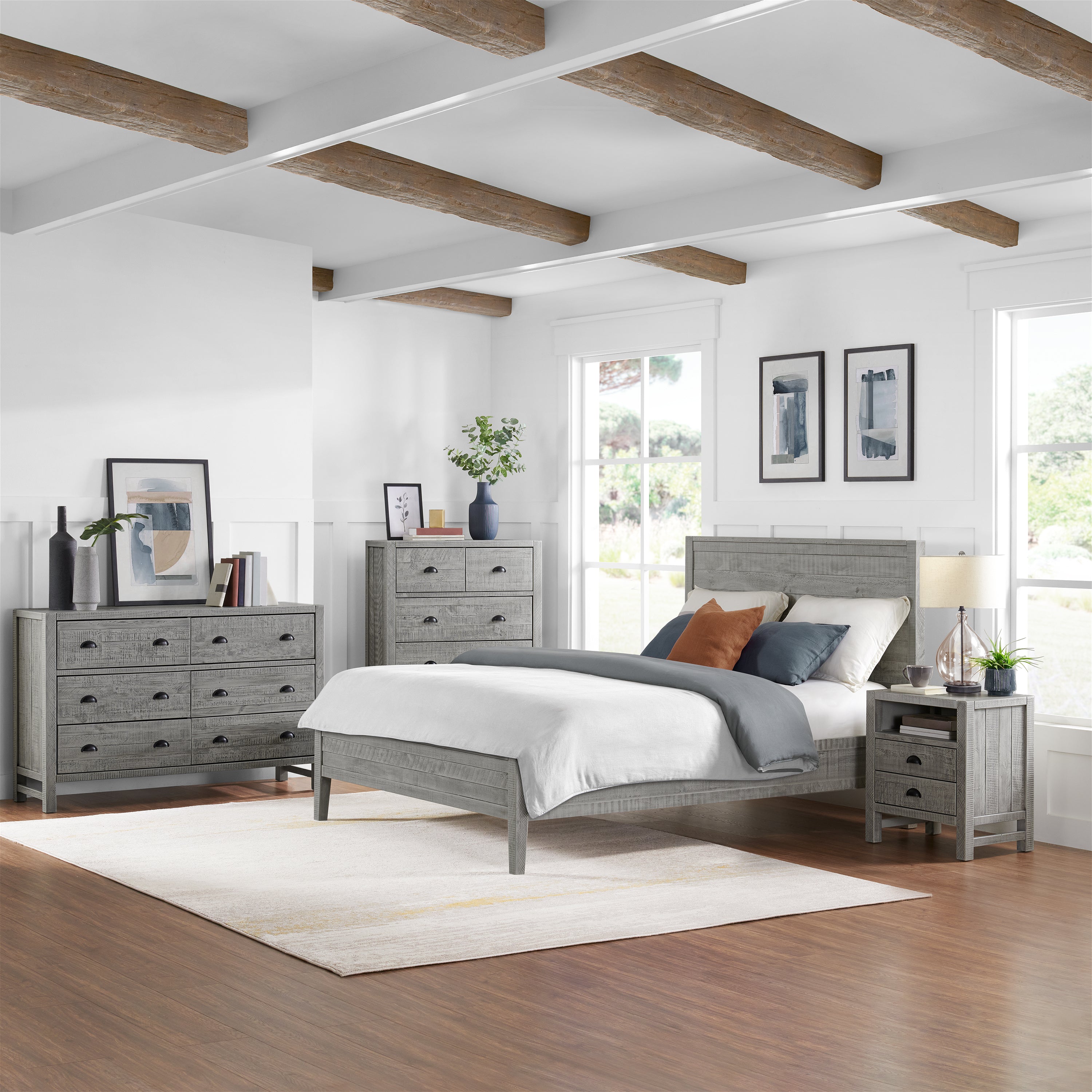Simple yet striking, this 4-piece bedroom set transforms your space into an inviting haven. The centerpiece of your restful retreat, this bed is the perfect spot to curl up at the end of the day. The versatile style complements a wide array of styles ranging from modern rustic to a boho retreat. Made of solid pine wood. The set includes a queen bed, 2-drawer nightstand, 5-drawer chest, and 6-drawer double dresser. The light driftwood finish highlights tonal variations, grain and marks that are unique to each piece. This set will be a perfect addition to your restful retreat. Assembly required.