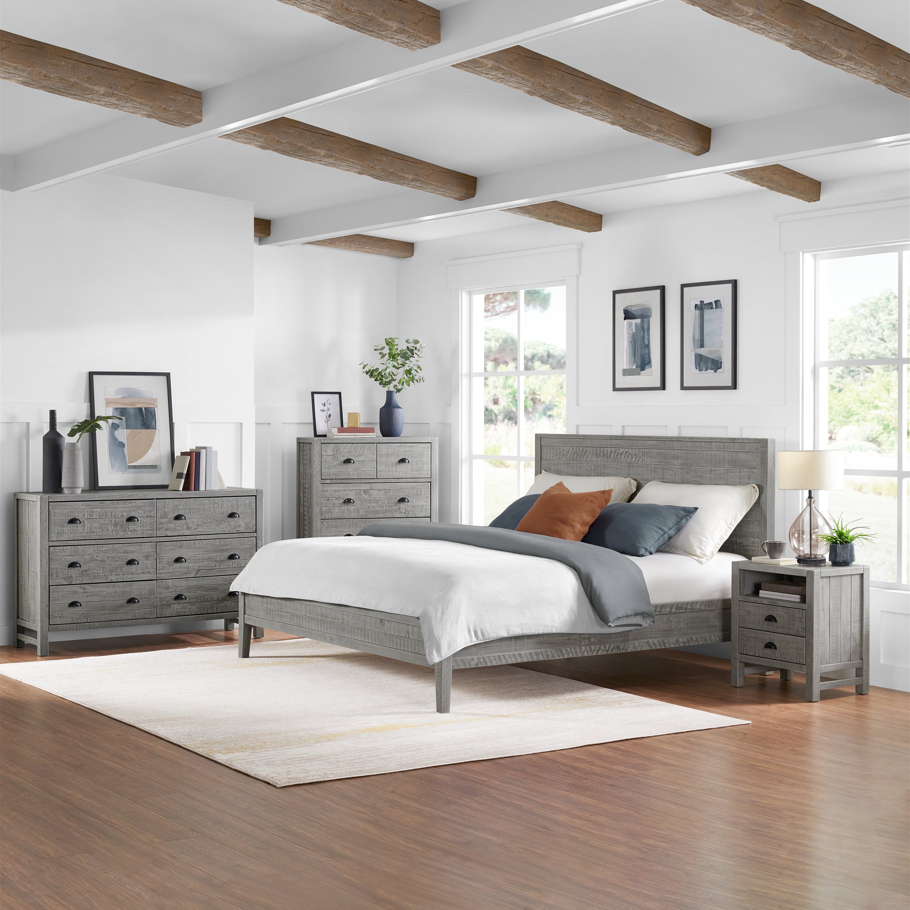Simple yet striking, this 4-piece bedroom set transforms your space into an inviting haven. The centerpiece of your restful retreat, this bed is the perfect spot to curl up at the end of the day. The versatile style complements a wide array of styles ranging from modern rustic to a boho retreat. Made of solid pine wood. The set includes a king bed, 2-drawer nightstand, 5-drawer chest, and 6-drawer double dresser. The light driftwood finish highlights tonal variations, grain and marks that are unique to each piece. This set will be a perfect addition to your restful retreat. Assembly required.