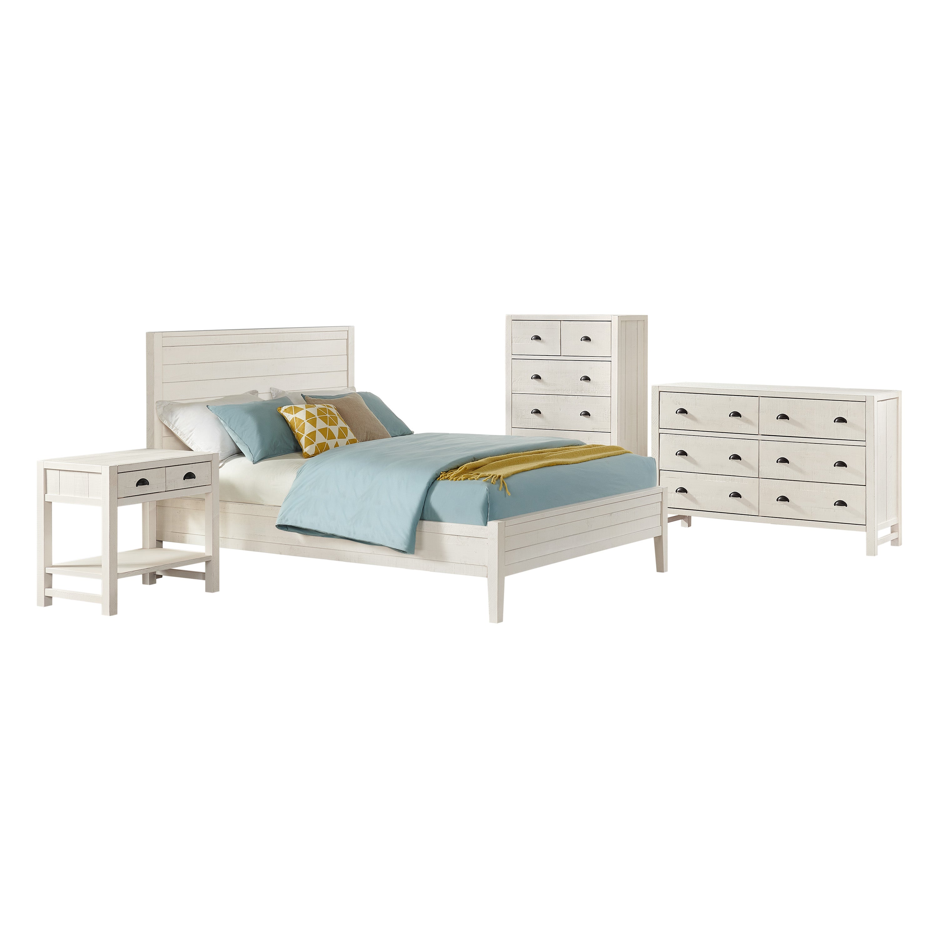 Arden 4-Piece Wood Bedroom Set with Queen Bed, 2-Drawer Nightstand with open shelf, 5-Drawer Chest, 6-Drawer Dresser, Driftwood White