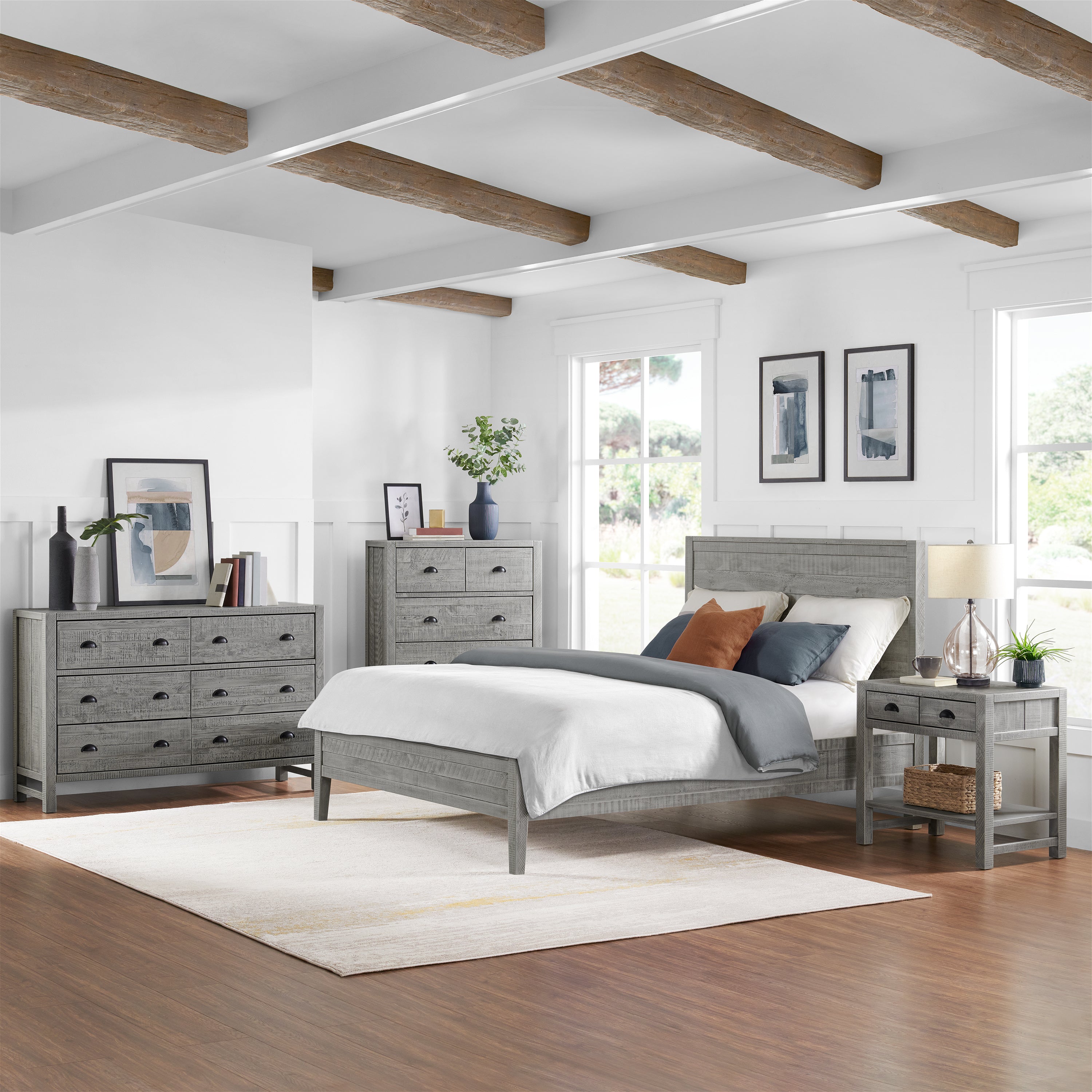 Simple yet striking, this 4-piece bedroom set transforms your space into an inviting haven. The centerpiece of your restful retreat, this bed is the perfect spot to curl up at the end of the day. The versatile style complements a wide array of styles ranging from modern rustic to a boho retreat. Made of solid pine wood. The set includes a queen bed, 2-drawer nightstand, 5-drawer chest, and 6-drawer double dresser. The light driftwood finish highlights tonal variations, grain and marks that are unique to each piece. This set will be a perfect addition to your restful retreat. Assembly required.