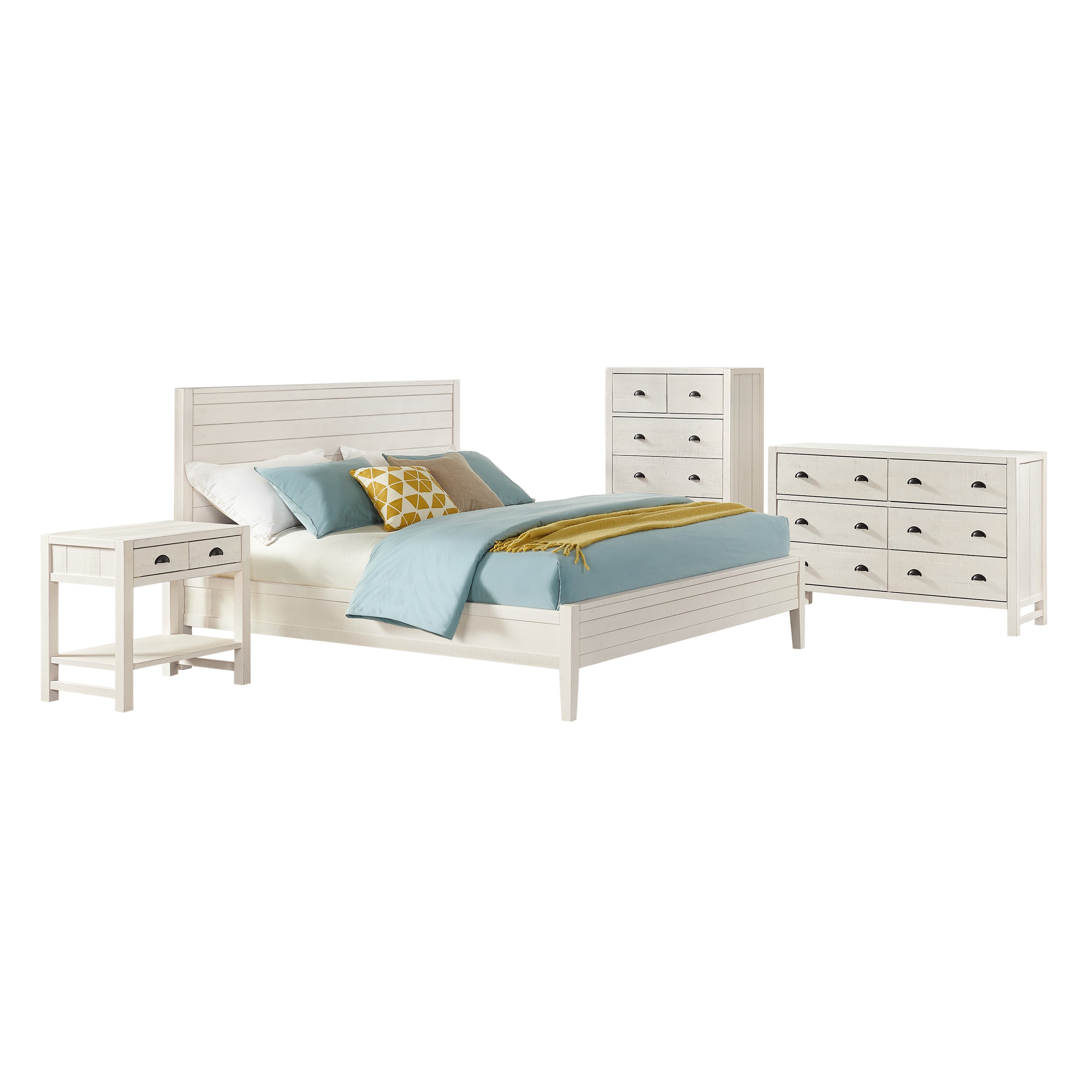 Arden 4-Piece Bedroom Set with King Bed, 2-Drawer Nightstand with open shelf, 5-Drawer Chest, 6-Drawer Dresser, Driftwood White