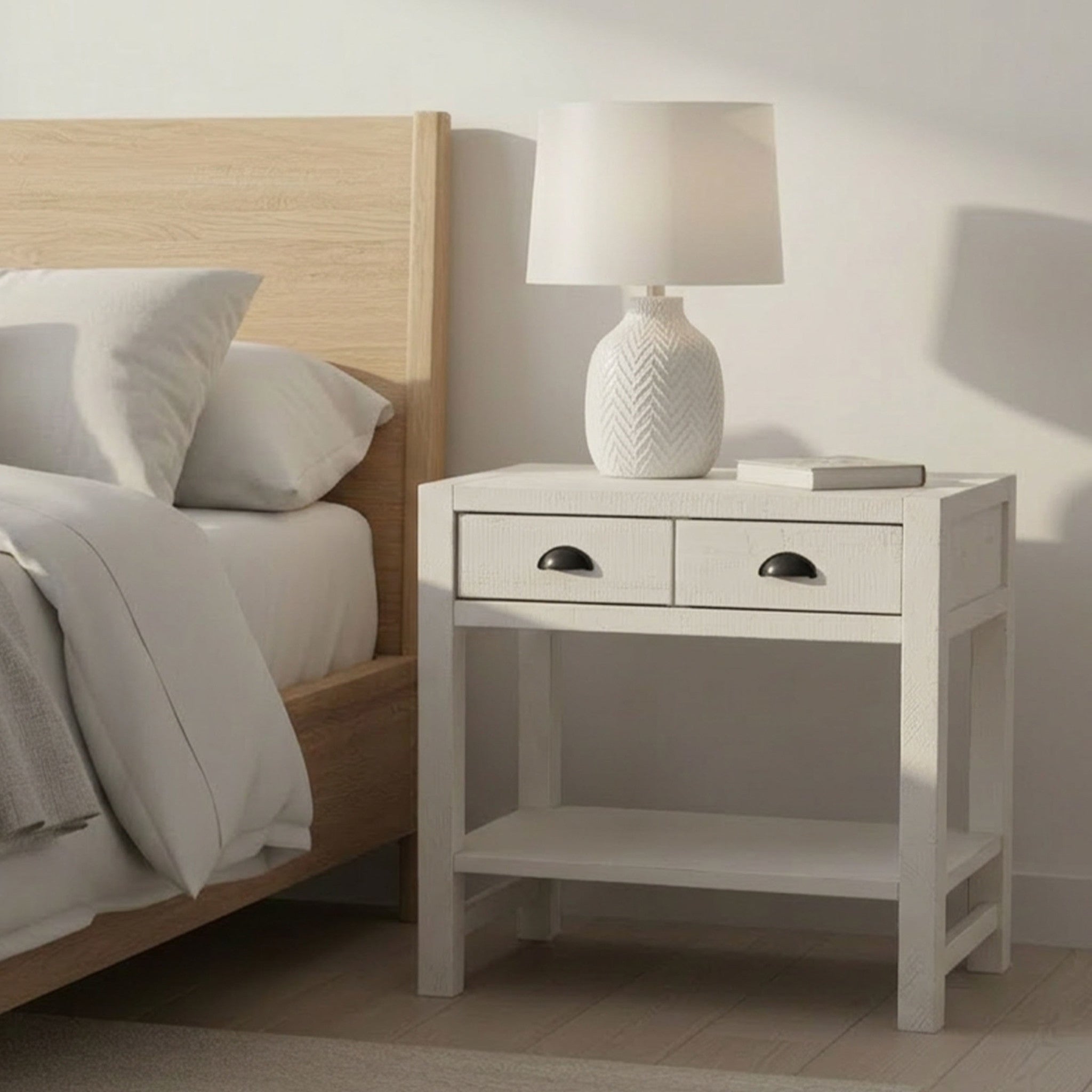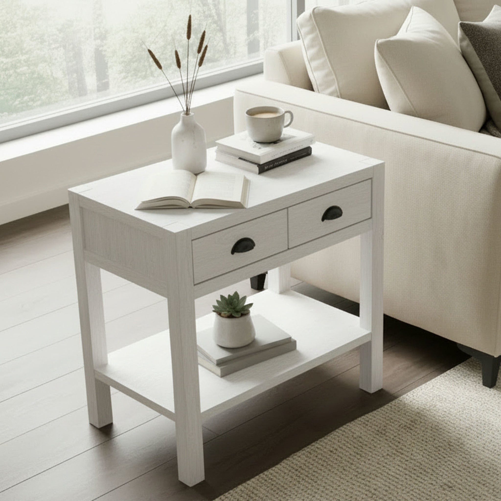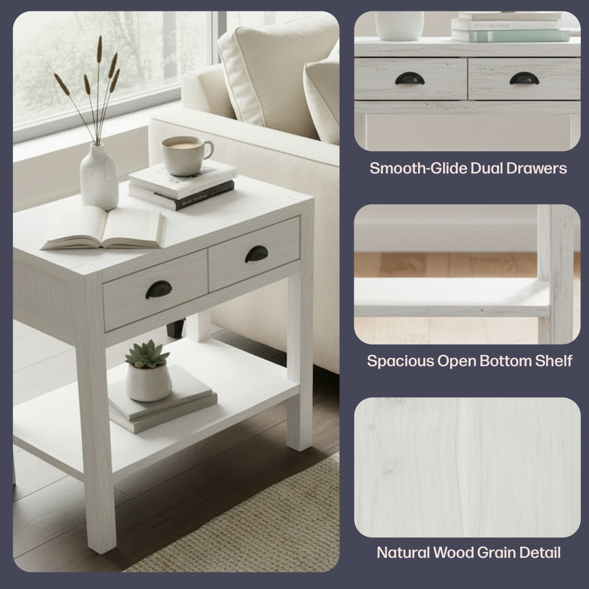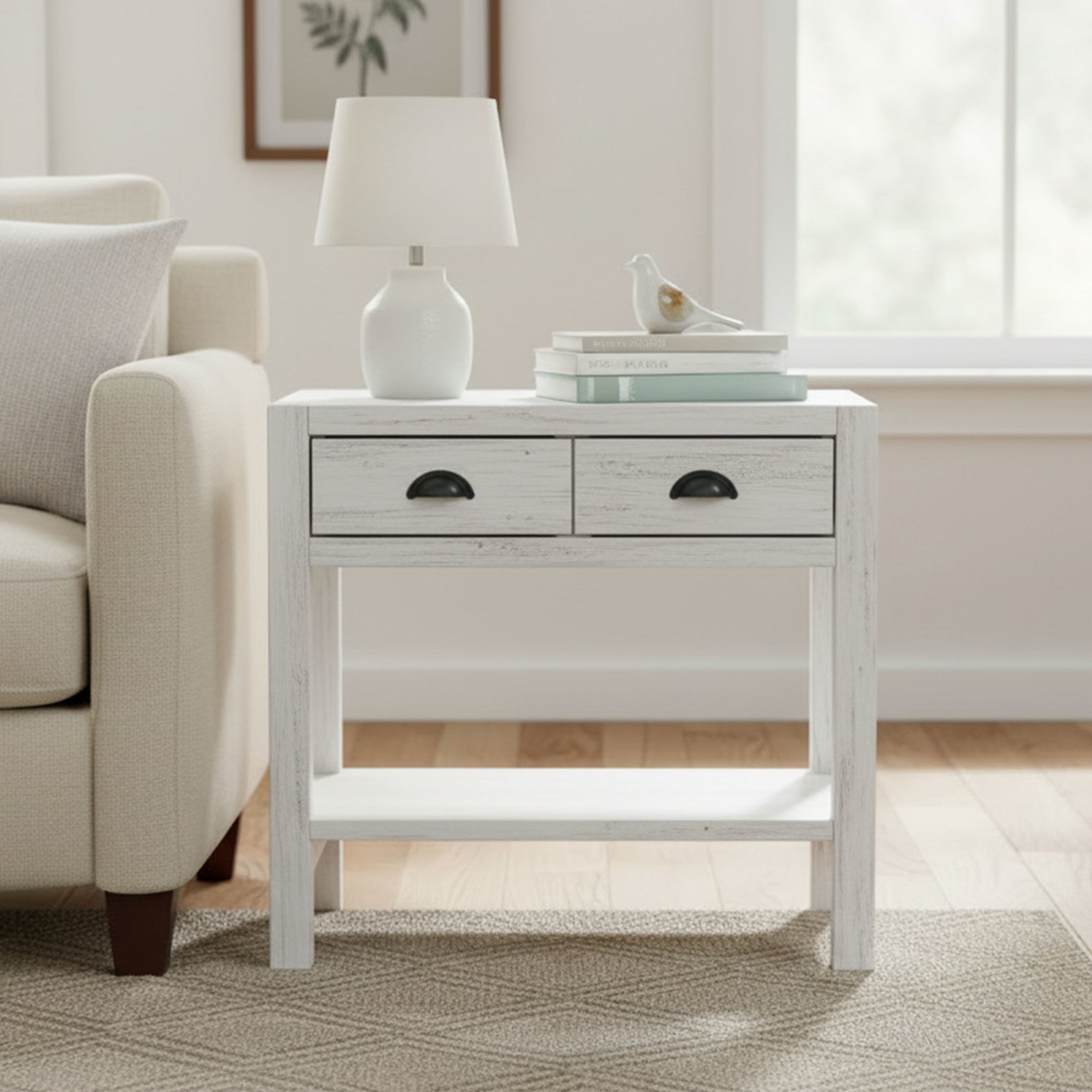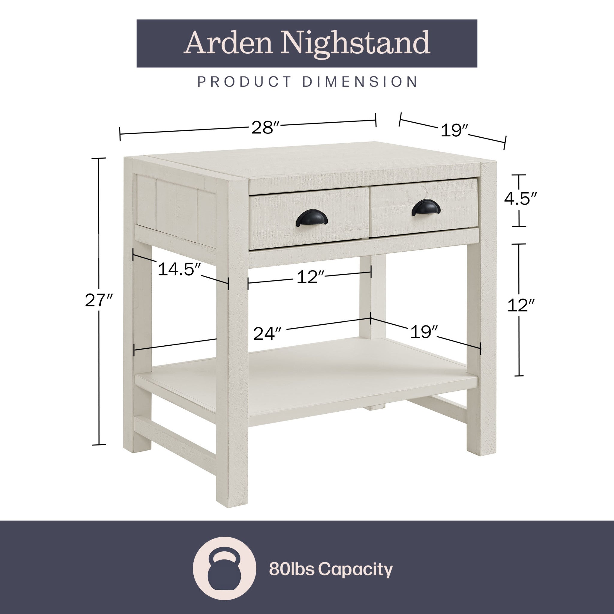 Achieve a high-end look with the Arden 28-Inch Modern Farmhouse Night Stands by Alaterre Furniture. The couch side table offers versatile storage with two drawers to keep essentials tucked away and a spacious open bottom shelf, perfect for books, storage baskets, or home decor. The oil-rubbed bronze drawer pulls, and smooth metal drawer glides ensure easy, quiet access, while the large 27-inch height makes it the perfect bedside companion.