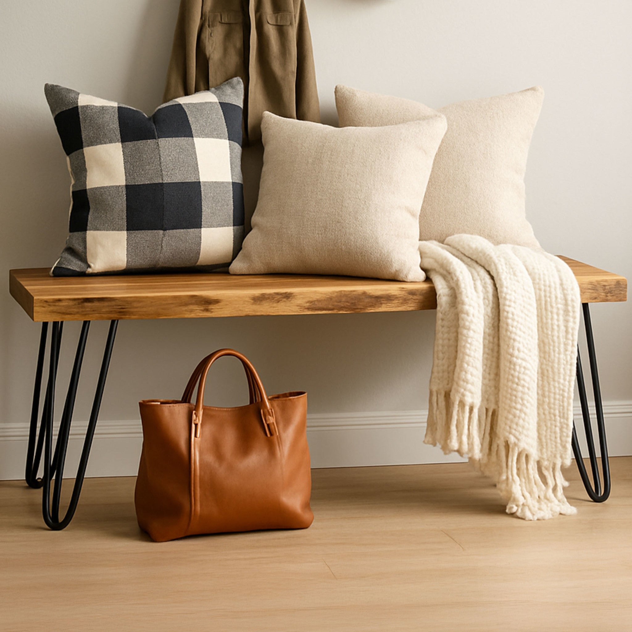 - This entry bench is made of solid acacia wood with metal hairpin legs for increased structural durability to support a total weight of 300lbs