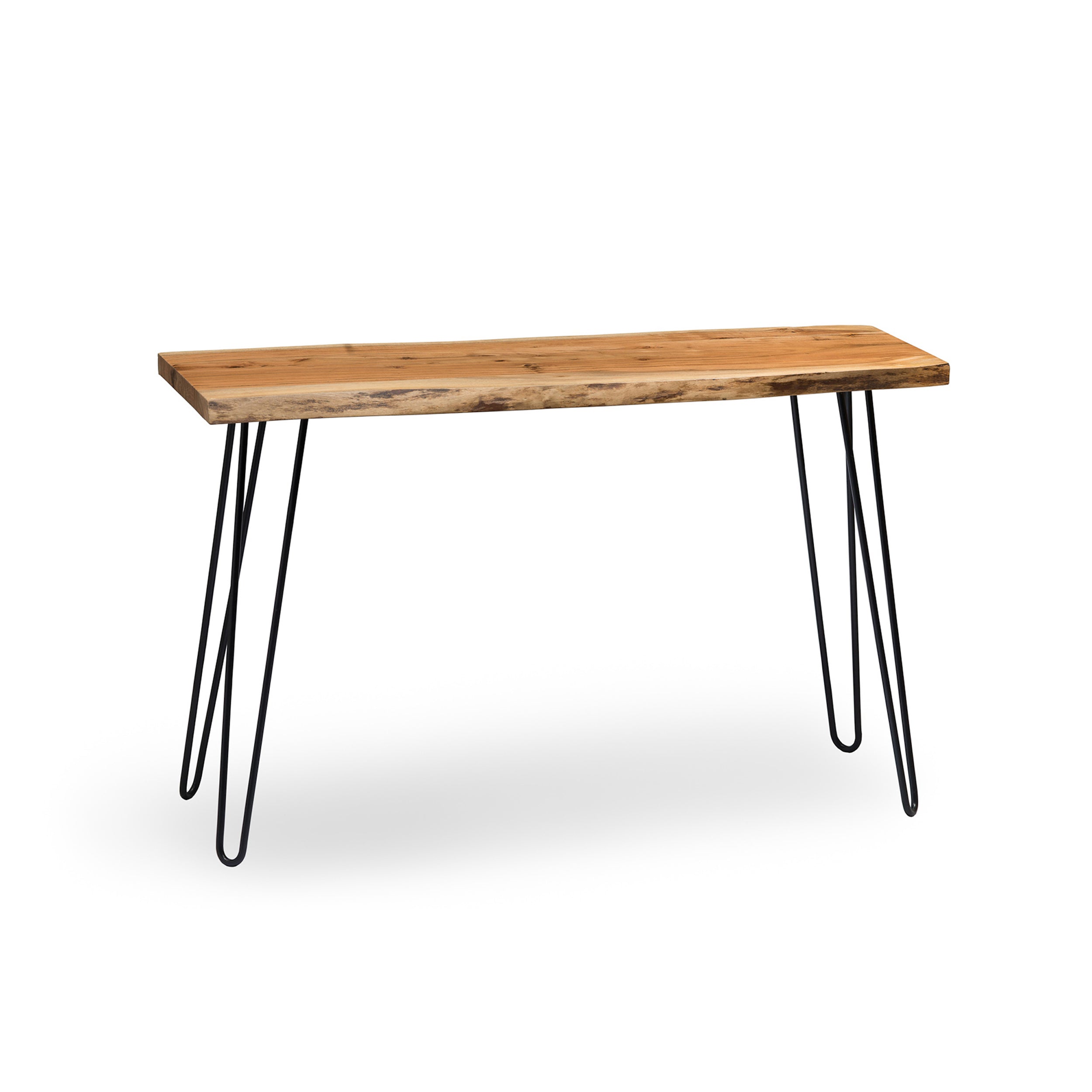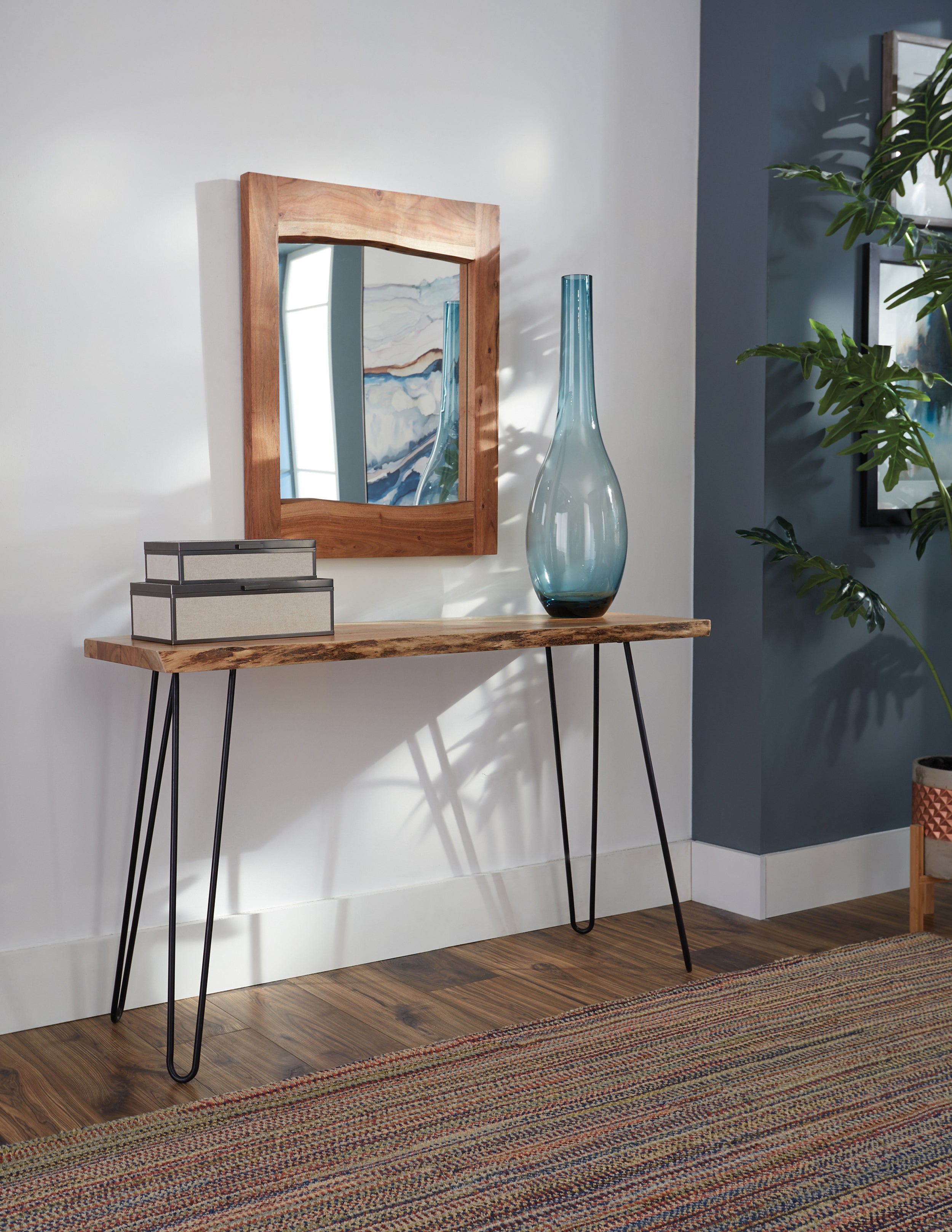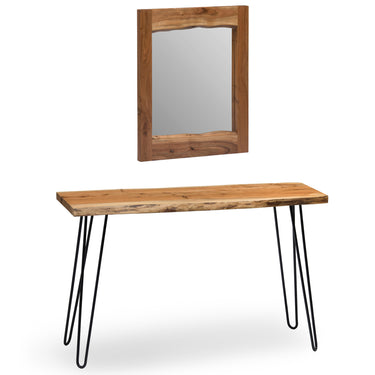 Mid-century meets Modern Industrial with these natural live edge table tops and hairpin metal legs. Each tabletop is unique; no two tops will be exactly alike. This set includes a 48" wide wood console table and a 24" mirror. Constructed of natural acacia wood, a clear natural finish embraces the beautiful features of each piece of wood. The knots and cracks add to the wood's character. Each of our live edge products includes nylon floor protectors.