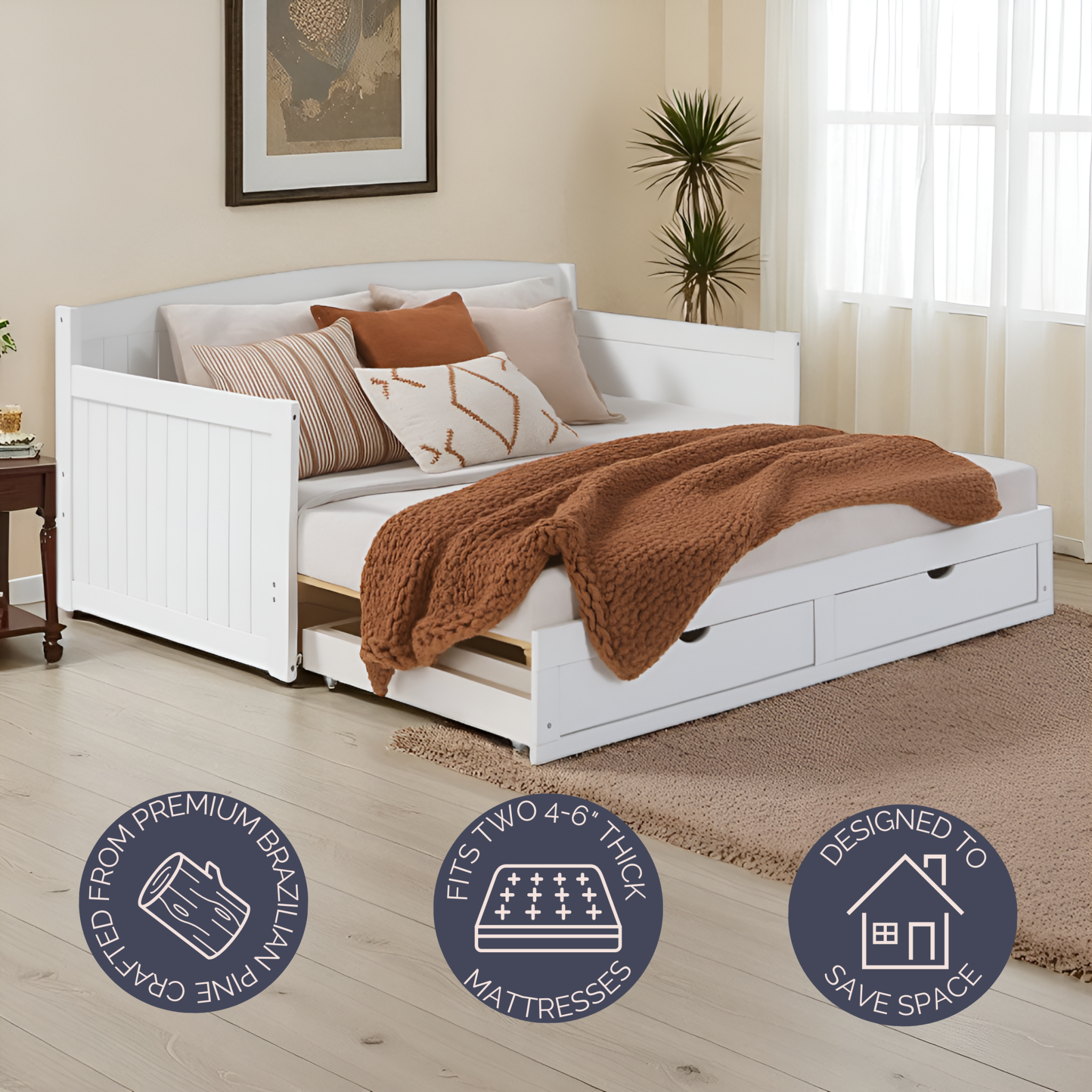The Harmony Daybed is a perfect space-saving bed for your guests, your child's room or anywhere you need more sleeping space! Constructed from Brazilian Pine, our furniture is meant to be stylish and durable. This bed requires two twin-size mattresses, not included. The two mattresses stack on top of each other while the bed is in twin-position. We suggest two twin mattresses that are 4-6"H so that some of the bed frame will still show. When you pull-out the bed you will slide one mattress over to the extended side and the bed will be level to a king-size; a unique style of a trundle bed. The drawers will also extend so you can still access them.