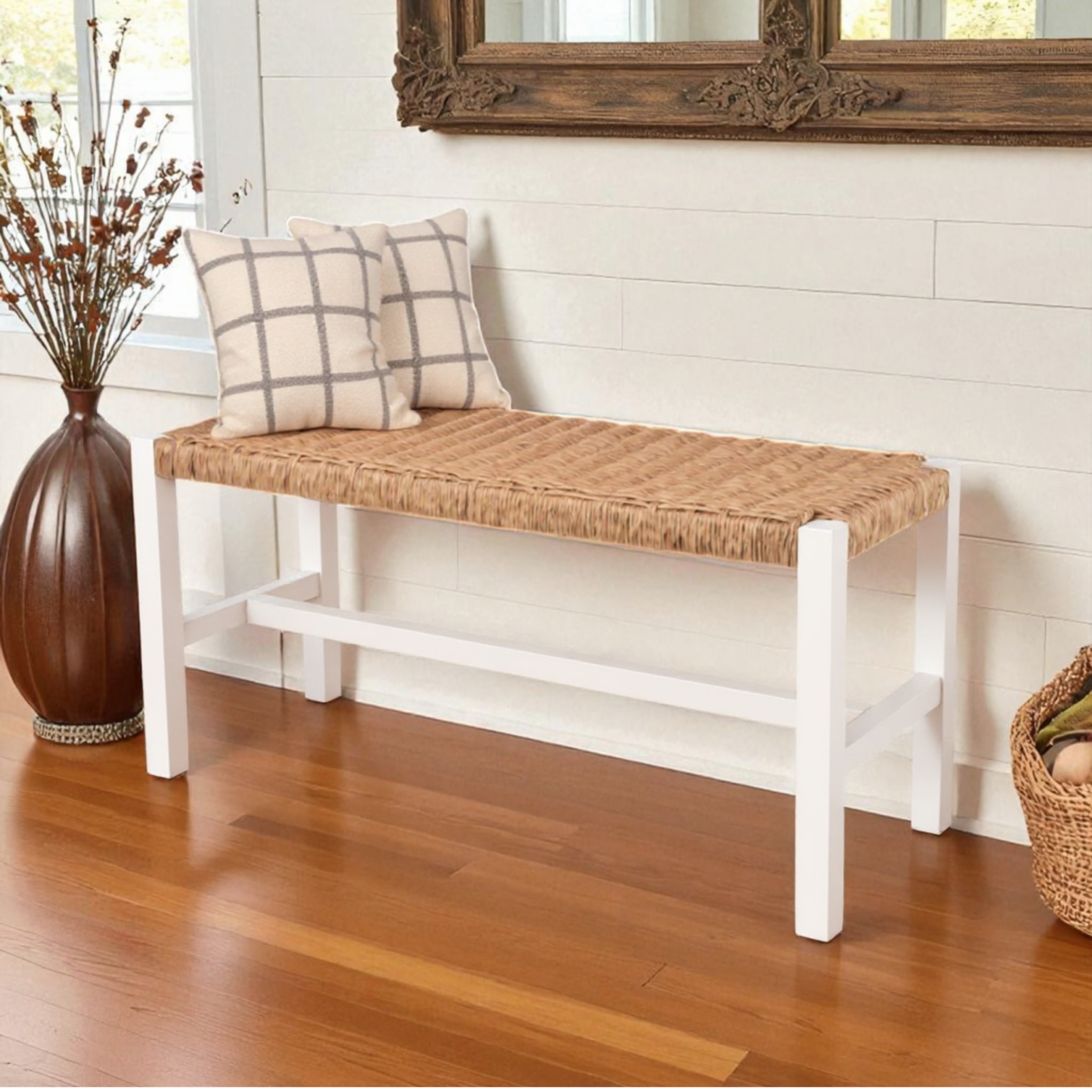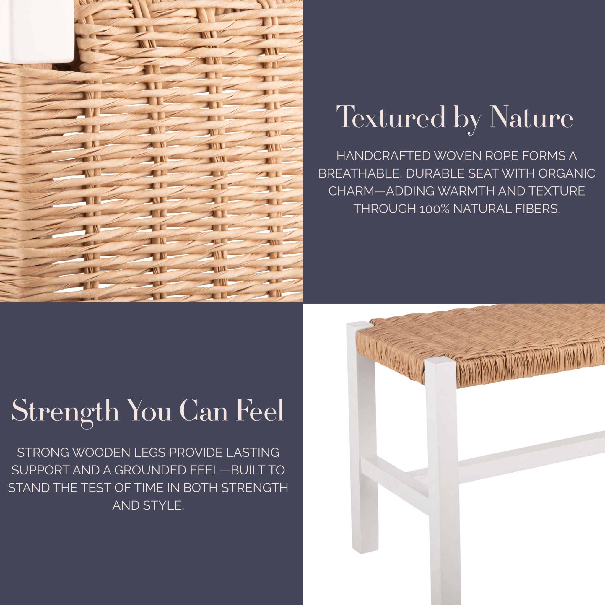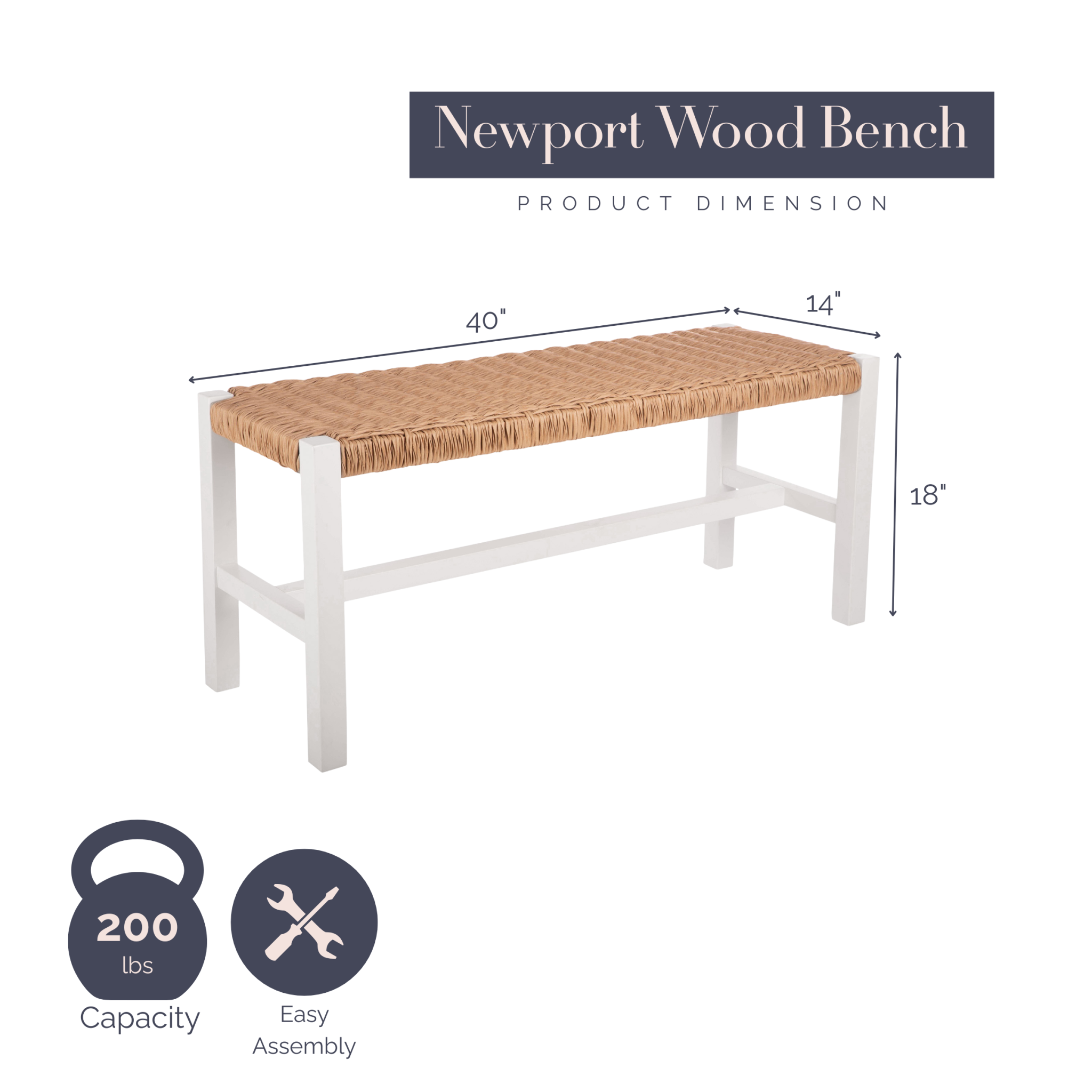 Achieve a high-end look with the Newport Collection 40-Inch Wooden Bench by Alaterre Furniture. This rustic bench is composed of sturdy rubber wood with a white finish and clean lines that pair beautifully with a variety of styles, including coastal, modern, minimalist, and farmhouse furniture. The bench seat is made of handcrafted natural rope, supporting a weight capacity of 200-pounds. Use it as an entry way bench, dining bench, hallway bench, end of bed bench, accent bench, and more — the possibilities are endless with its unique design and ideal size.