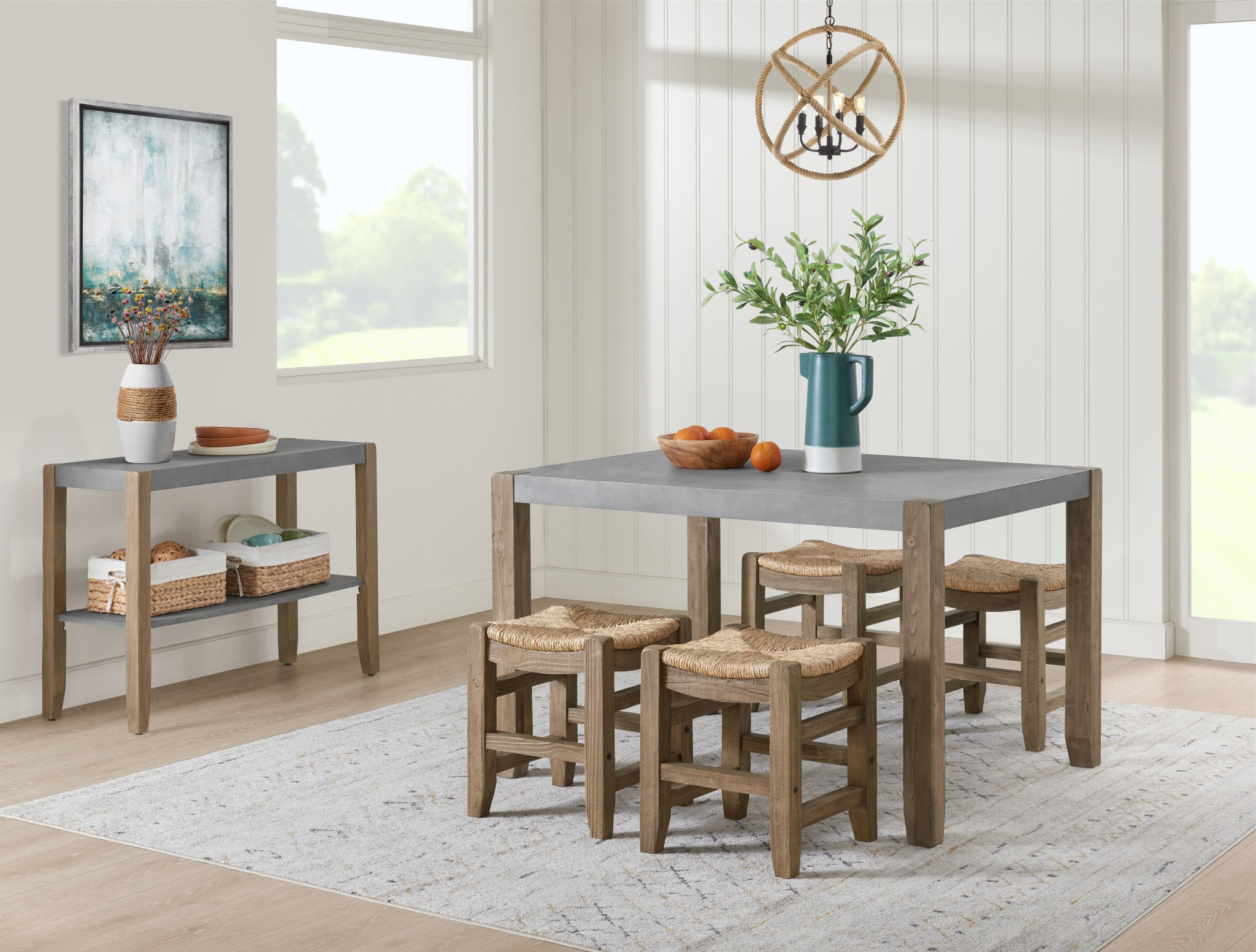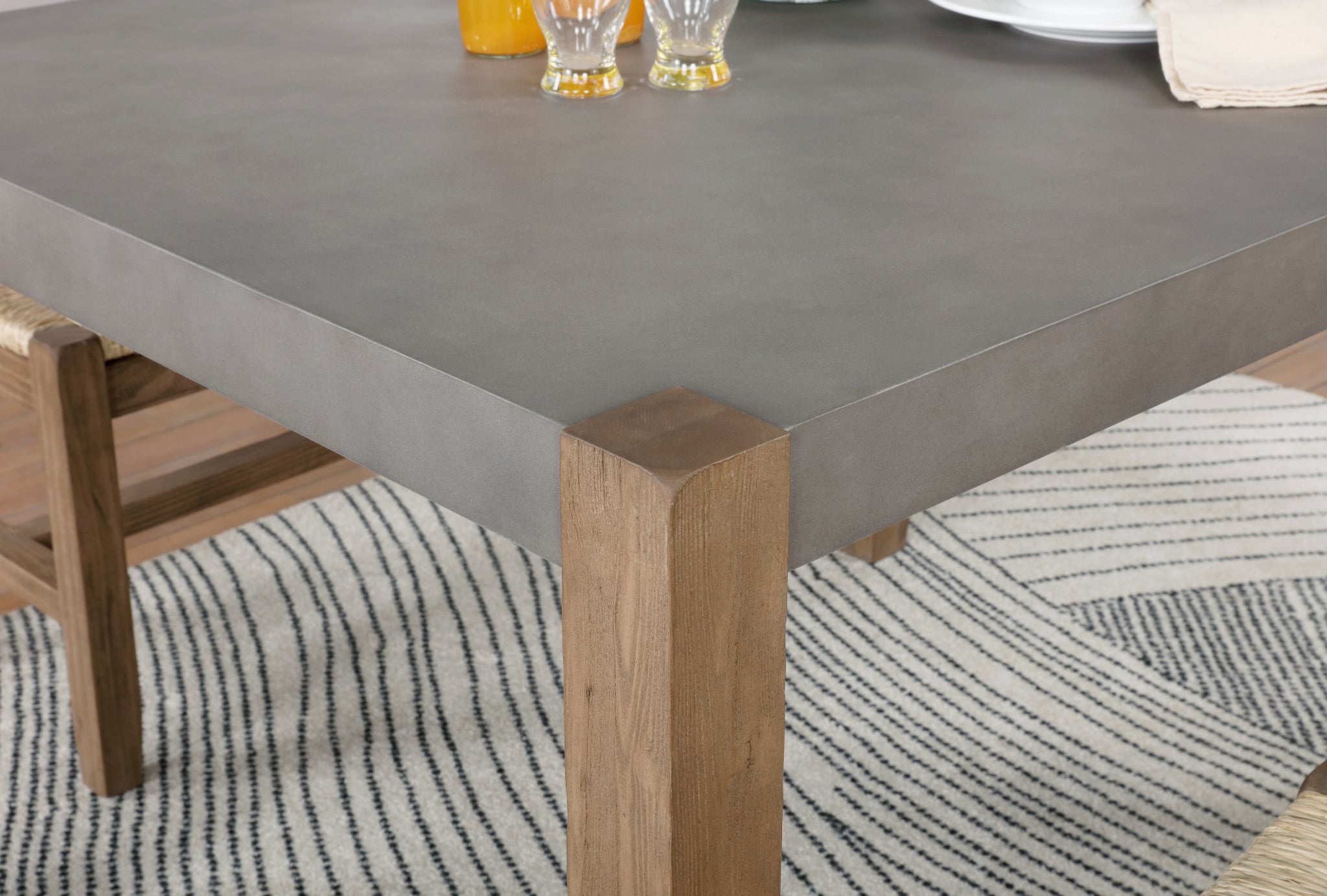 - [UNIQUE MIX] Faux concrete top with square wood legs and rush seat stools create an eye-catching, modern mix for your home