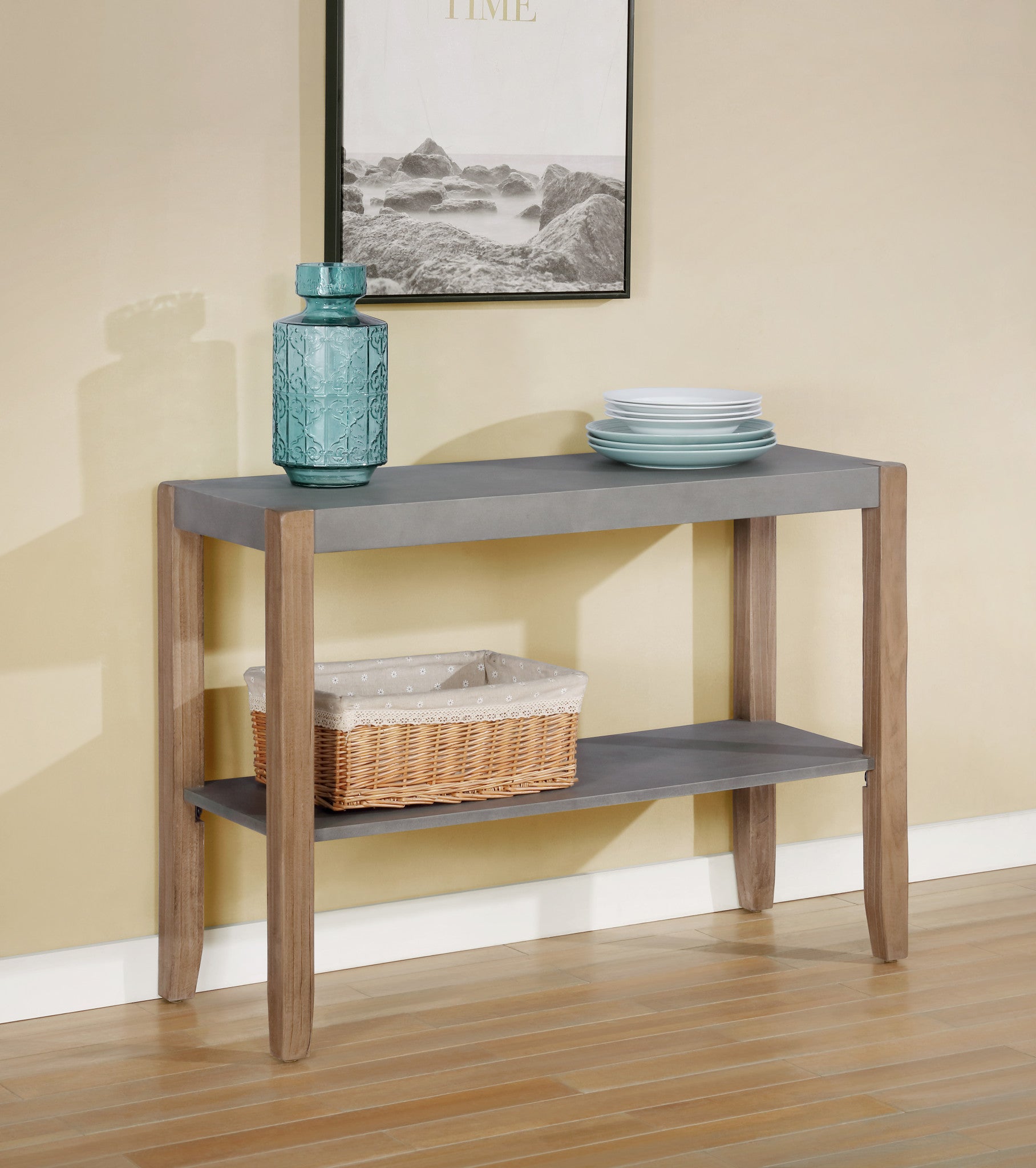 Clean lines and mixed materials are hallmarks of this rustic industrial furniture collection. This set is perfect for your kitchen, dining room or even rec room/bar area. It features a table, four 18" stools, and a buffet/serving table. The faux concrete with the square wood legs and the rush seat stools blend seamlessly. The Newport collection allows you to affordably update your spaces to a very stylish look.