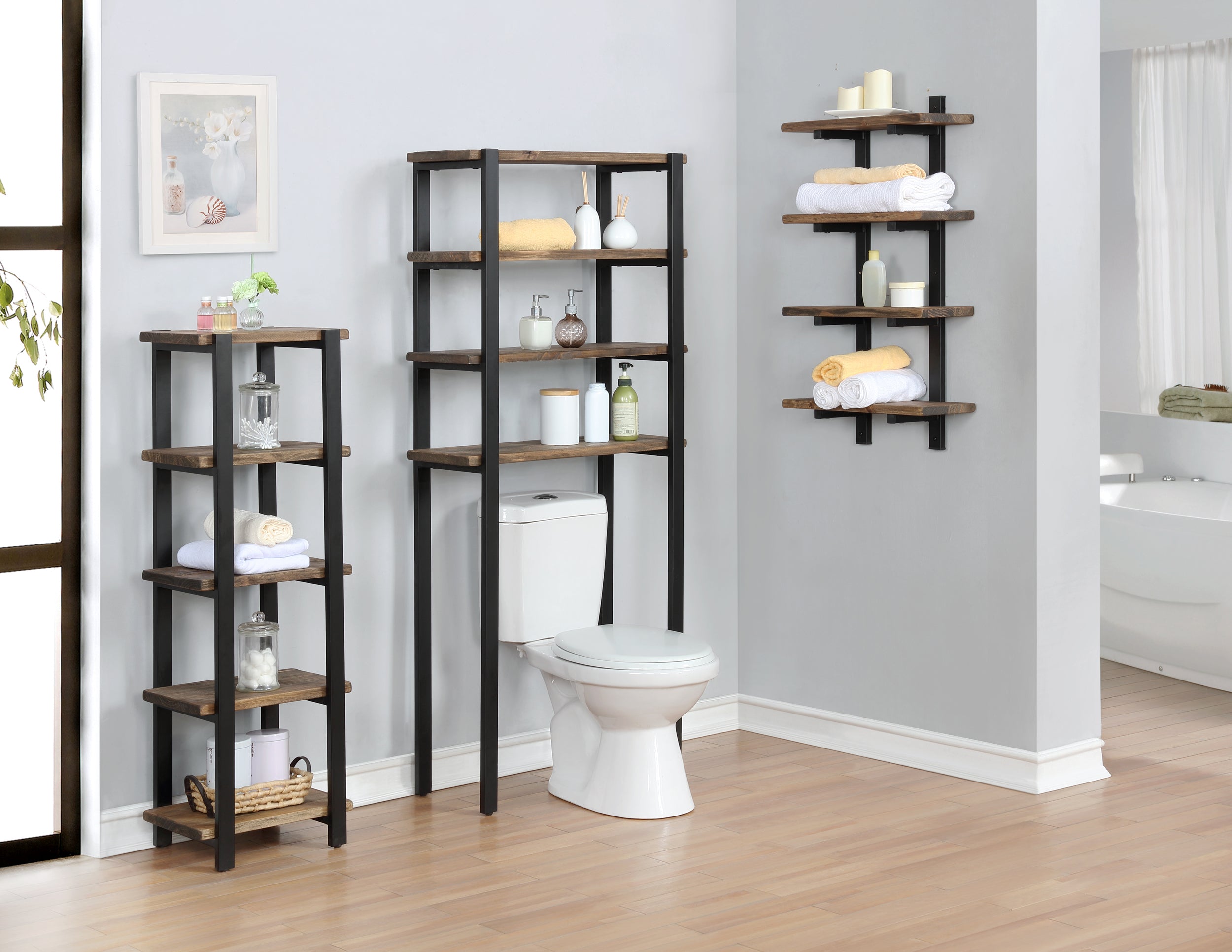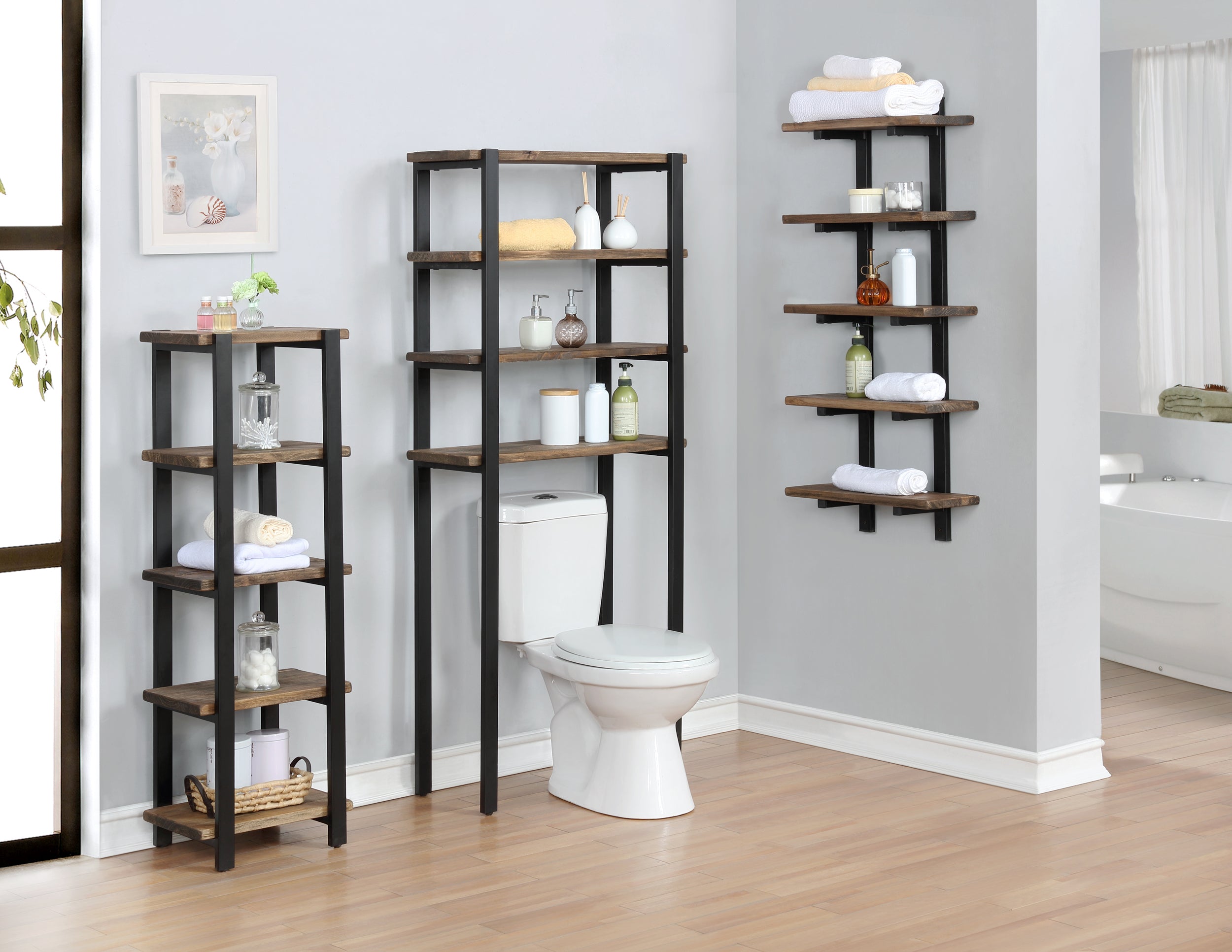 Pomona 48"H Metal and Solid Wood Bath Floor Storage Shelf