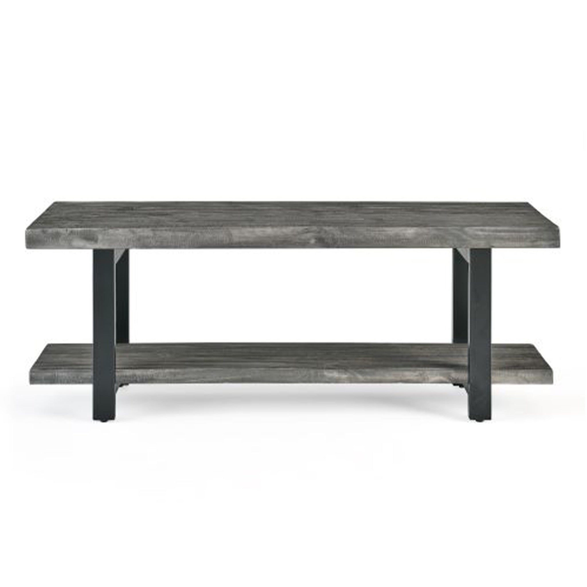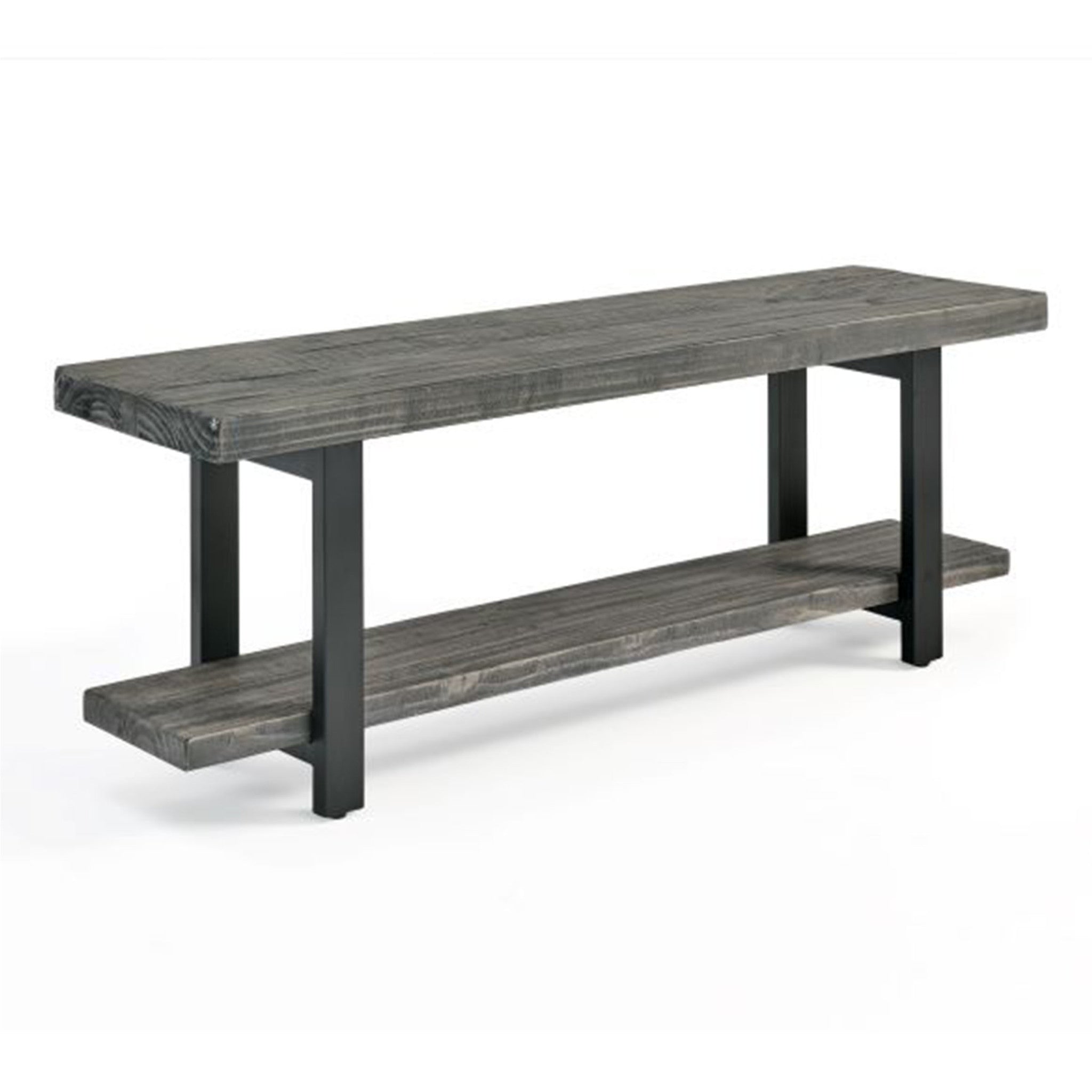 The Pomona collection features the exquisite workmanship of a solid wood top with metal legs that will last for years to come. Each piece is constructed of solid pine wood and finished to have the appearance of reclaimed wood. The reclaimed wood finish highlights natural wood variations such as cracks and knots which add to the piece's character. Any item in this collection will add to the rustic industrial style of any space. Pomona Bench is versatile and perfect for your entryway, dining, or living room. Sit on the bench to put on or remove your shoes.