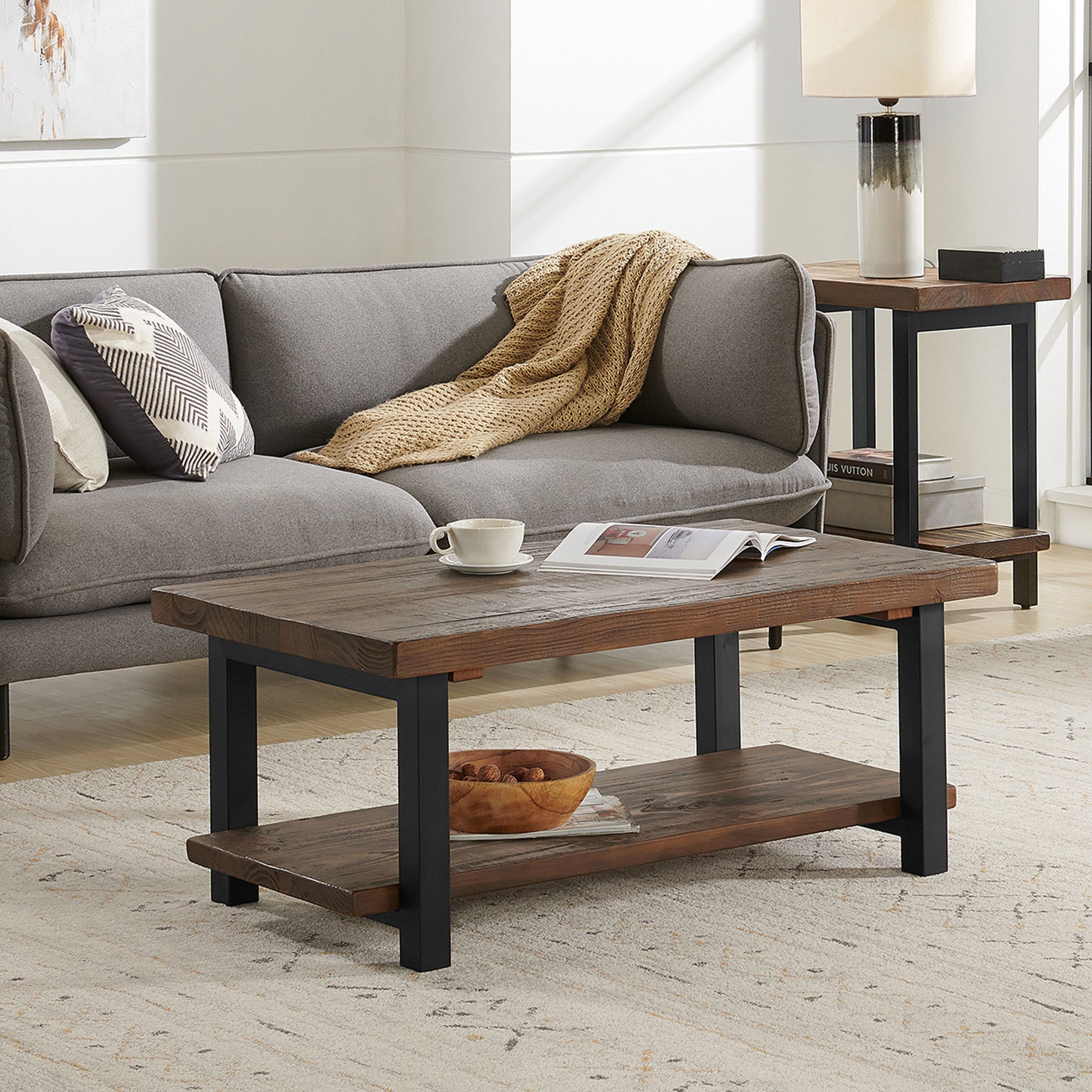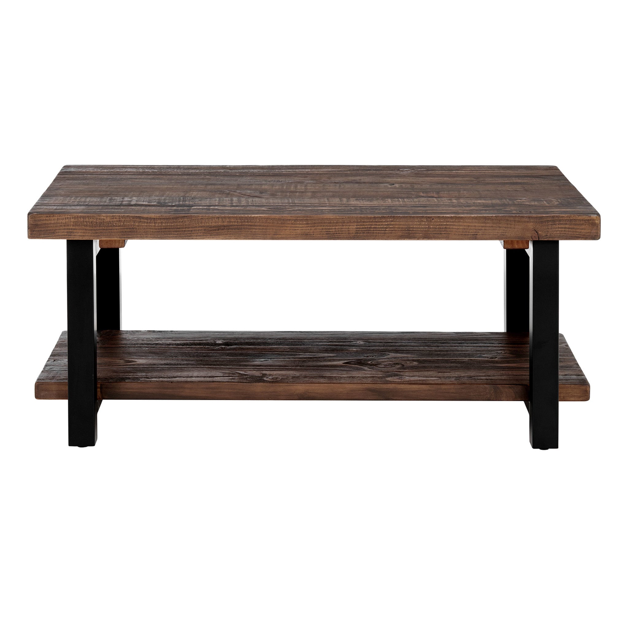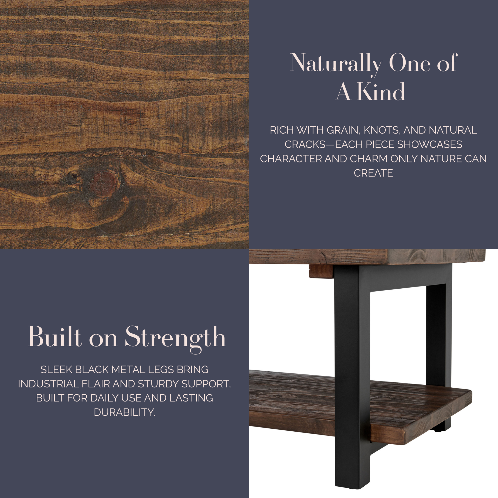 The Pomona collection features the exquisite workmanship of a solid wood top with metal legs that will last for years to come. Each piece is constructed of solid pine wood and finished to have the appearance of reclaimed wood. The reclaimed wood finish highlights natural wood variations such as cracks and knots which add to the piece's character. Any item in this collection will add to the rustic industrial style of any space. Pomona Coffee Table has a rustic and natural style; measuring 42 inches in width it provides plenty of space for your decorating needs. Its solid pine wood tops look like reclaimed wood. Knots, cracks and imperfections add to the character of your piece. Strong, powder-coated steel legs make a statement in your living space.
