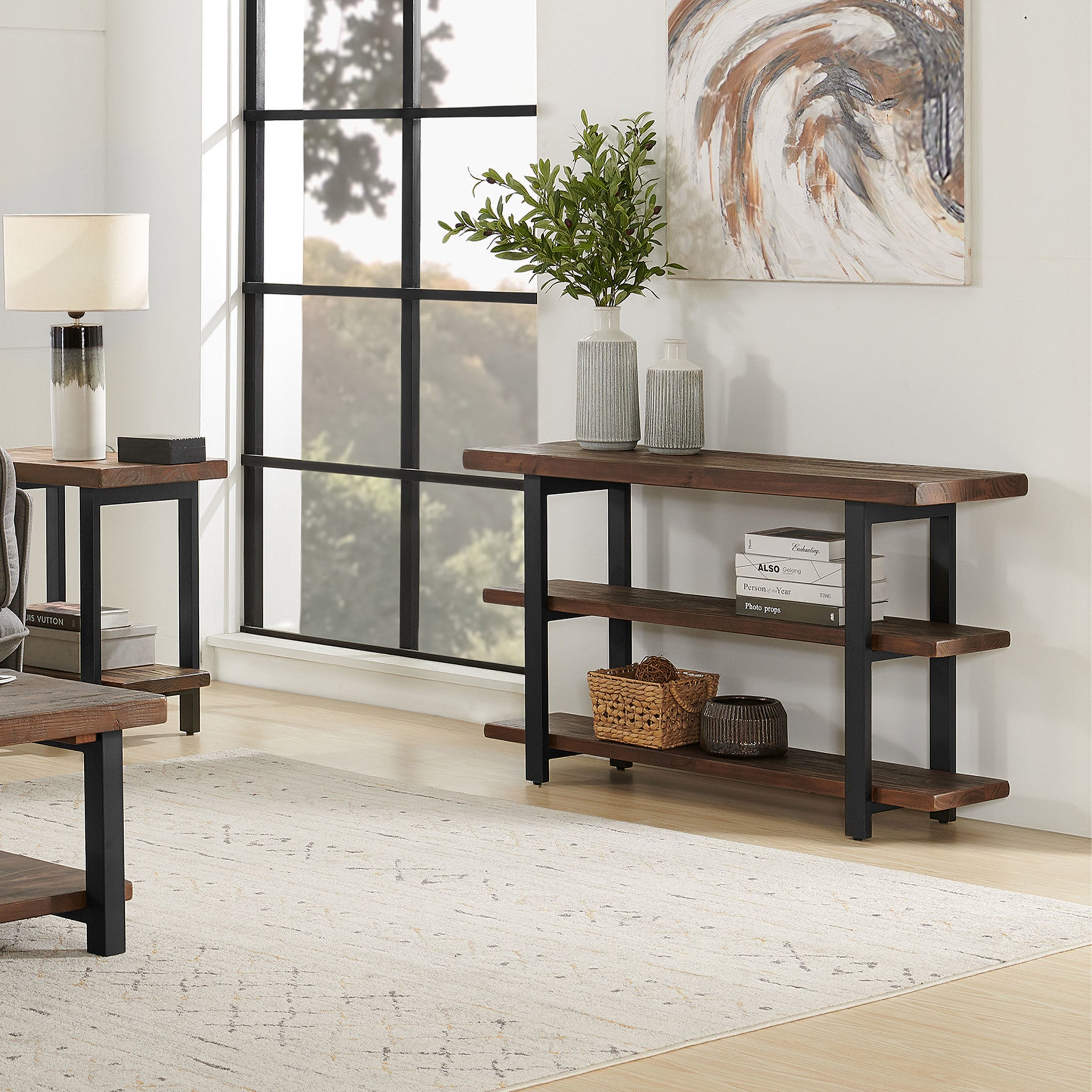 The Pomona collection features the exquisite workmanship of a solid wood top with metal legs that will last for years to come. Each piece is constructed of solid pine wood and finished to have the appearance of reclaimed wood. The reclaimed wood finish highlights natural wood variations such as cracks and knots which add to the piece's character. Any item in this collection will add to the rustic industrial style of any space. Pomona Media/Console table is versatile for any space. Crafted for both large and small areas, this sturdy design will keep you organized or showcase your 40" television in a sleek profile.