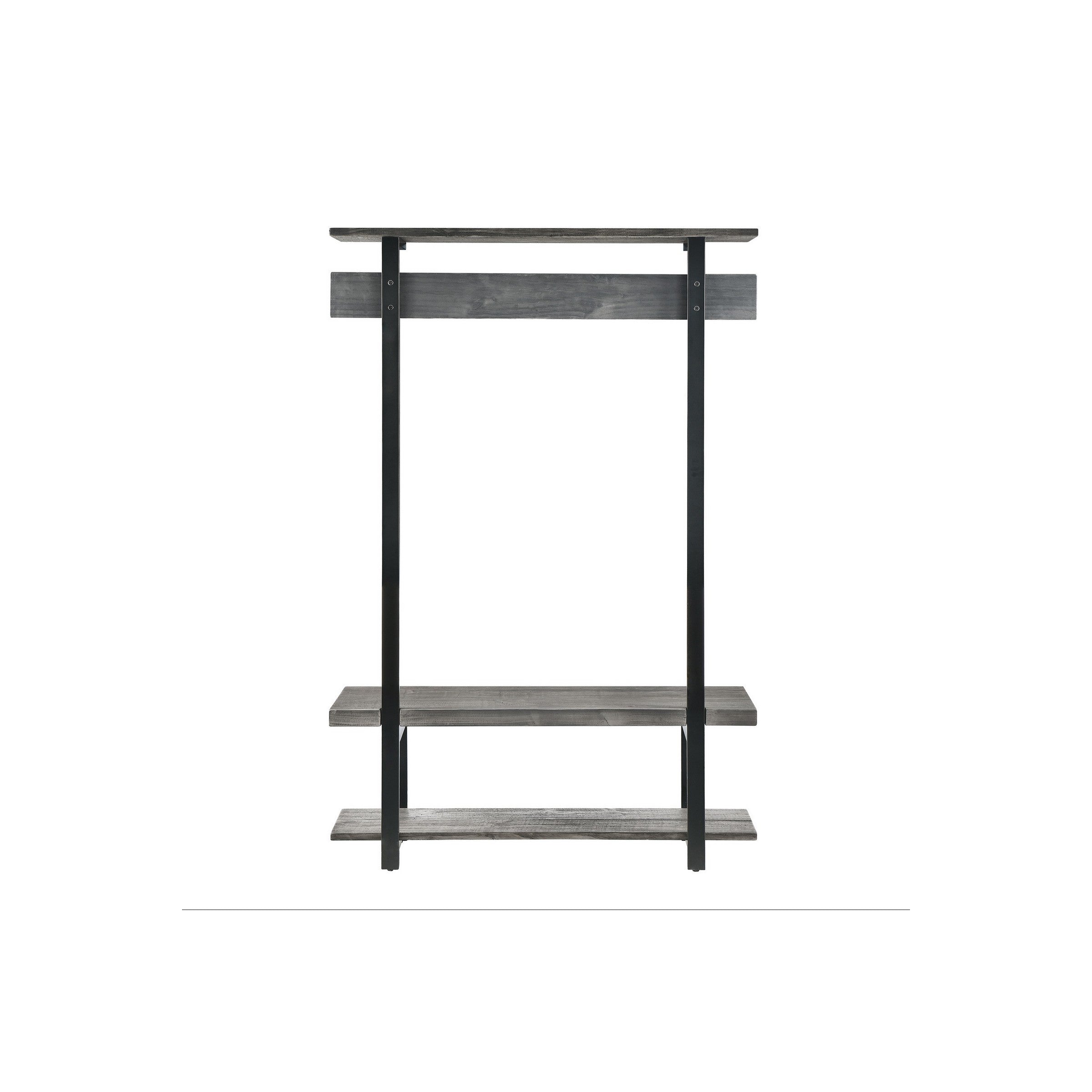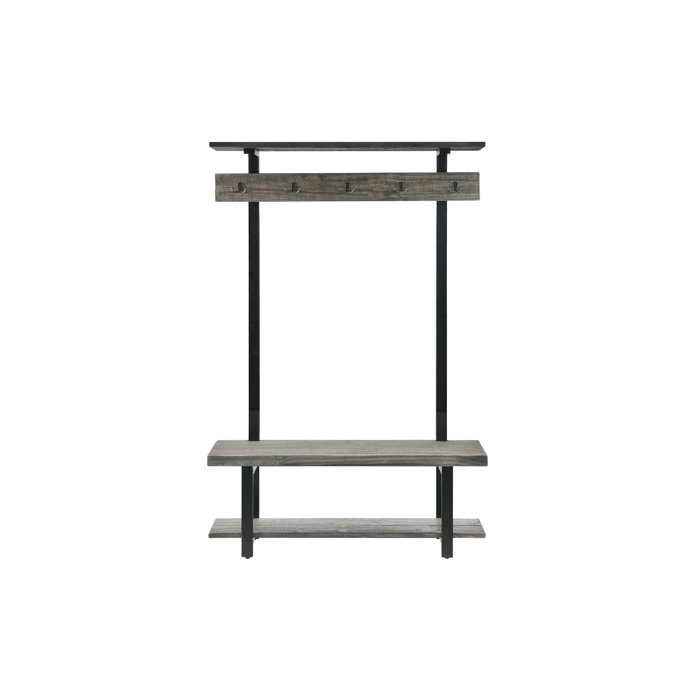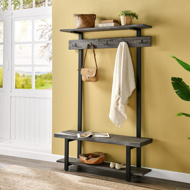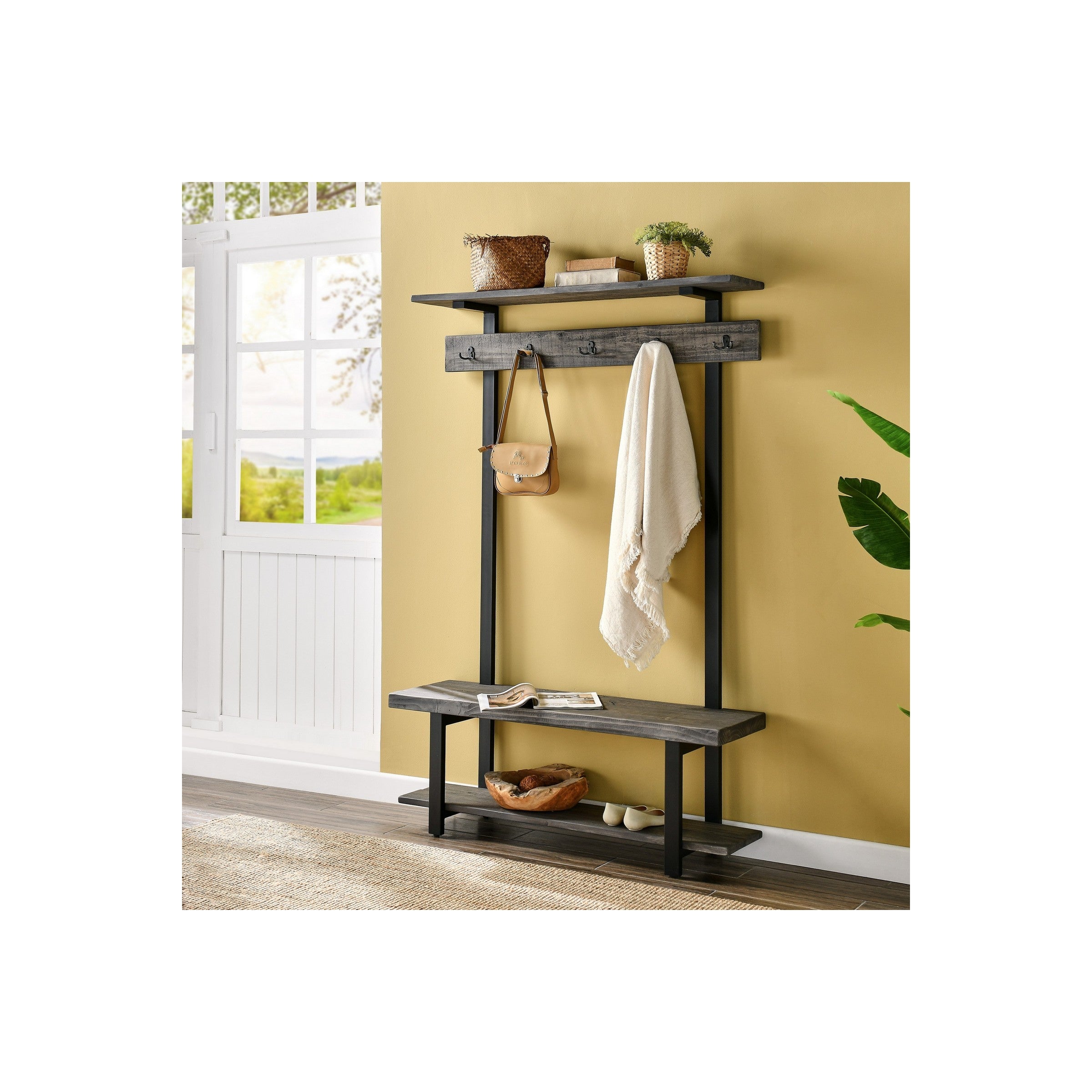 The Pomona collection features the exquisite workmanship of a solid wood top with metal legs that will last for years to come. Each piece is constructed of solid pine wood and finished to have the appearance of reclaimed wood. The reclaimed wood finish highlights natural wood variations such as cracks and knots which add to the piece's character. Any item in this collection will add to the rustic industrial style of any space. 48"Wide Hall Tree has a rustic, modern style. Extremely versatile with its slim profile for your entryway, hall, laundry or guest room. Hooks are strong enough for jackets and bags. Includes 5-double coat hooks.