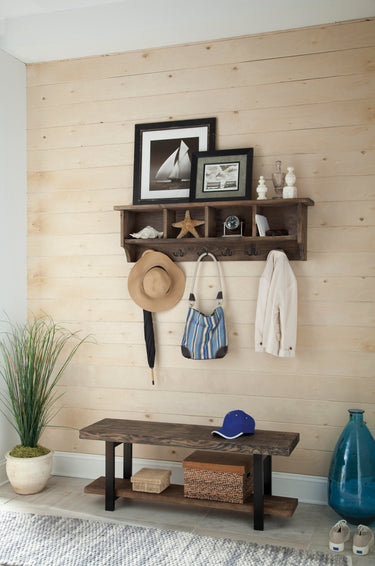 The Pomona collection features the exquisite workmanship of a solid wood top with metal legs that will last for years to come. Each piece is constructed of solid pine wood and finished to have the appearance of reclaimed wood. The reclaimed wood finish highlights natural wood variations such as cracks and knots which add to the piece's character. Any item in this collection will add to the rustic industrial style of any space. 48" Coat Hook has a rustic, modern style. Extremely versatile for your entryway, hall, laundry or guest room. The cubbies allow you to store hats, gloves, etc. and the hooks are strong enough for jackets and packs. Pomona Bench is versatile and perfect for your entryway, dining, or living room.