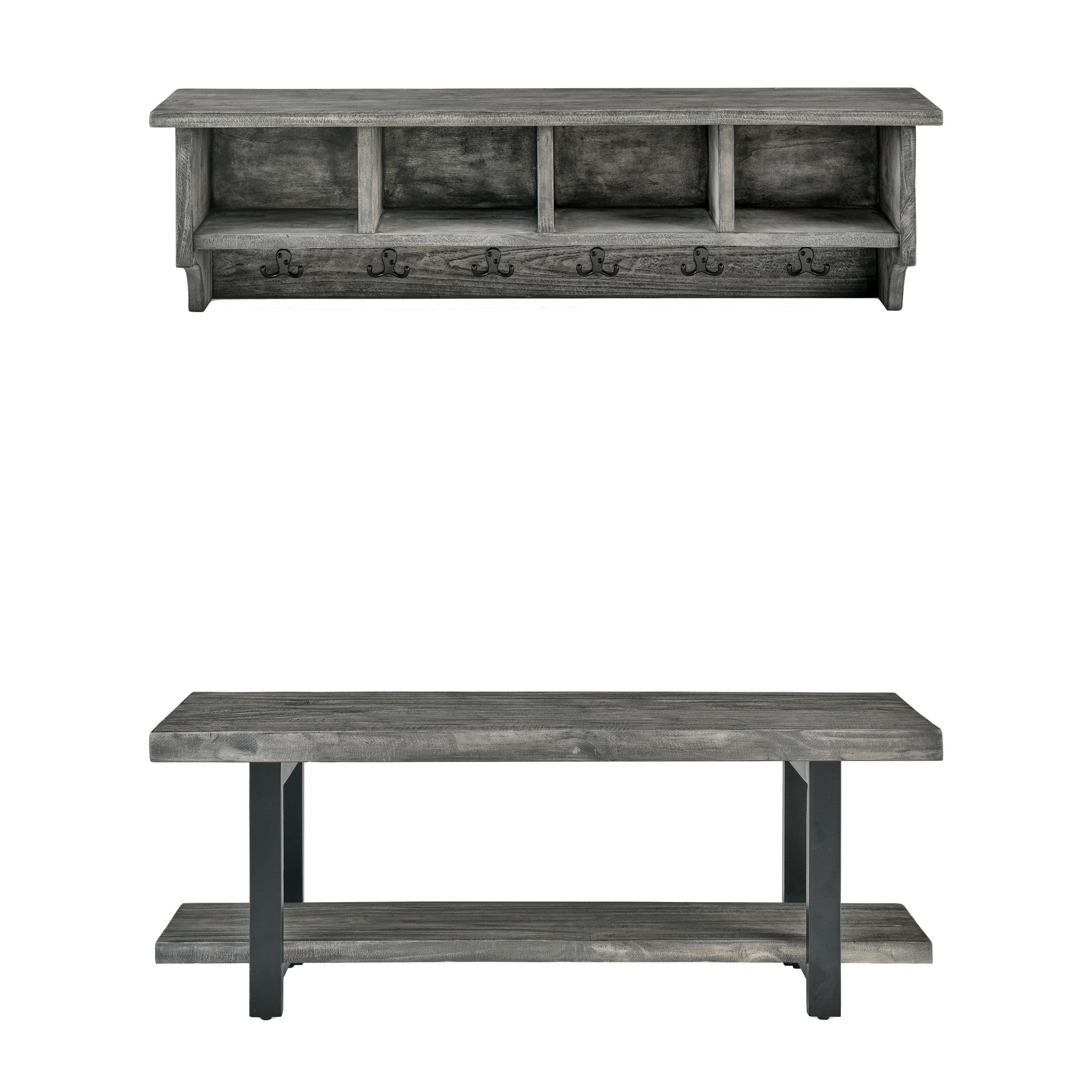 - [CRAFTED FOR DURABILITY] Made from solid pine with metal accents, the Pomona 48" coat hook and bench set stands up to daily wear; the reclaimed wood finish adds industrial flair with unique knots and cracks for a one-of-a-kind look