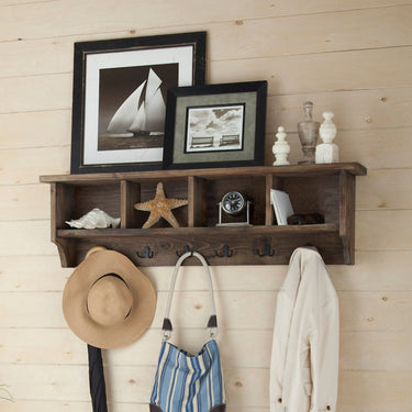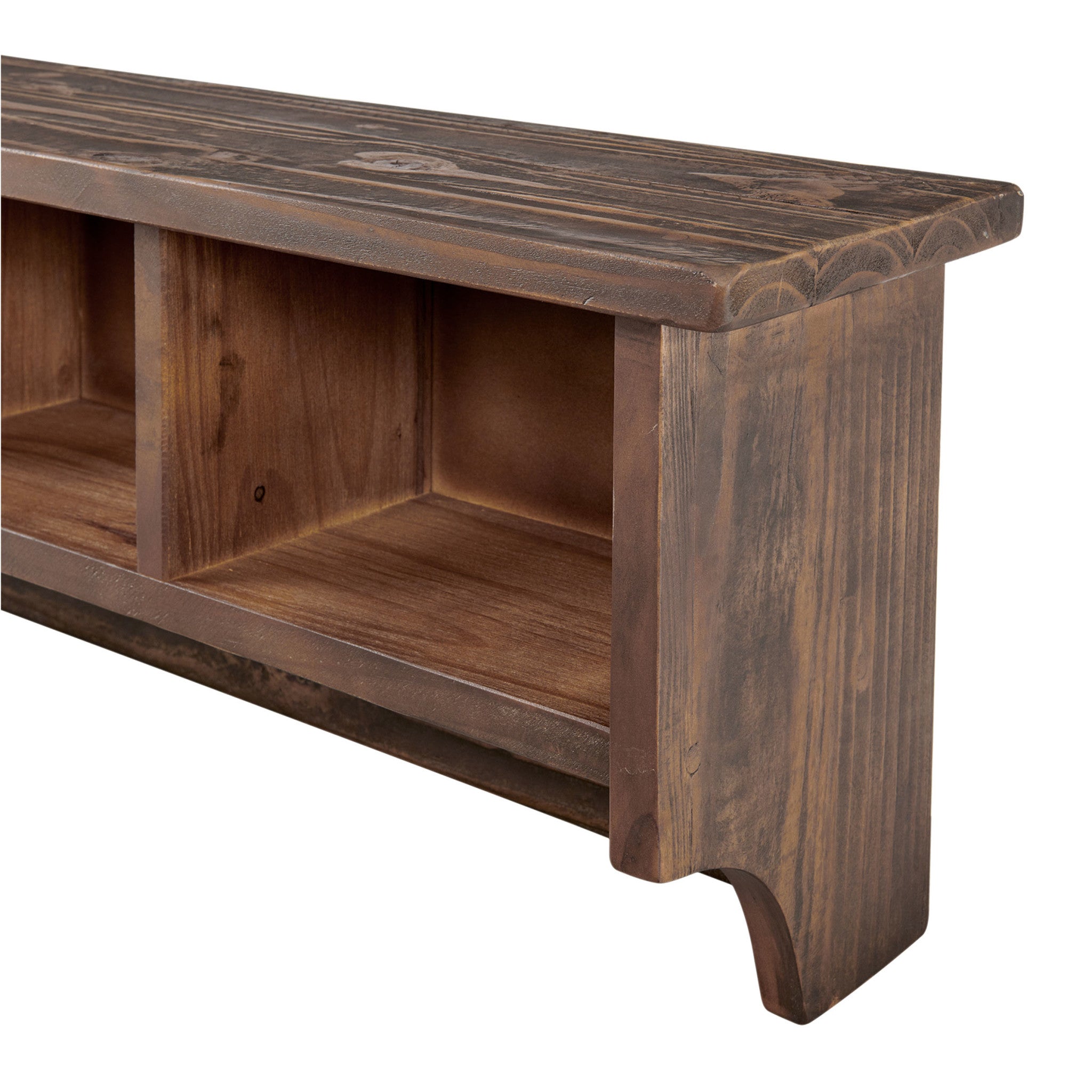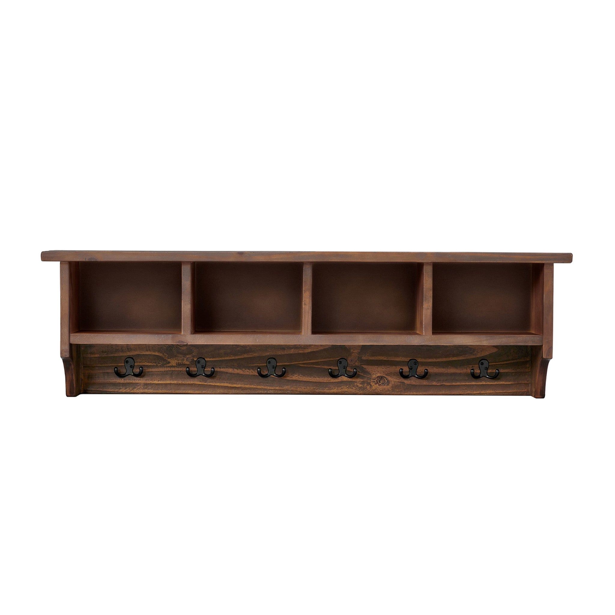 • PRODUCT DETAILS - Materials: Solid Pine Wood, and Metal. Overall Dimension: (L) 48" x (W) 14" x (H) 9", Each Cubby: (L) 10" x (W) 7" x (H) 6.75", Coat Hook Clearance: (L) 6.25". Weight Capacity: 150lbs. Color: Rustic Natural.