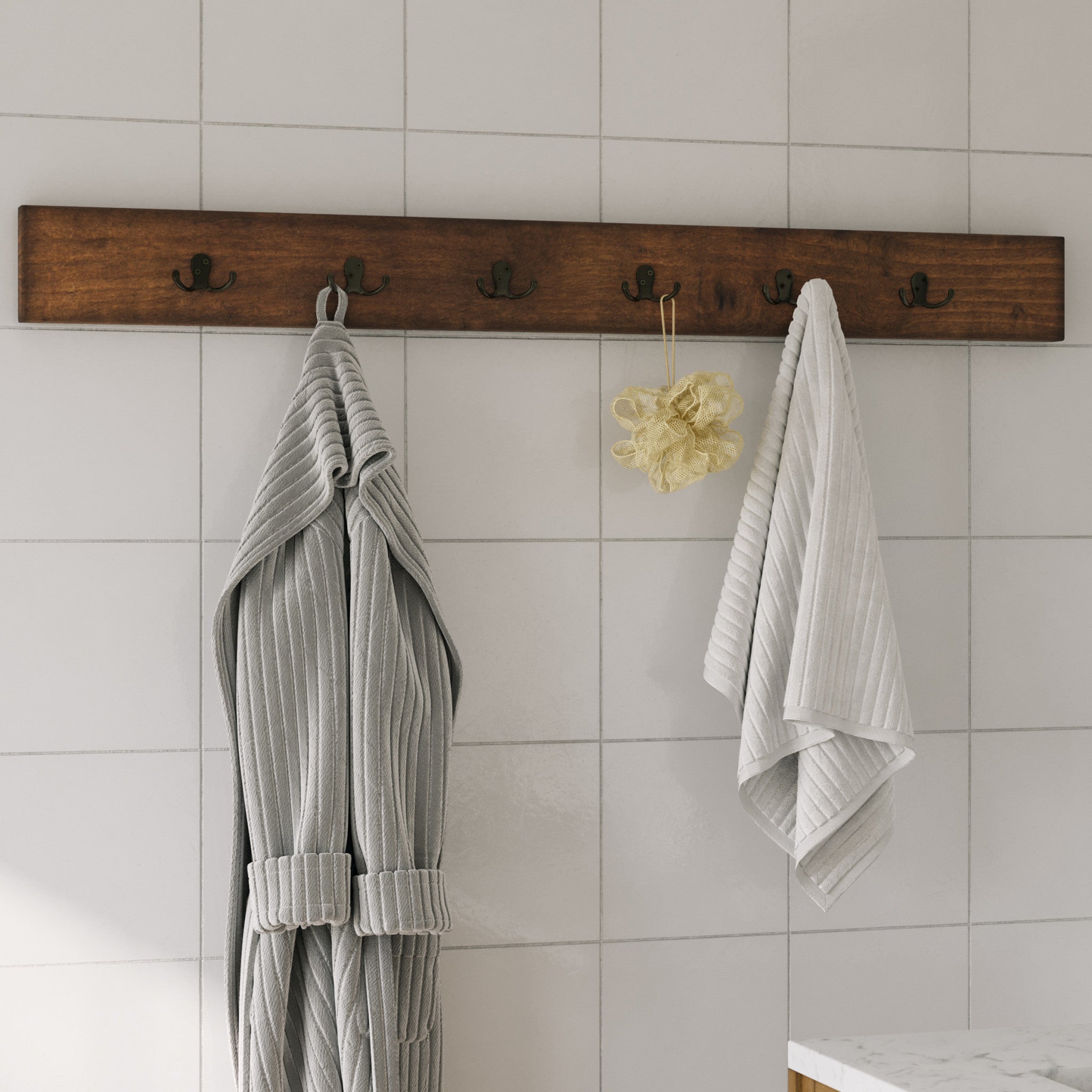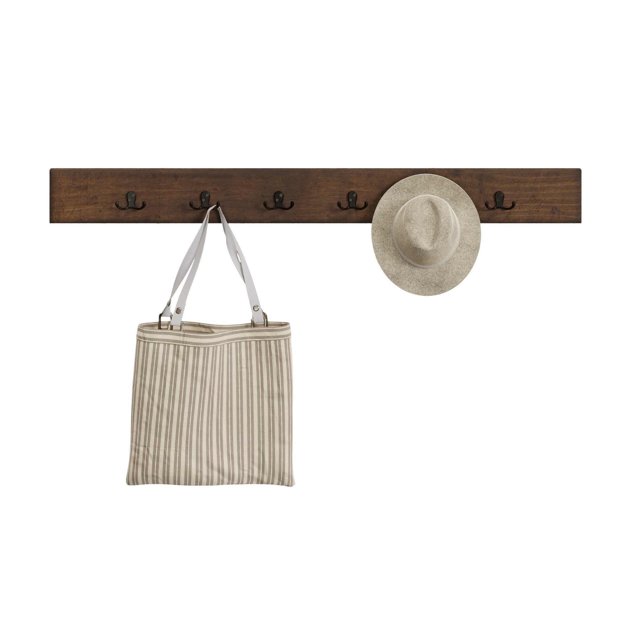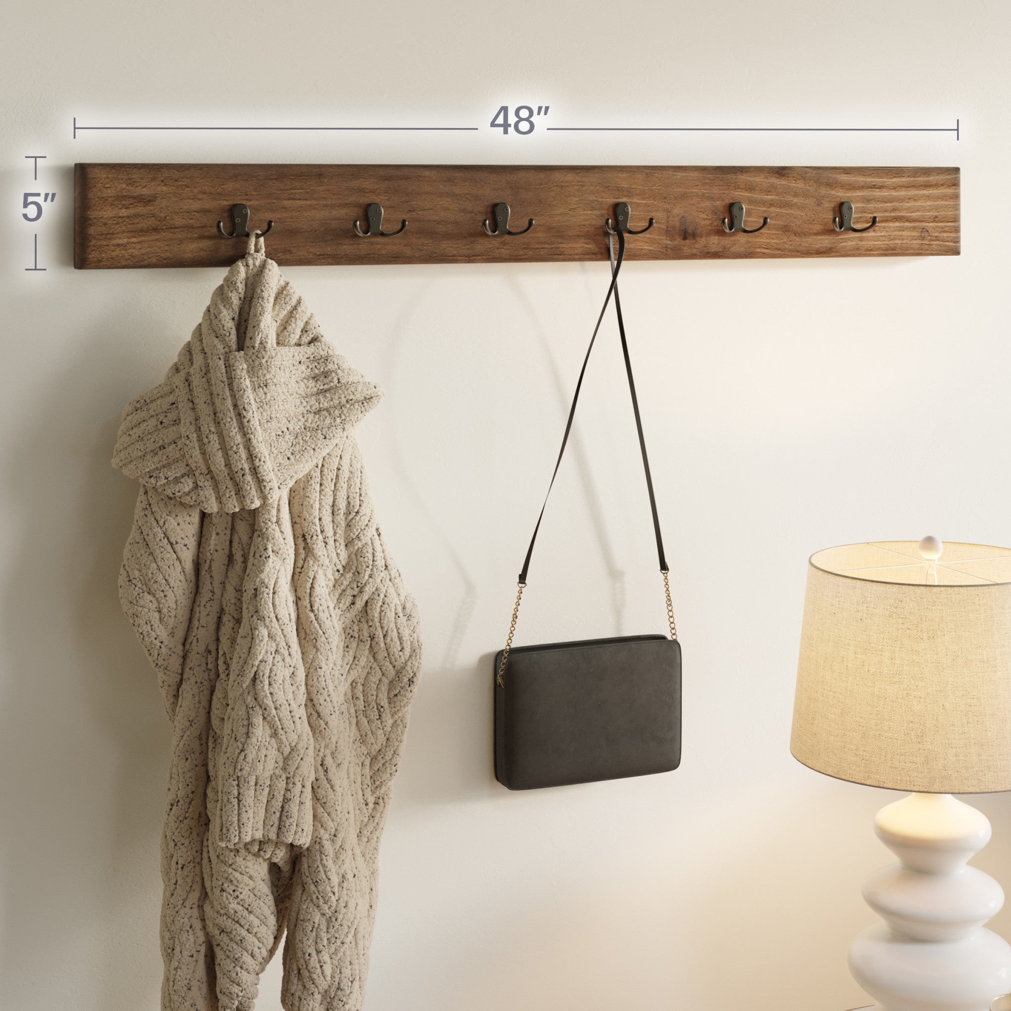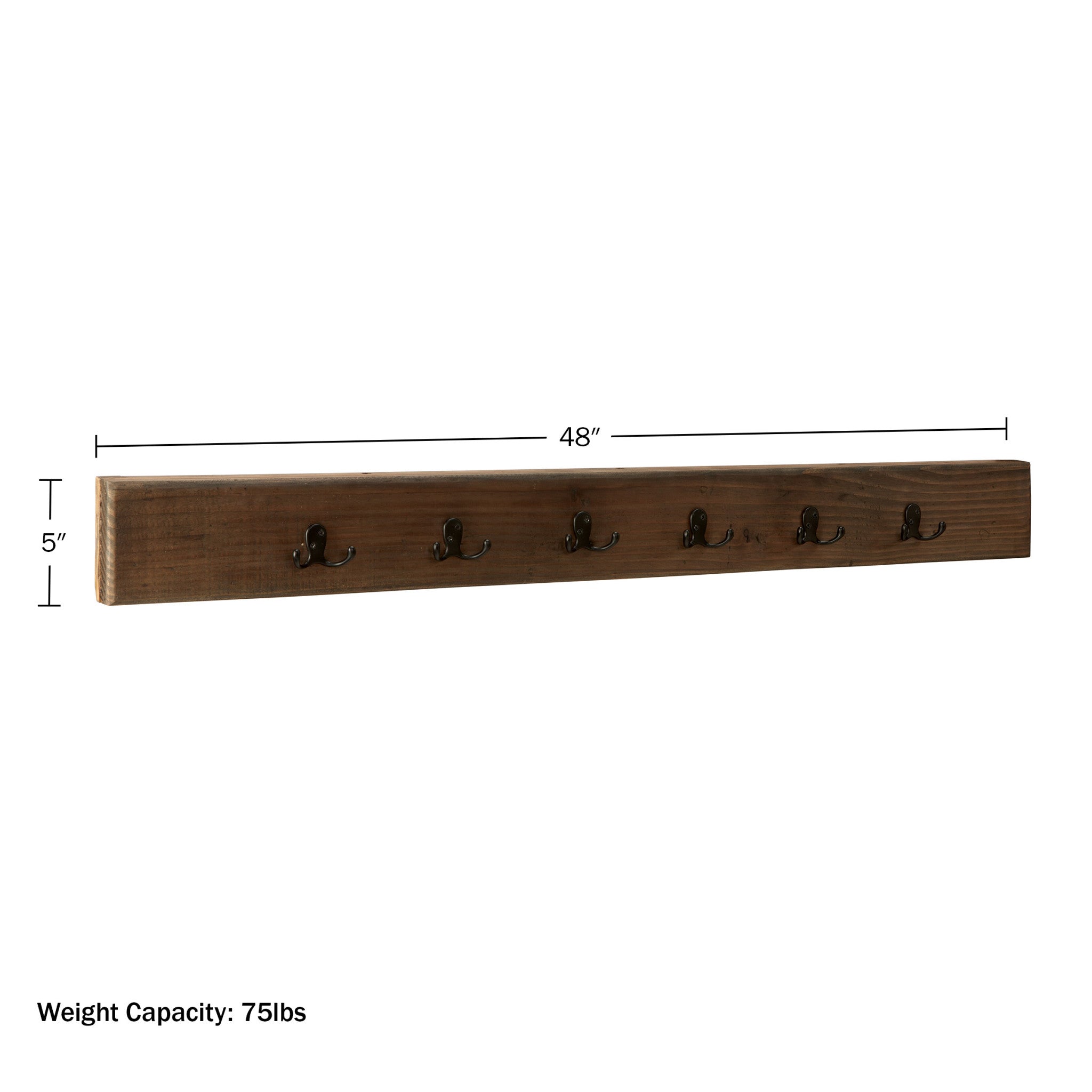 • PRODUCT DETAILS – Materials: Solid Pine Wood and Metal. Overall Dimension: (L) 48" x (W) 1.5" x (H) 5", Coat Hook clearance: (L) 7.5". Weight Capacity: 75lbs. Includes 6 coat hooks and French cleat. Color: Natural.
