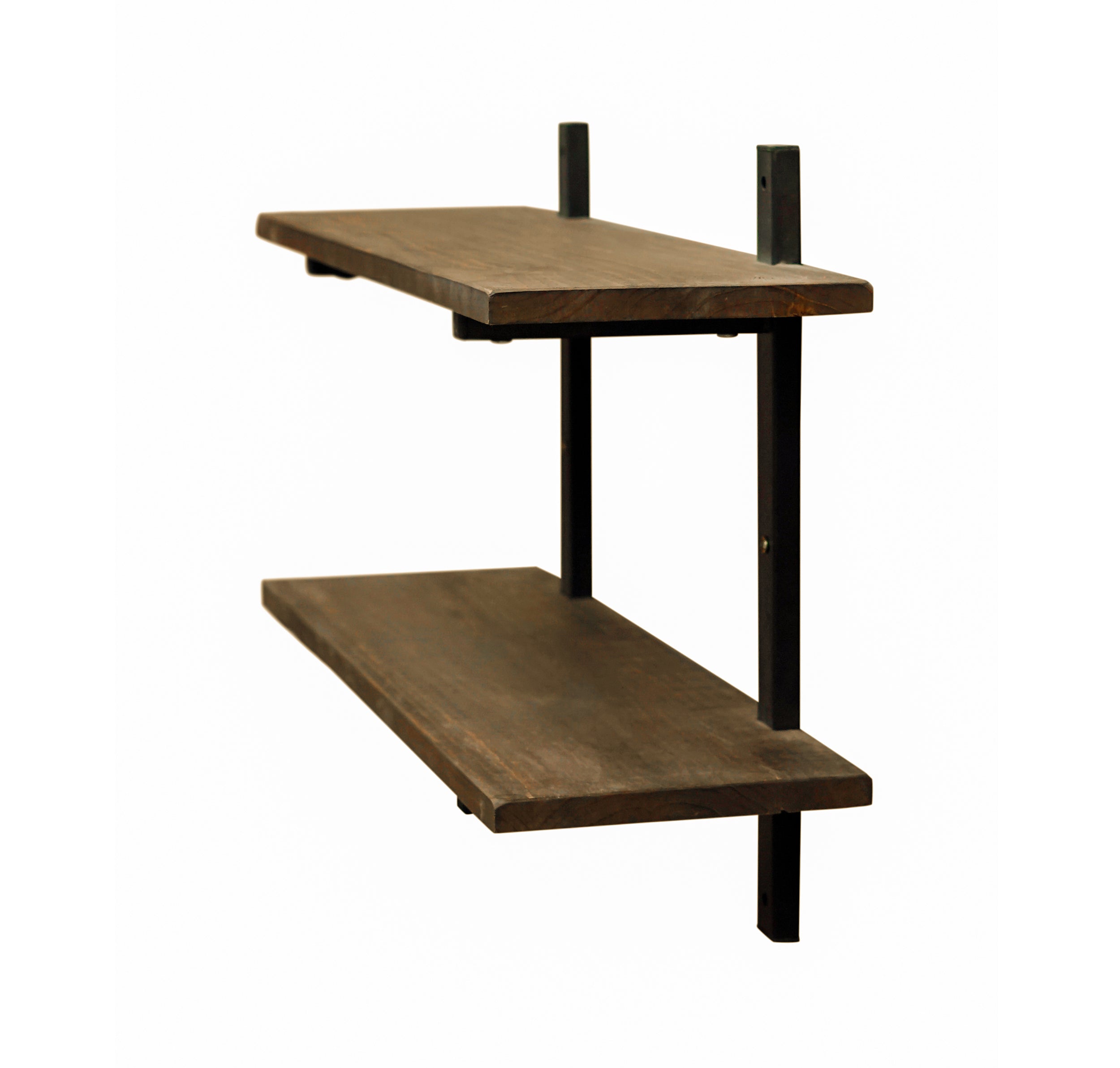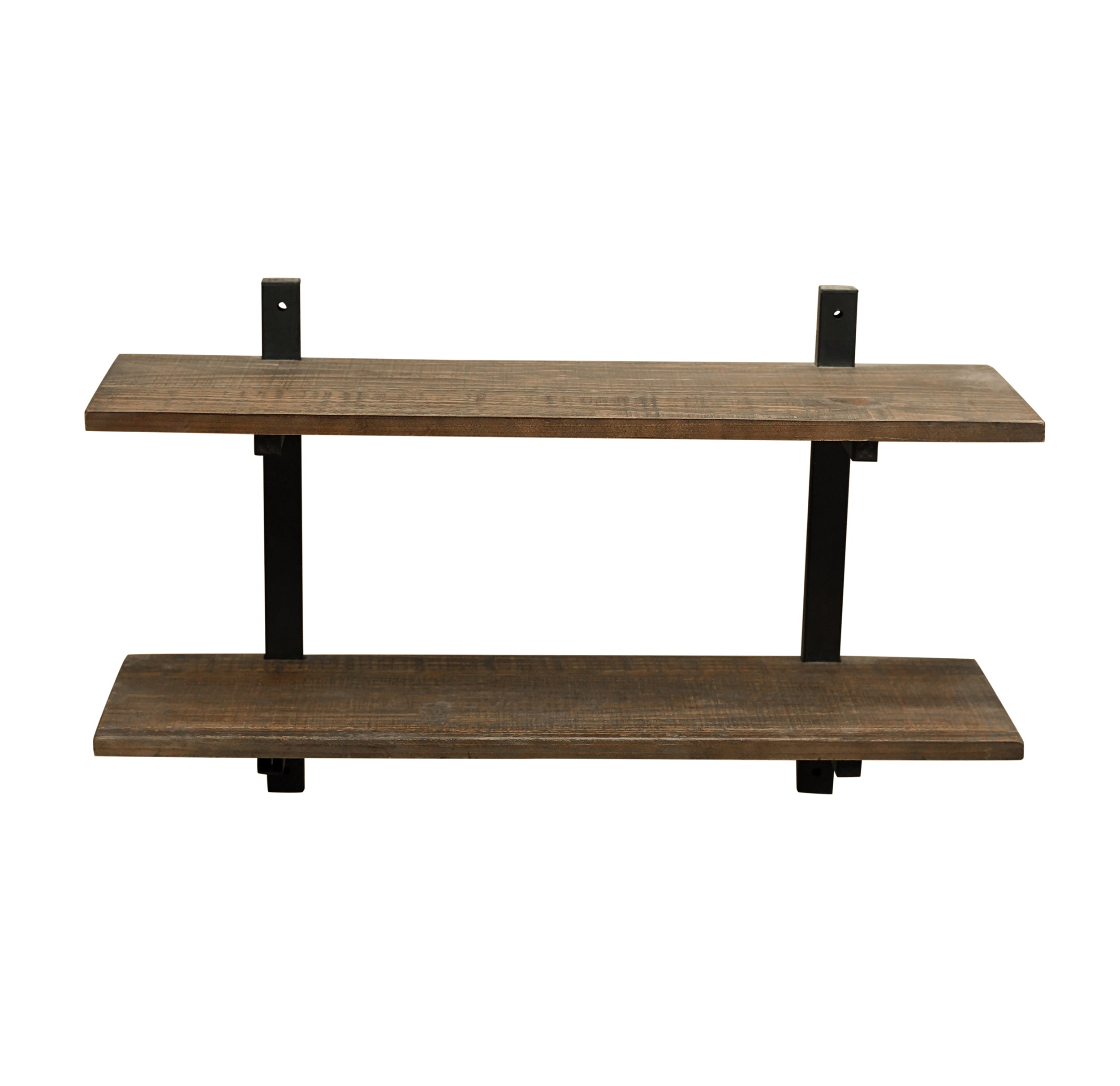 The Pomona collection features the exquisite workmanship of a solid wood top with metal legs that will last for years to come. Each piece is constructed of solid pine wood and finished to have the appearance of reclaimed wood. The reclaimed wood finish highlights natural wood variations such as cracks and knots which add to the piece's character. Any item in this collection will add to the rustic industrial style of any space. At 36"W x 23"H this 2-shelf wall shelf will make a strong statement in your living space. Its solid wood shelves and strong metal supports are the perfect display space for your modern farmhouse style.