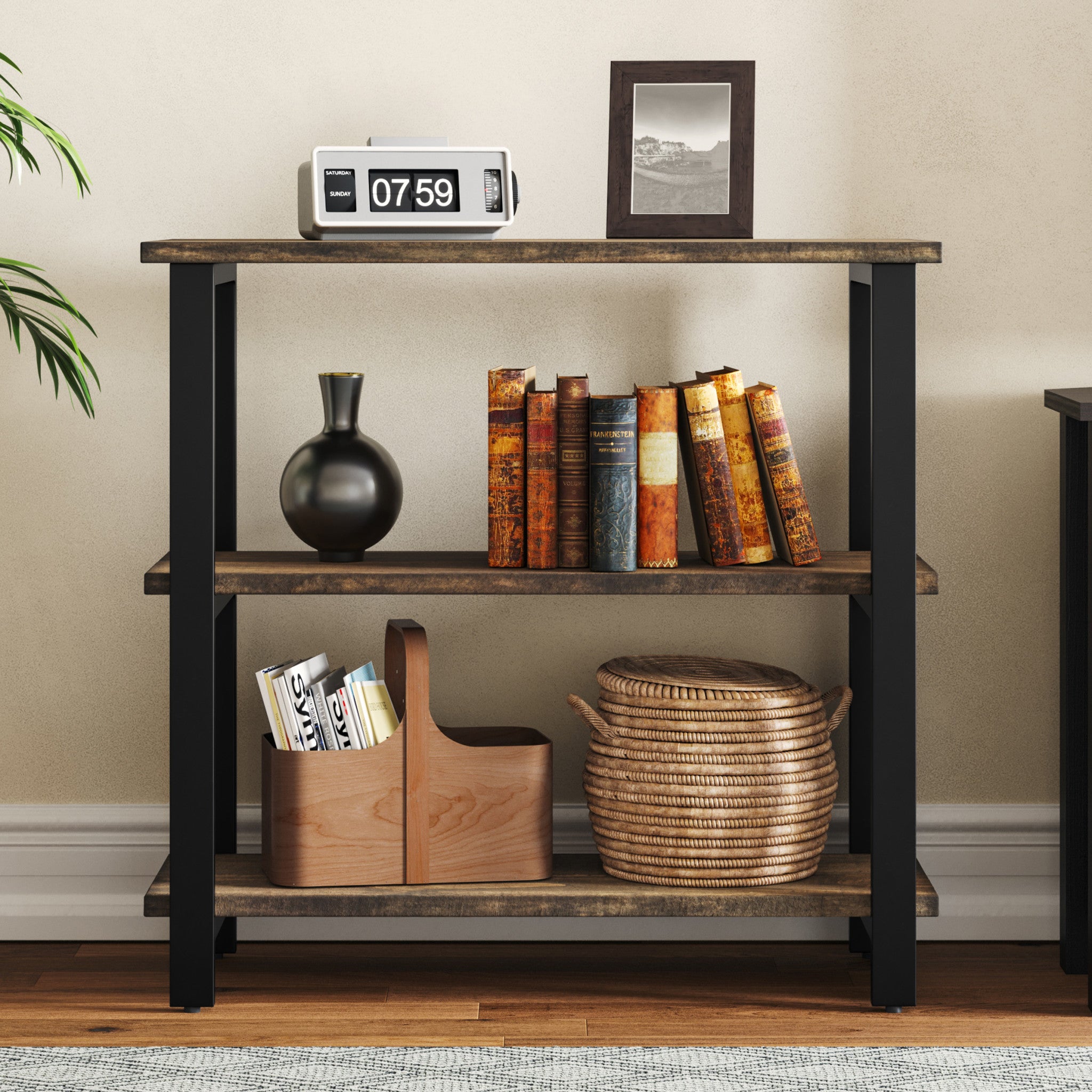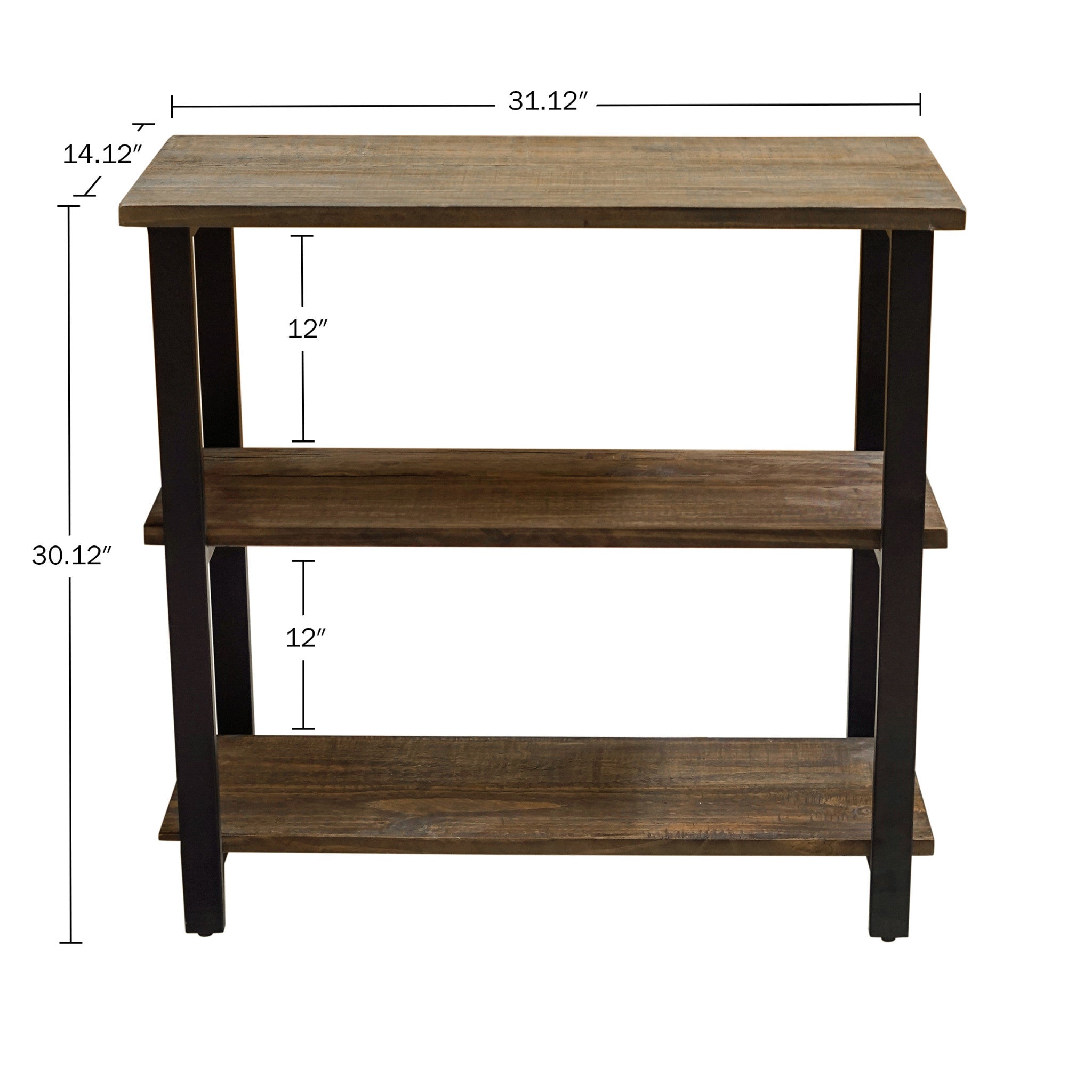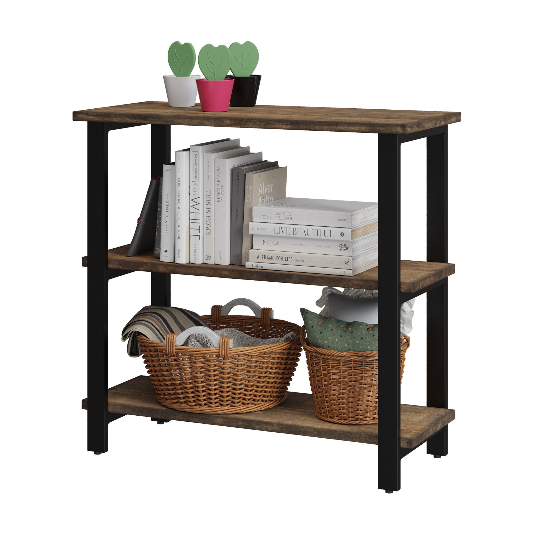 - 3-TIER BOOKCASE – Bring character and warmth into your home with the Pomona 31" Tall 3-Tier Bookcase. Featuring a reclaimed wood look with natural variations in grain, knots, and texture, paired with a sleek black metal frame, this under-window bookcase blends rustic farmhouse and industrial style for a timeless accent in any space.