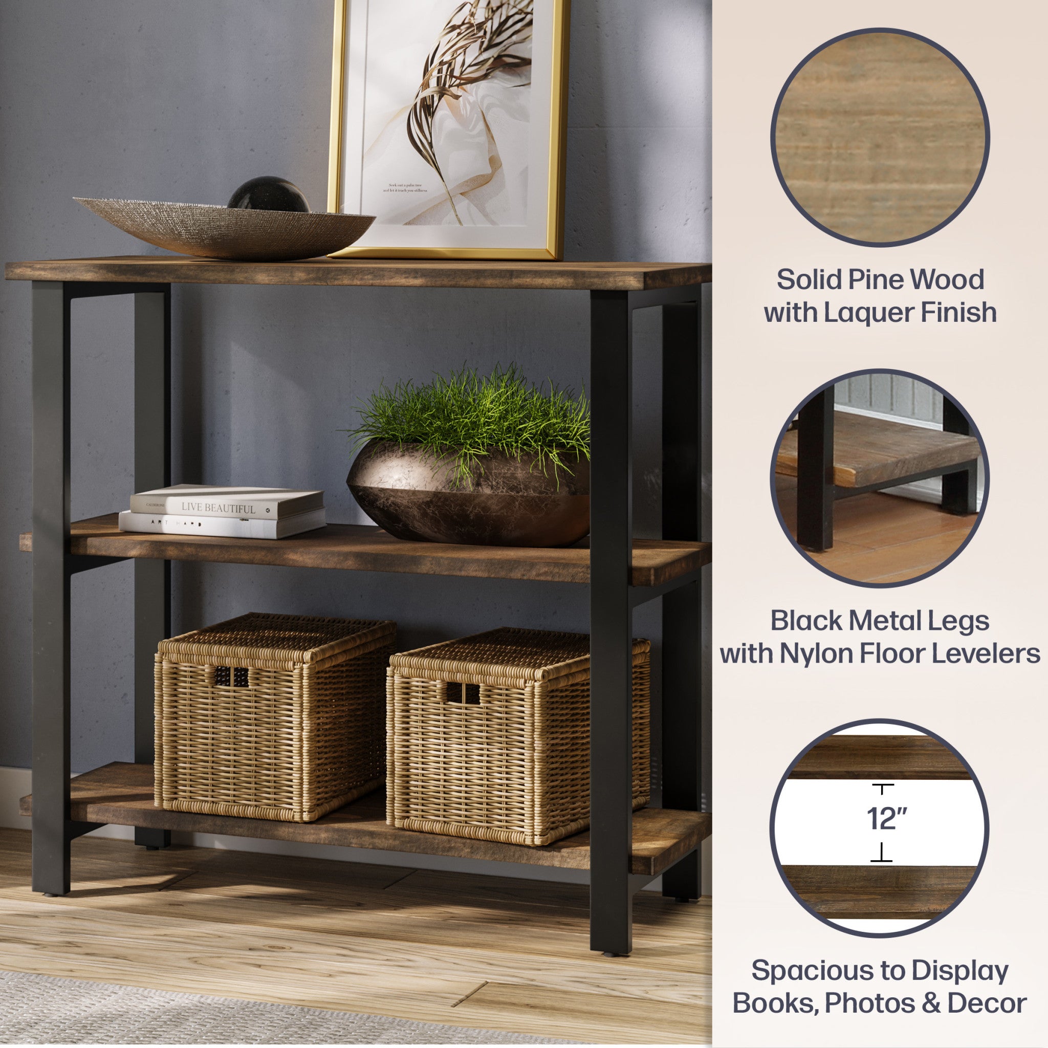 - VERSATILE STORAGE & DISPLAY – Whether styled as a reading nook under a window, a storage piece in your office, or a display shelf in the entryway, the Pomona 3-tier bookcase provides both function and style. Nylon floor levelers keep it stable on uneven surfaces, making it as practical as it is beautiful.