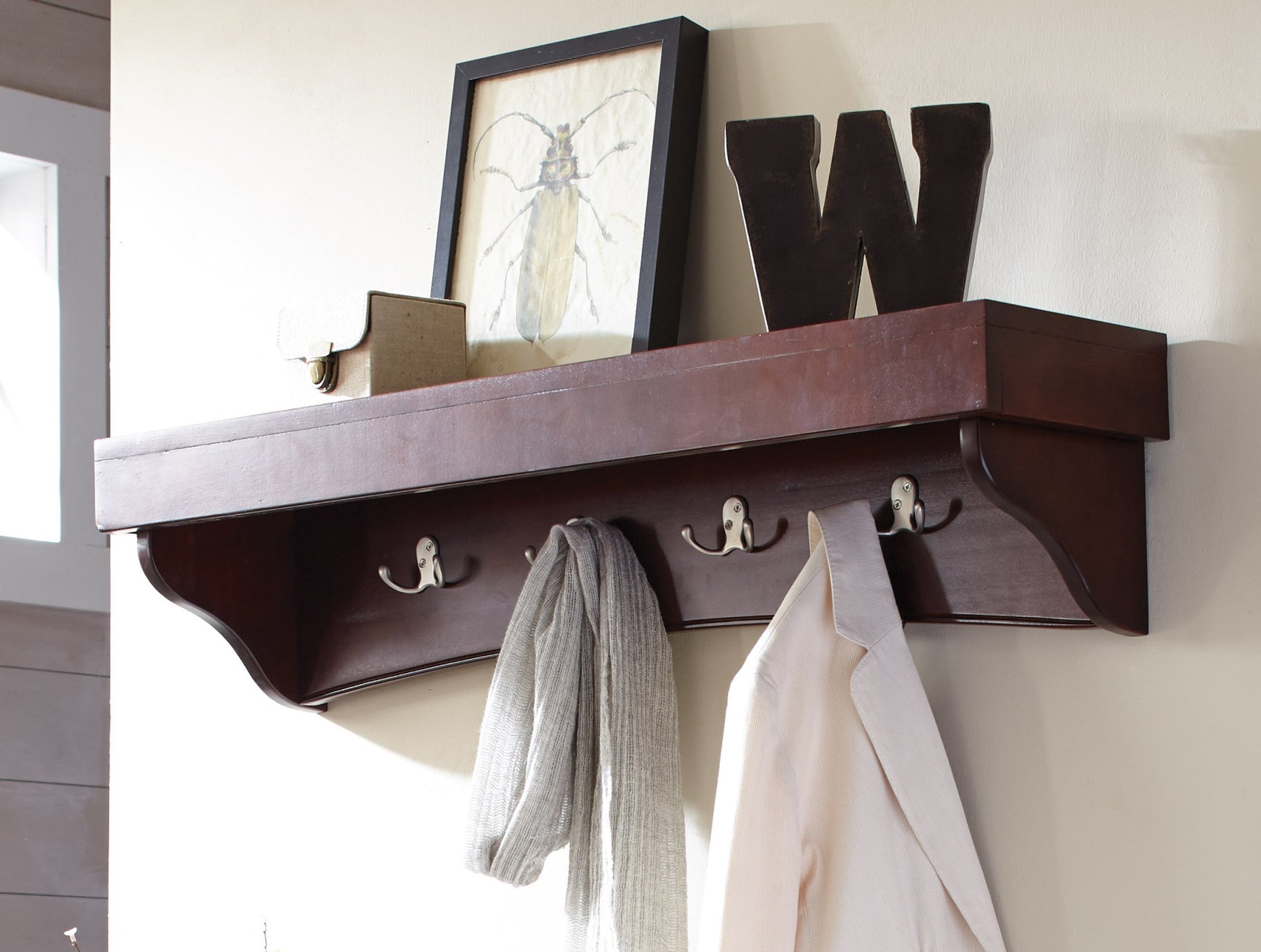 - [DECORATIVE AND PRACTICAL] The Shaker Cottage Coat Hooks come with a stylish espresso finish and convenient tray shelf, ideal for organizing coats and accessories while enhancing the functionality of your entryway
