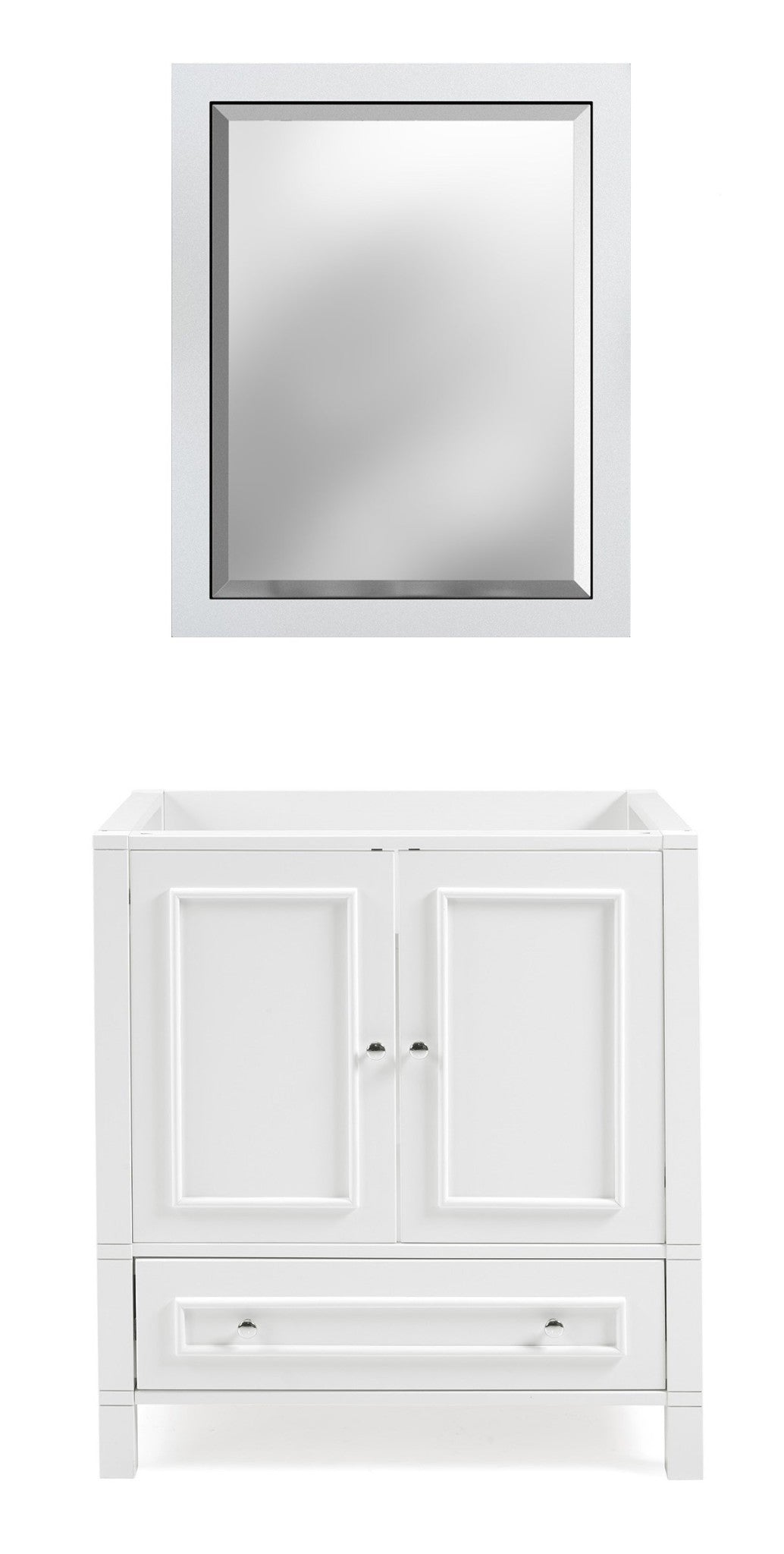 - Add detailed elegance and quality construction to your bathroom remodel with this bathroom sink cabinet set by Alaterre, which includes a white vanity with a matching mirror