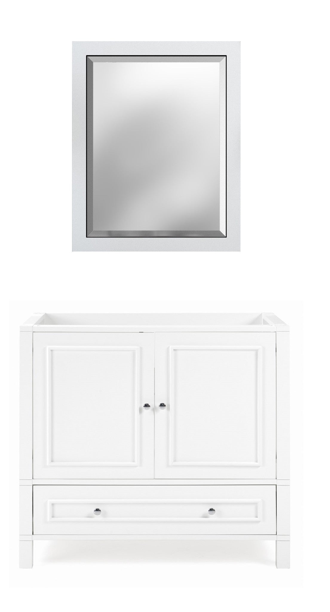 • Add detailed elegance and quality construction to your bathroom remodel with this bathroom sink cabinet set by Alaterre, which includes a white vanity with a matching mirror