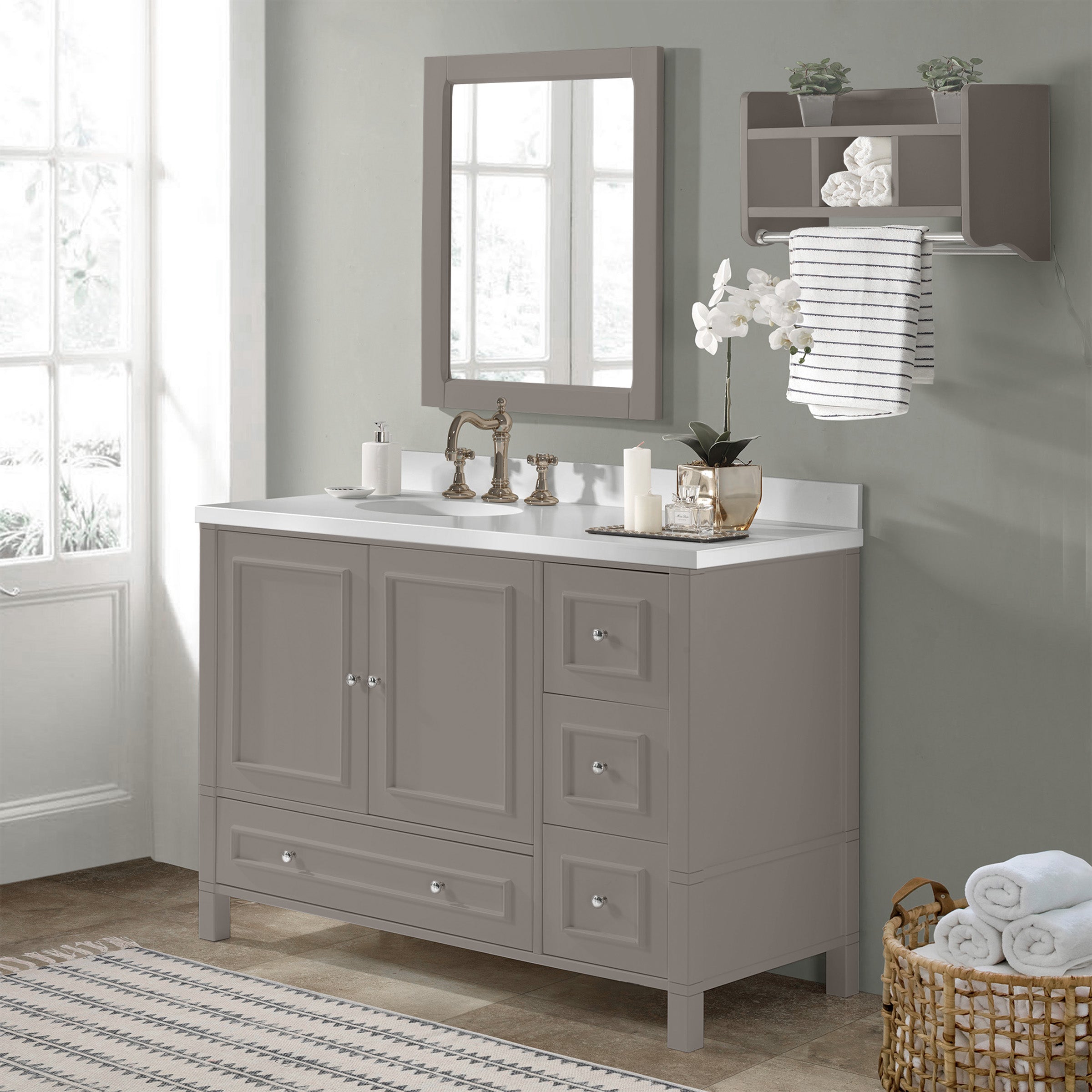 • The 48-inch bath vanity features soft-close doors and fits a 49-inch-wide by 22-inch-deep top with 1 side-set sink basin (not included)