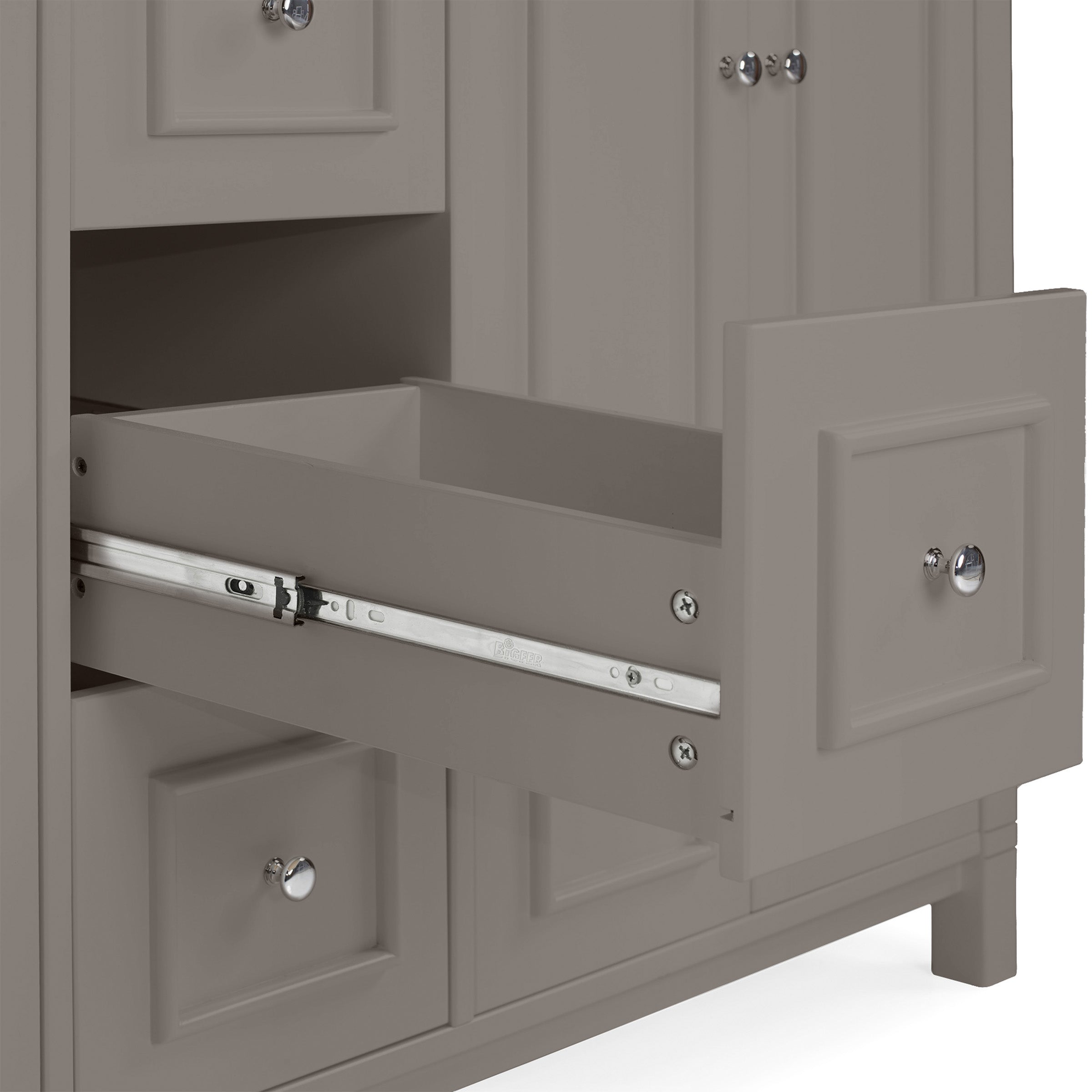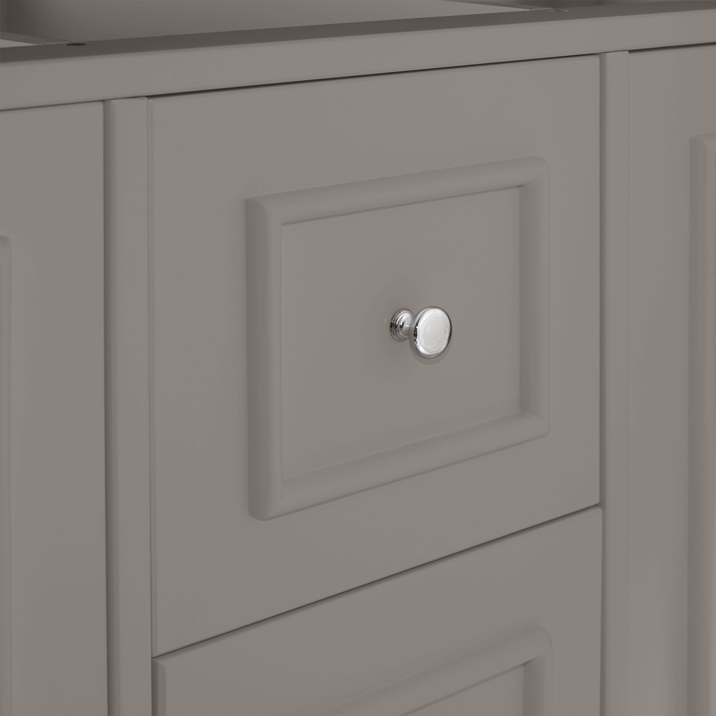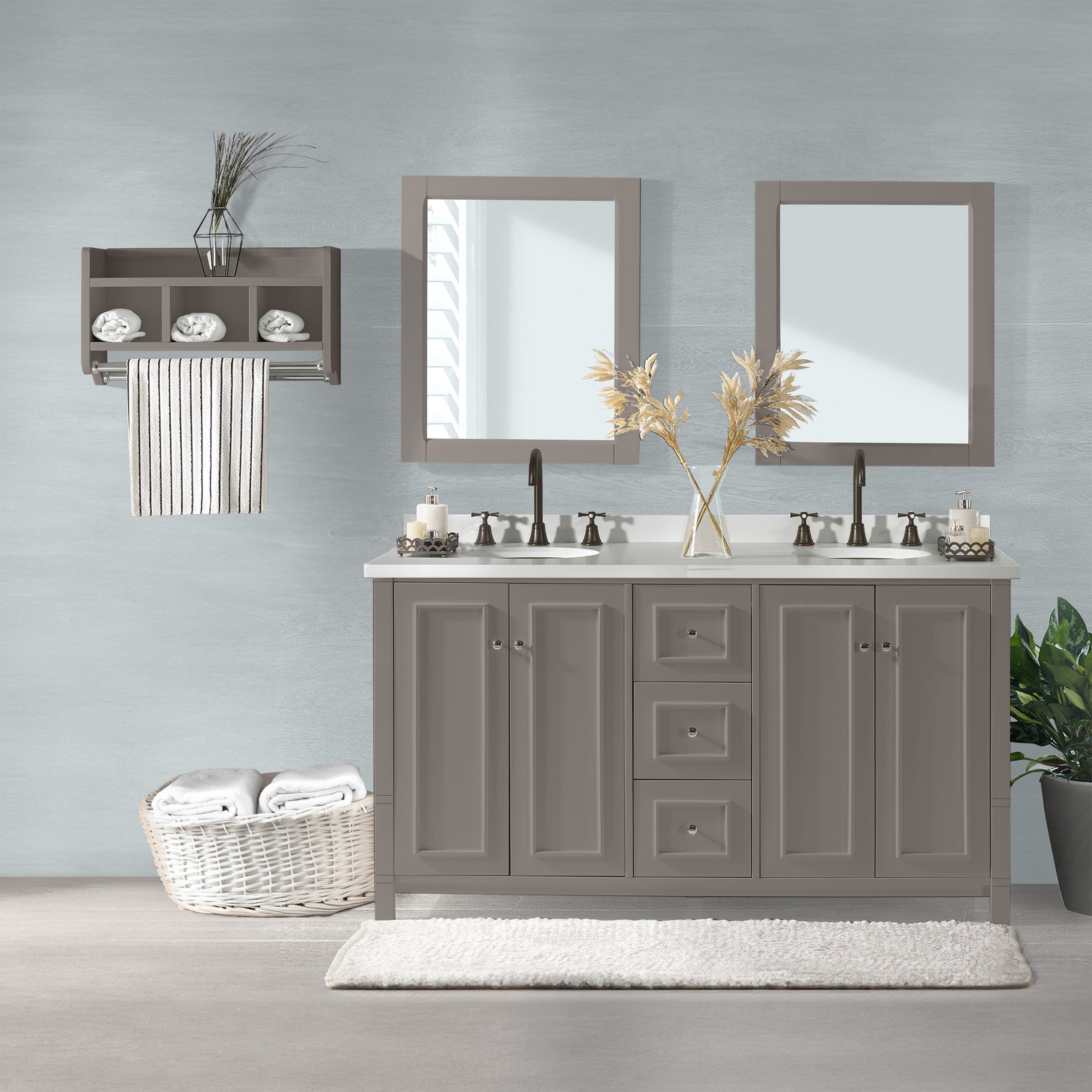 Update your bath with the detailed elegance of the Williamsburg 60” Double Sink Vanity 4-piece Set by Alaterre Furniture. Constructed from solid pine wood and composite wood, this large vanity features soft-close doors, 3 deep center drawers, nickel hardware, and adjustable height levelers for stable installation (the top and sink are not included). The modern bathroom vanity set comes with 2 matching 24-inch-wide beveled glass vanity mirrors and a bathroom shelf with 3 cubbies and 2 towel racks to help with bathroom organization. The Williamsburg Collection from Alaterre Furniture features premium quality solid wood bathroom vanities and coordinating pieces that can be self-assembled using the included manual or by referring to our helpful assembly videos.