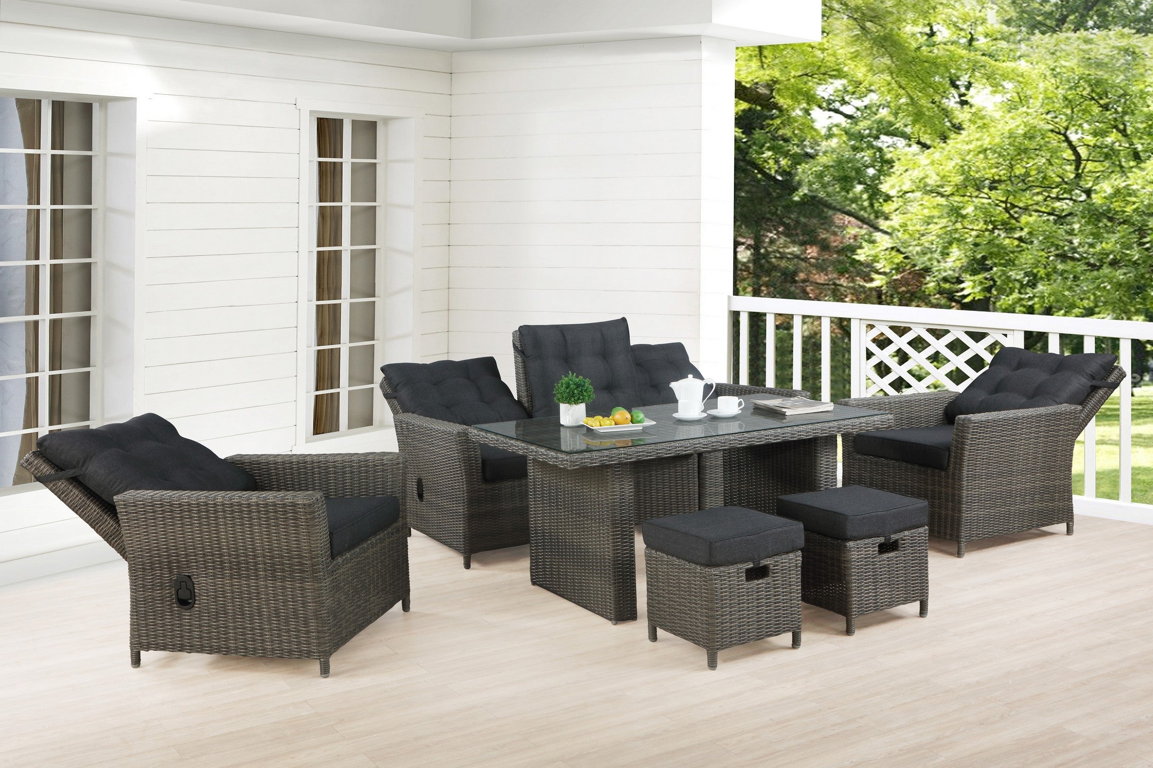 - [COMPLETE OUTDOOR COMFORT] Includes a reclining sofa with plush cushions, two reclining chairs, two ottomans for added relaxation, and a spacious 27-inch cocktail table; perfect for full-body lounging and entertaining in any patio or garden setting