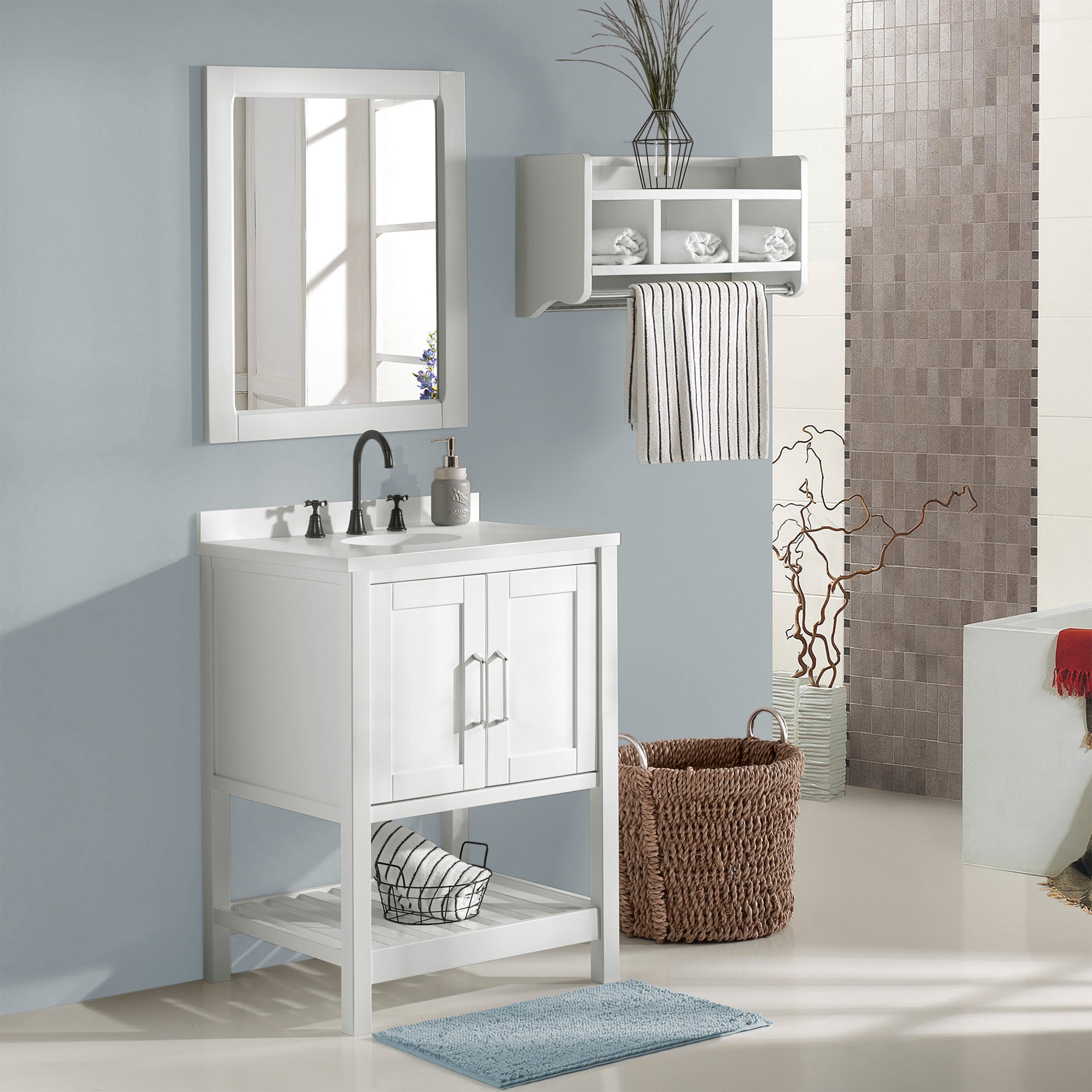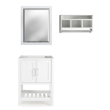 Update your bath with the fresh, clean look of the Bennet 24 Inch Bathroom Sink Vanity 3-Piece Set by Alaterre Furniture. Constructed from solid pine wood and composite wood, this small bathroom vanity features soft-close Shaker doors, an open bottom shelf, nickel hardware, and adjustable height levelers for stable installation (the top and sink are not included). The modern bathroom vanity set comes with a matching 24-inch-wide beveled glass bathroom vanity mirror and a bathroom shelf with 3 cubbies and 2 towel racks to help with bathroom organization. The Bennet Collection from Alaterre Furniture features premium quality solid wood bathroom vanities and coordinating pieces that can be self-assembled using the included manual or by referring to our helpful assembly videos.