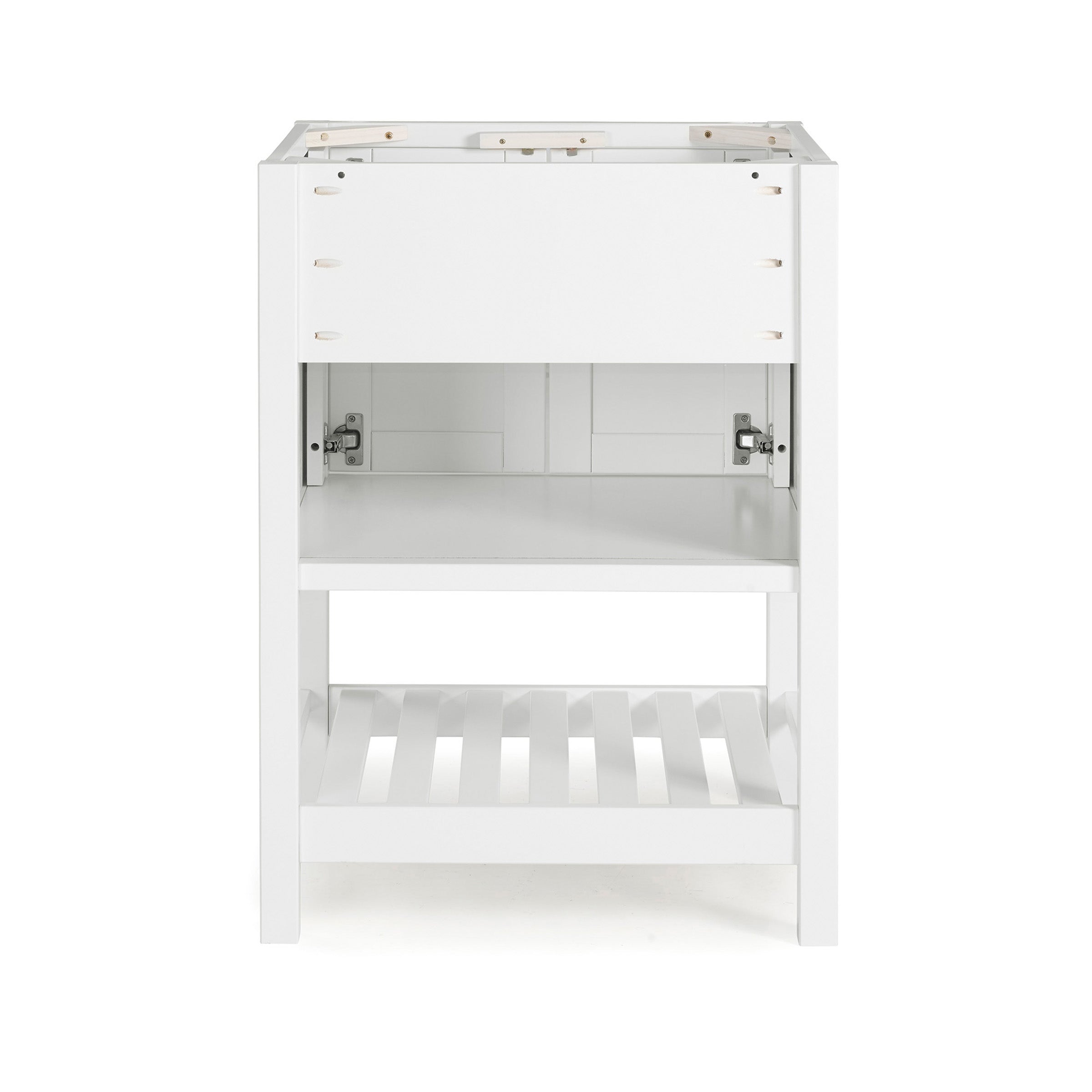 - The small-space-friendly bathroom vanity cabinet features a spacious interior and a slatted bottom shelf, providing room for towels, toiletries, or other bath essentials within a compact footprint