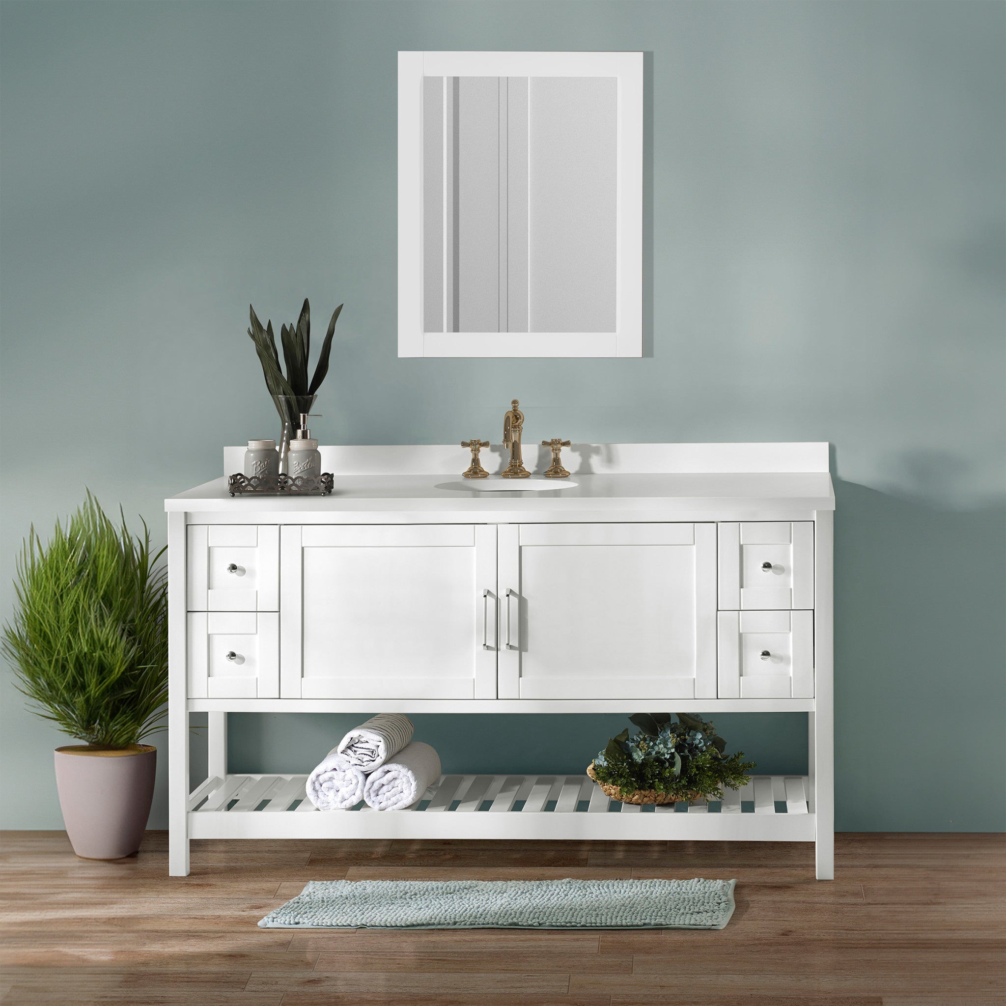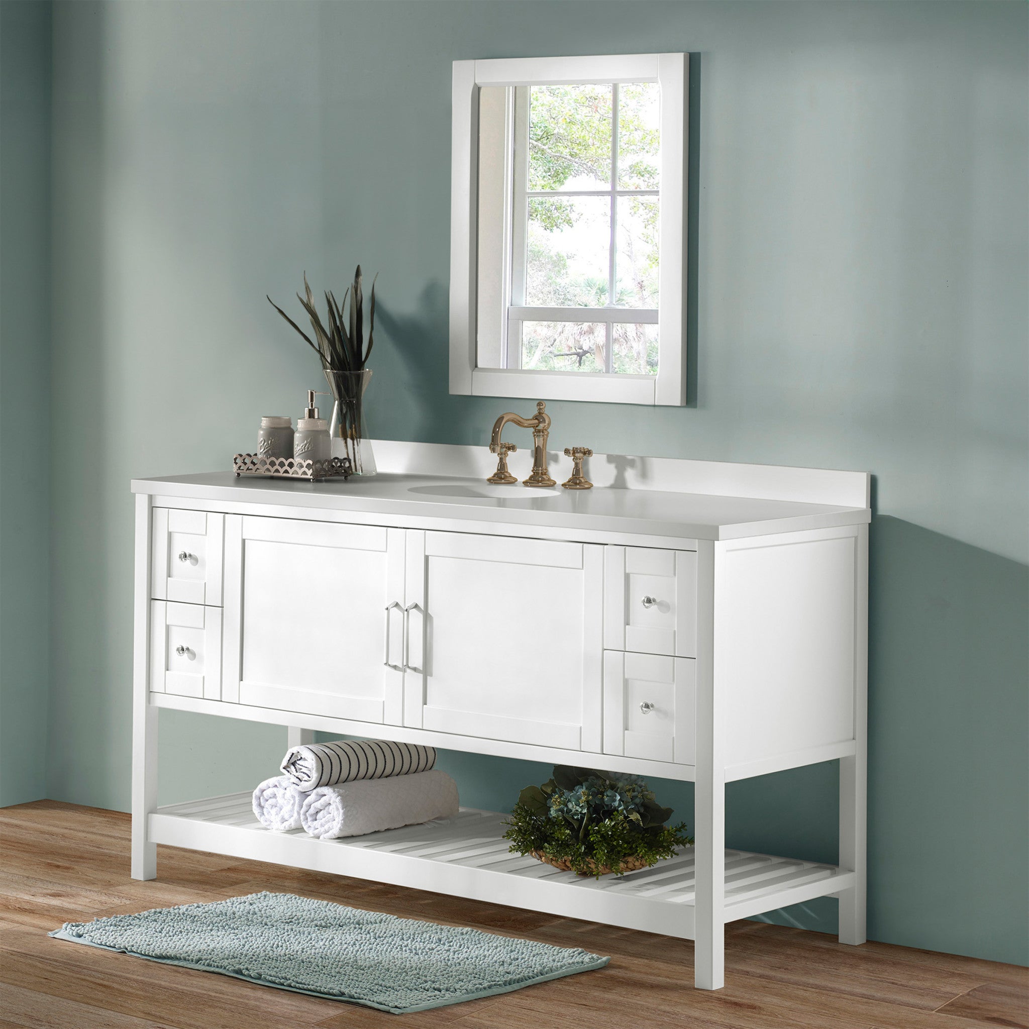 - Dimensions: Vanity: (L) 60 x (W) 21.25 x (H) 34-inches; Mirror: (L) 30 x (W) 24 x (H) 0.75-inches; Vanity Weight Capacity: 200lbs; Shelf Capacity: 35lbs
