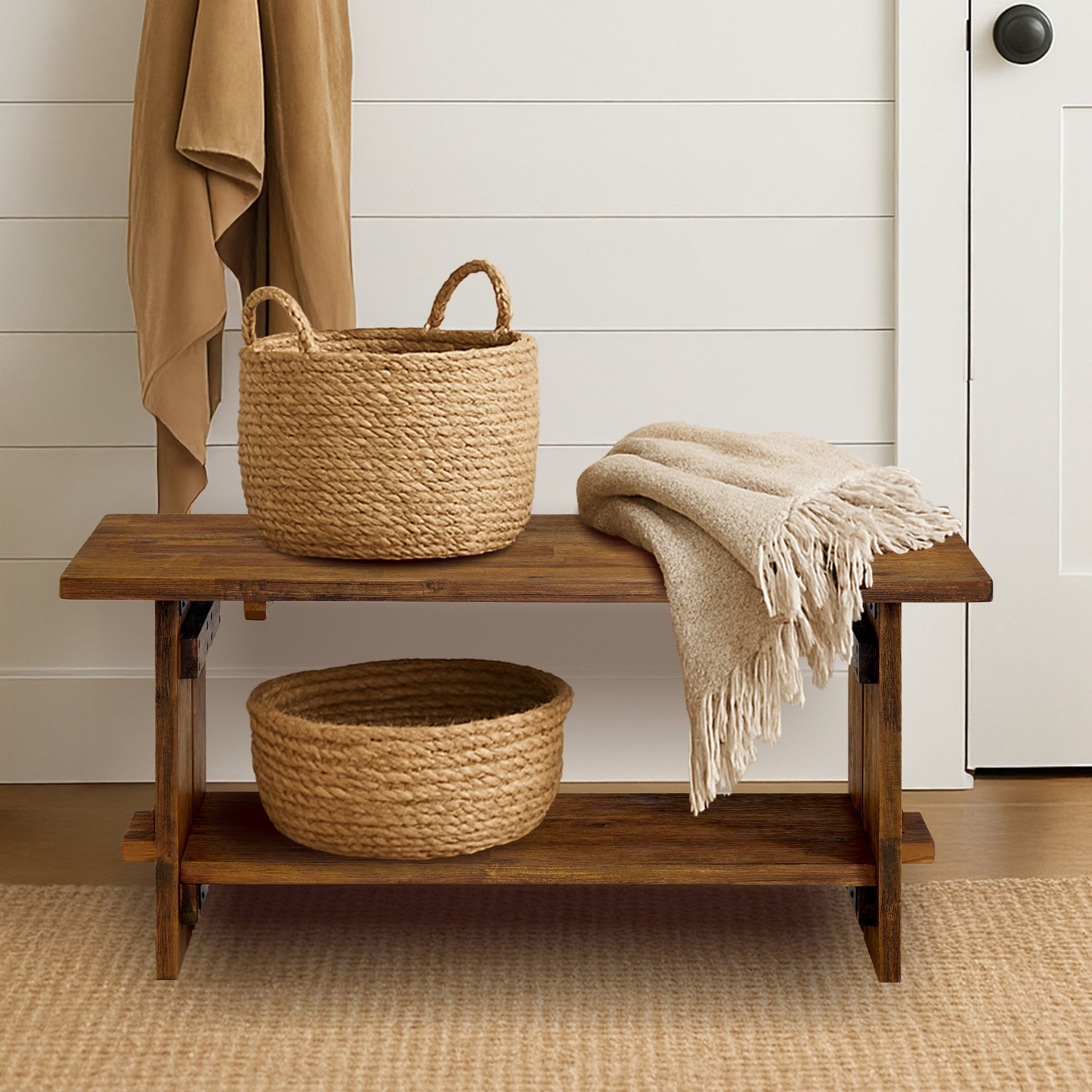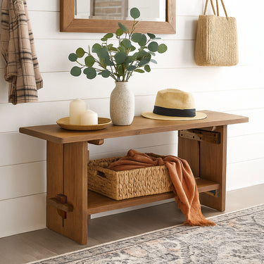 Organize your entryway, mudroom or living space with this gorgeous acacia wood bench. The bench is both beautiful and functional, providing ample storage and style for your home's entryway or hallway. This rustic bench has a minimalist look made from solid acacia wood. The natural aged stain highlights the subtle imperfections such as knots and cracks that are part of the wood's character. This versatile piece combines seating and storage into one, making it an ideal option for optimizing your space.