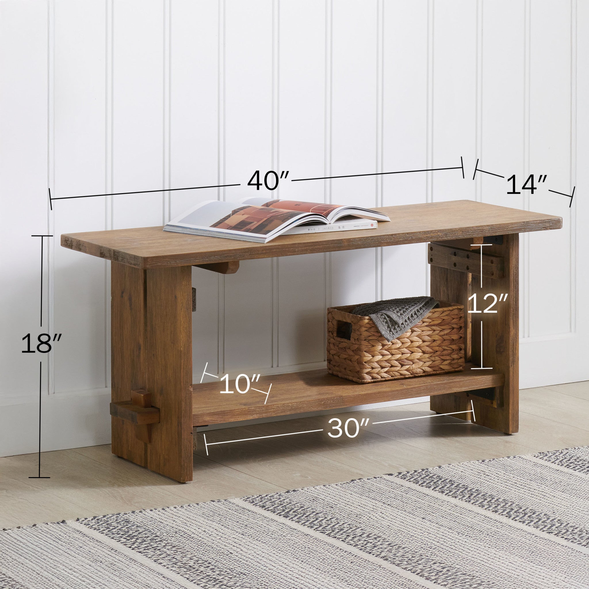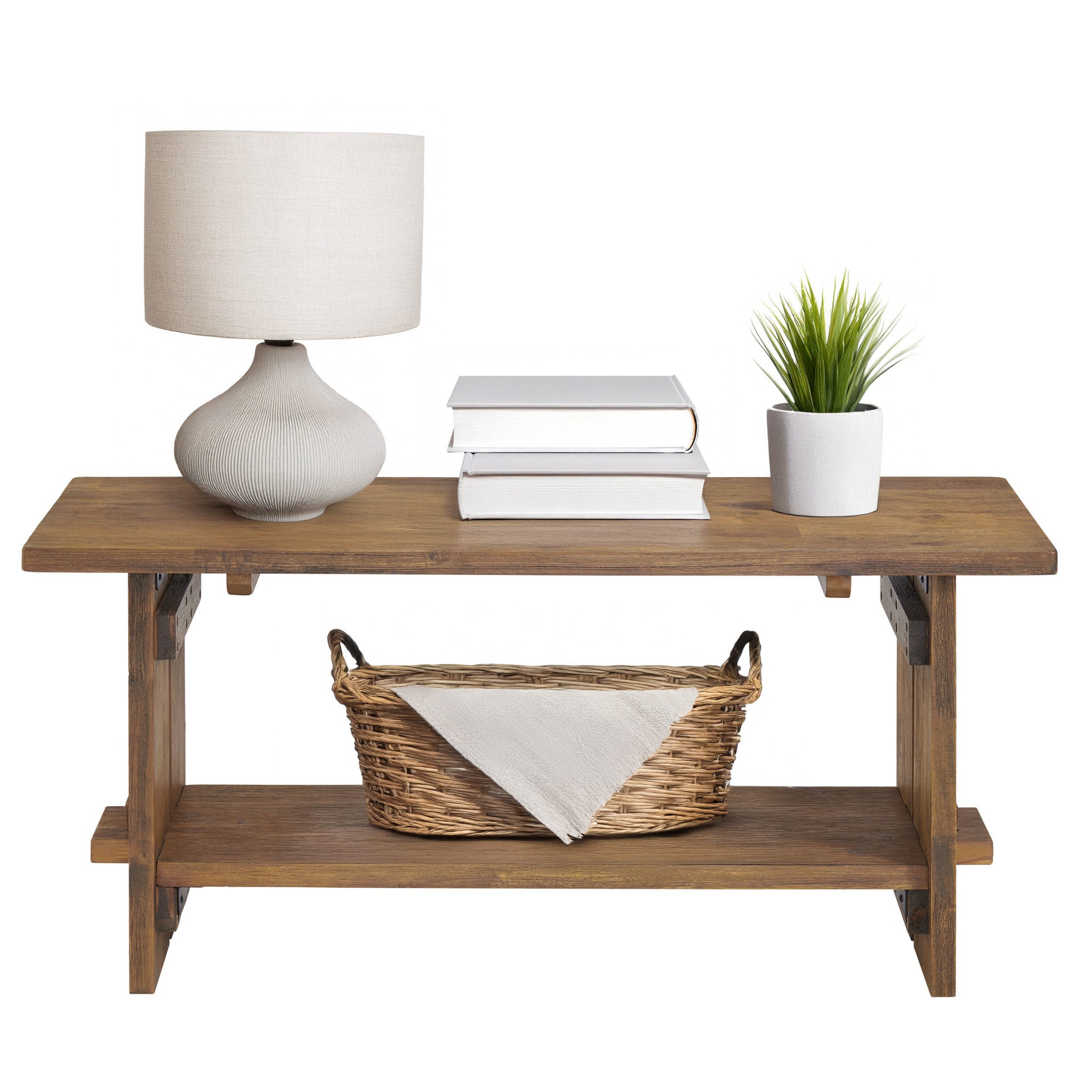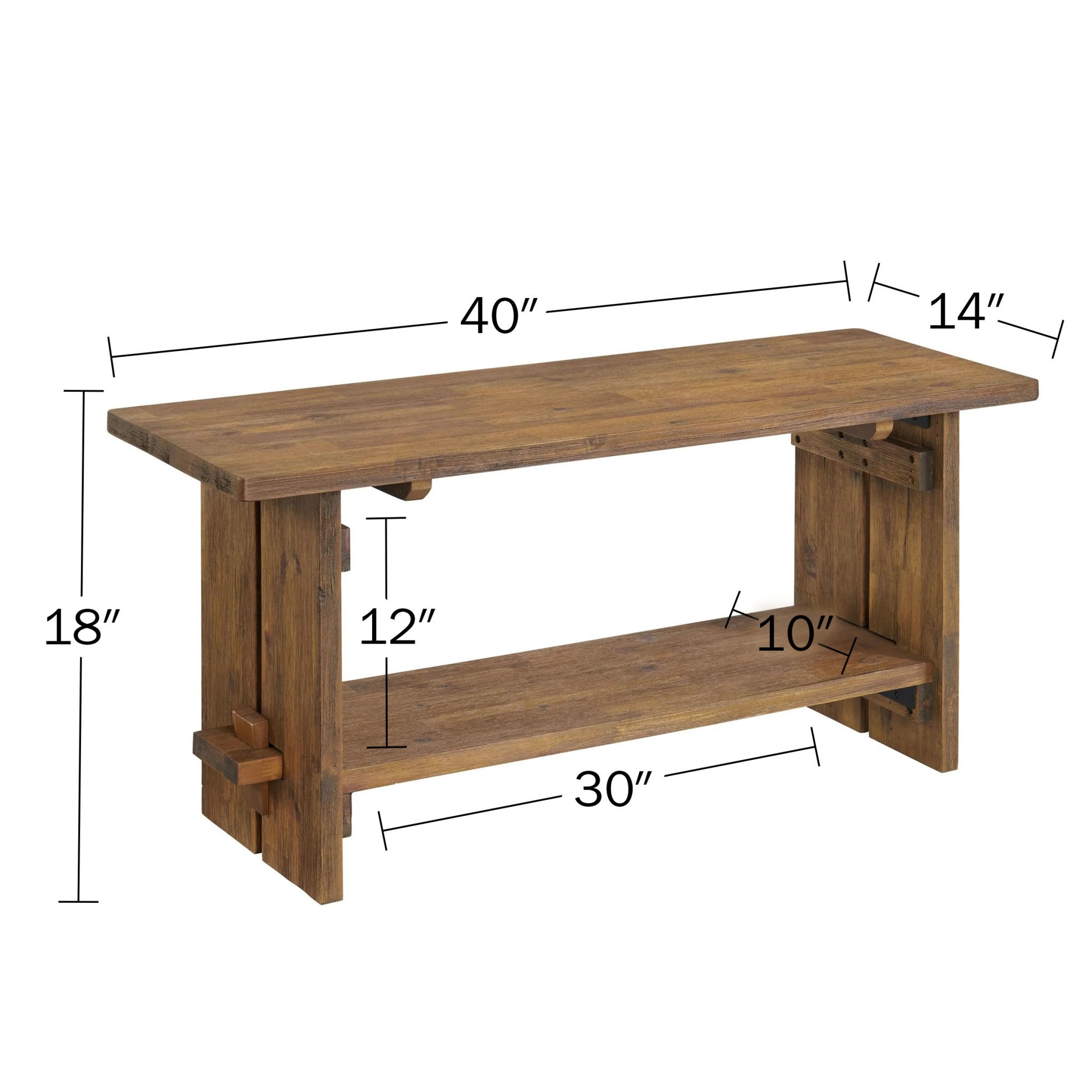 - PRODUCT DETAILS - Materials: Solid Acacia Wood. Overall Dimensions: (L) 40” x (W) 14” x (H) 18”, Lower Shelf: (L) 30” x (W) 10” x (H) 12”. Weight Capacity: 300lbs. Color: Natural Aged Brown.